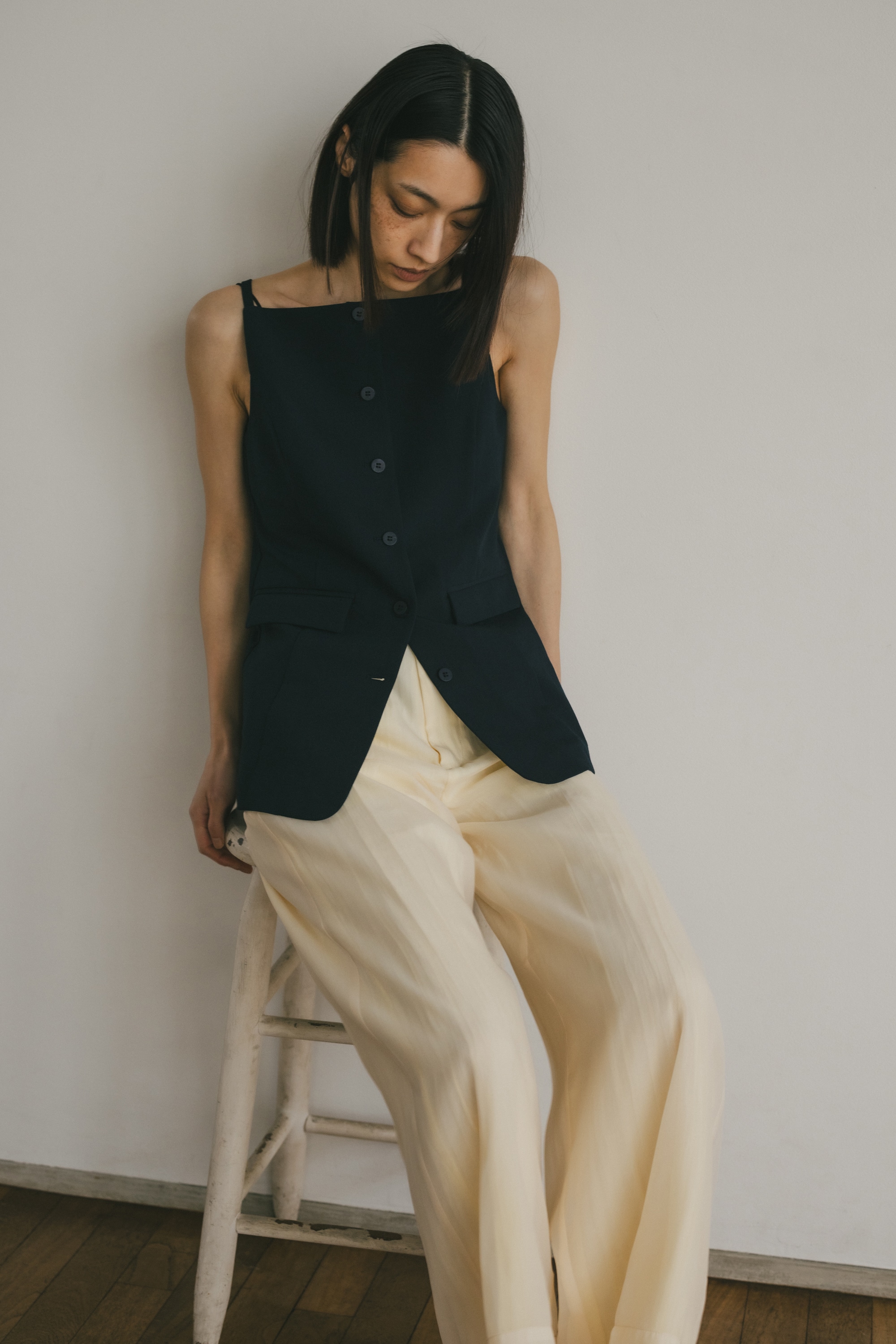 ストンと落ちるワイドストレートシルエットと裾にかけてのセンタープレスがデザインポイント。