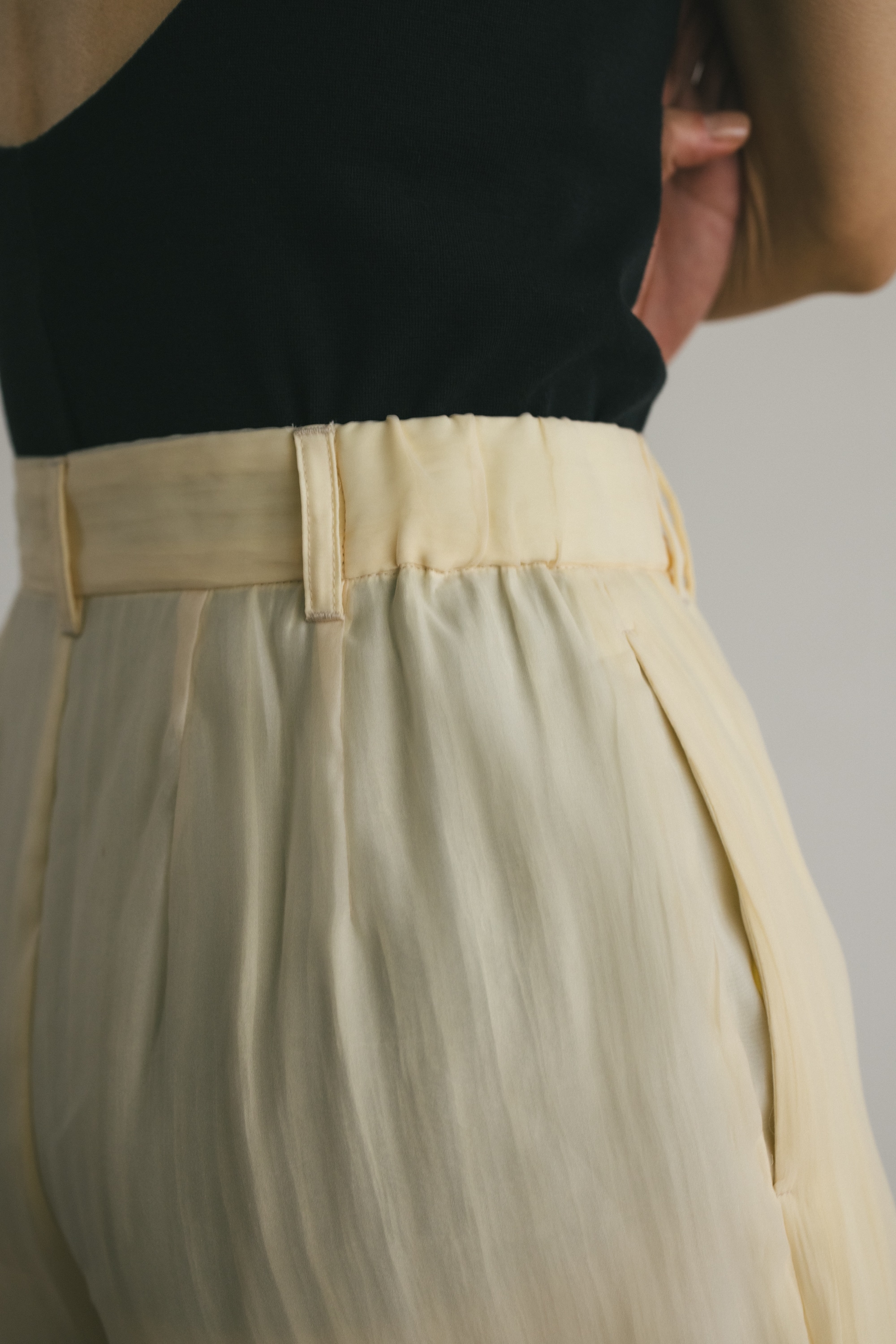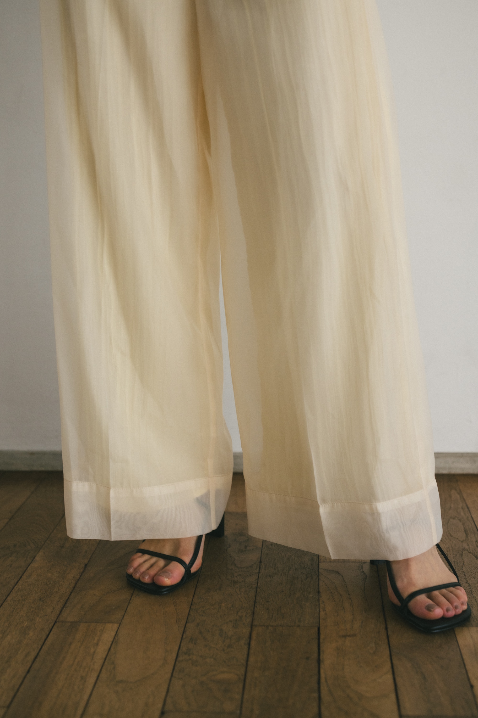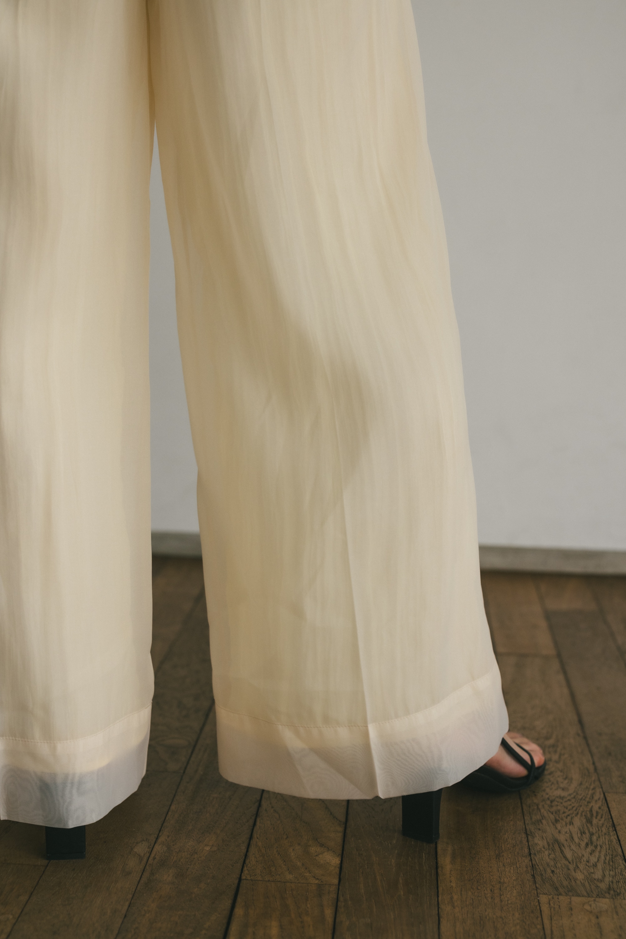 サッシャーサテン生地とオーガンジー生地の2枚仕立てで仕上げた抜け感が可愛いシアーパンツ。
