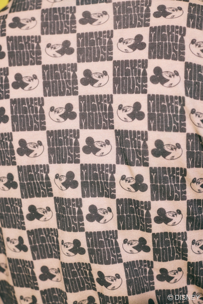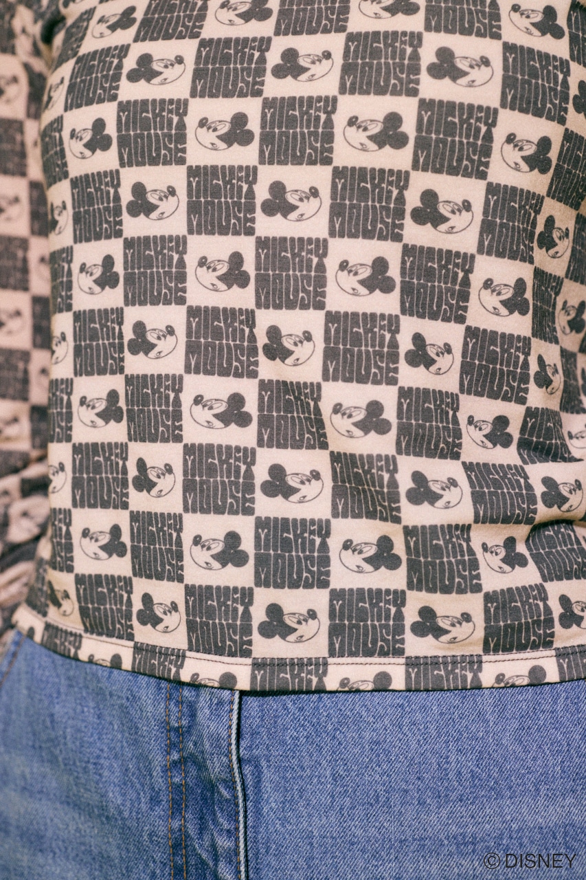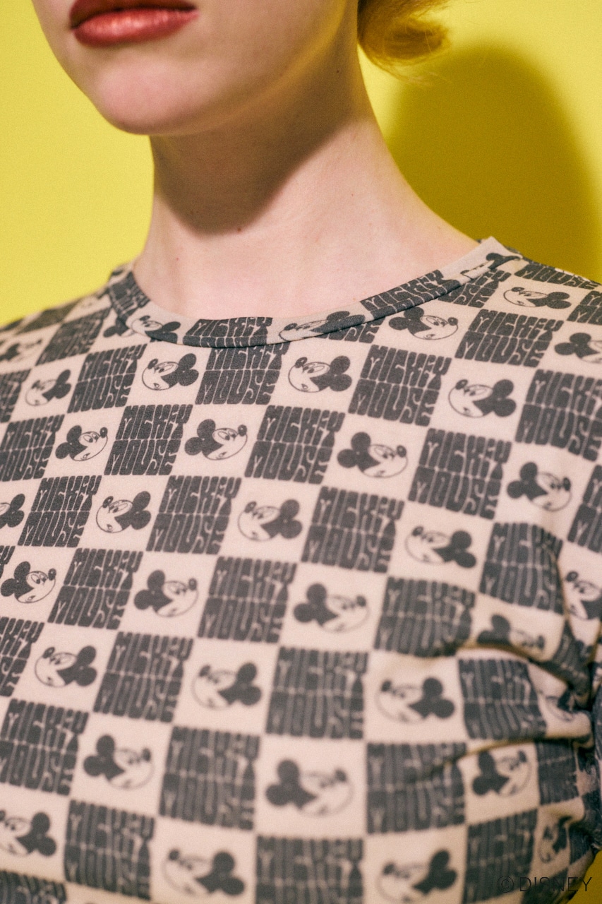 一見チェッカー柄に見えるように、MICKEY MOUSEの文字とミッキーの顔を並べたオリジナル柄のシアーカットトップス。