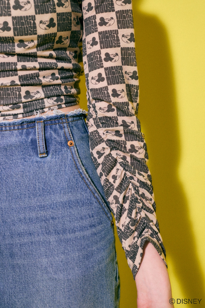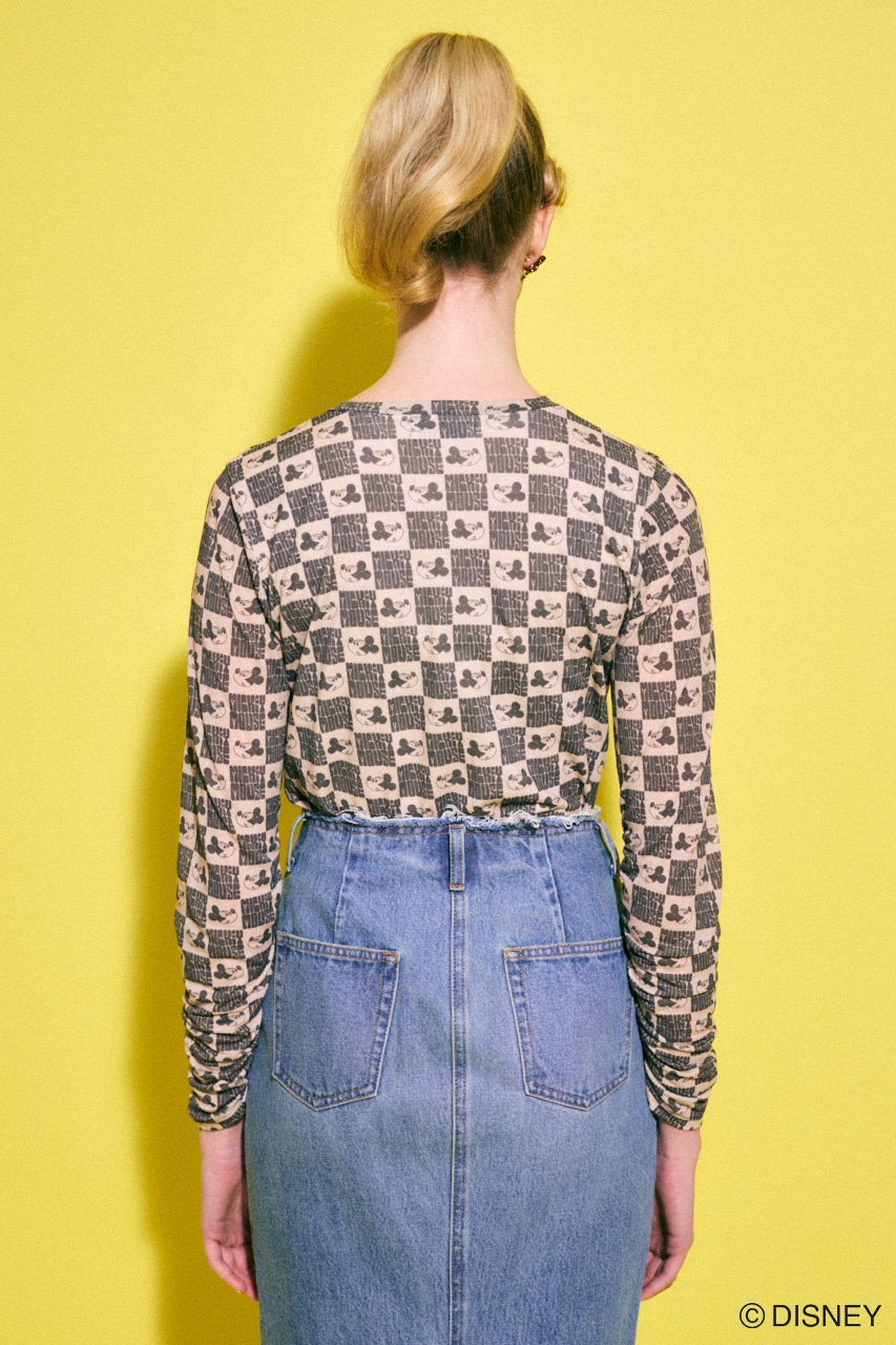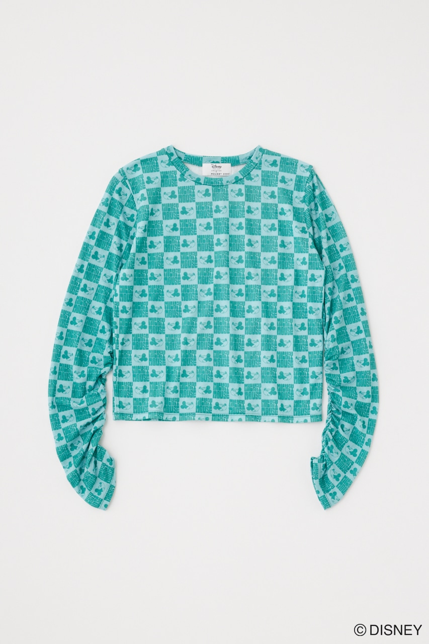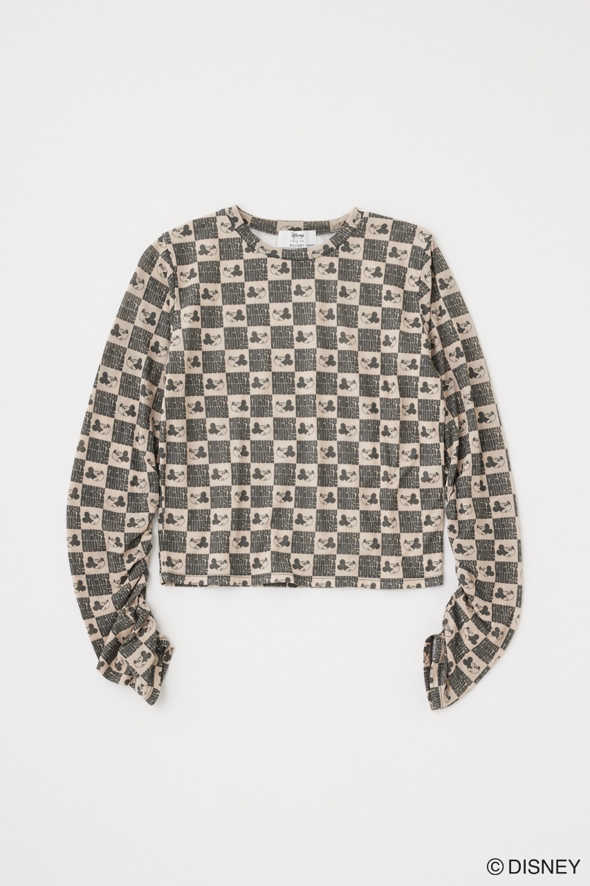 一見チェッカー柄に見えるように、MICKEY MOUSEの文字とミッキーの顔を並べたオリジナル柄のシアーカットトップス。