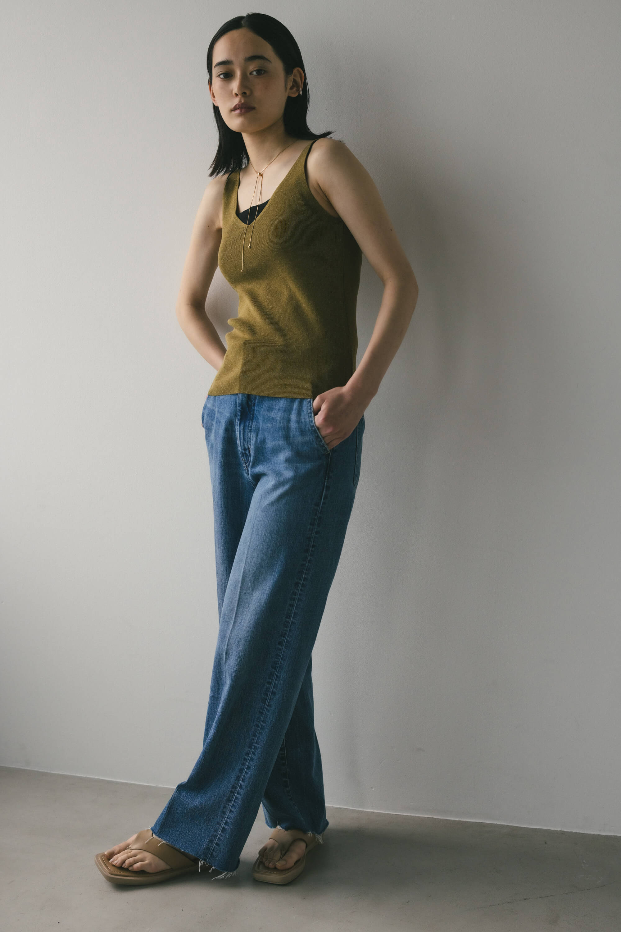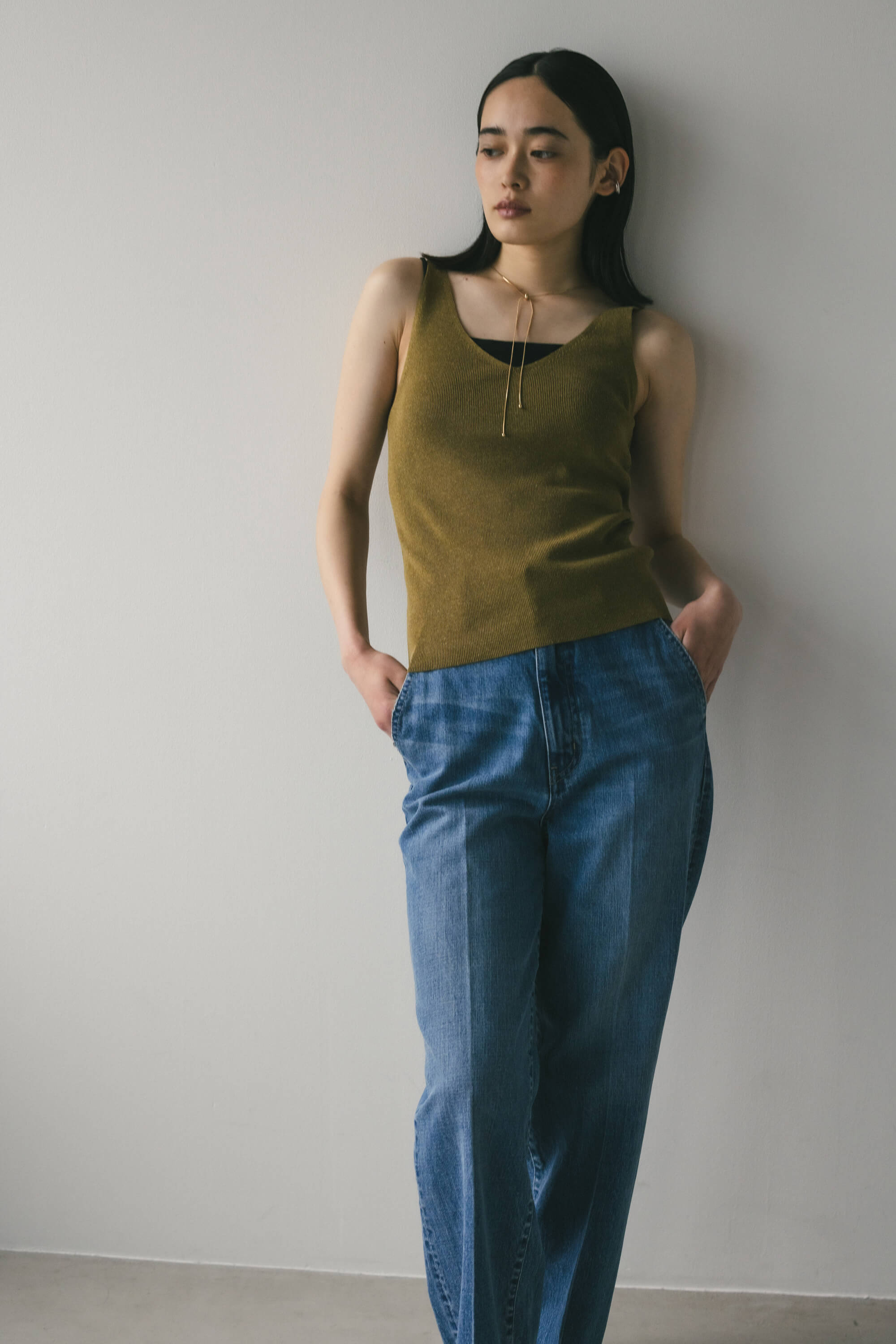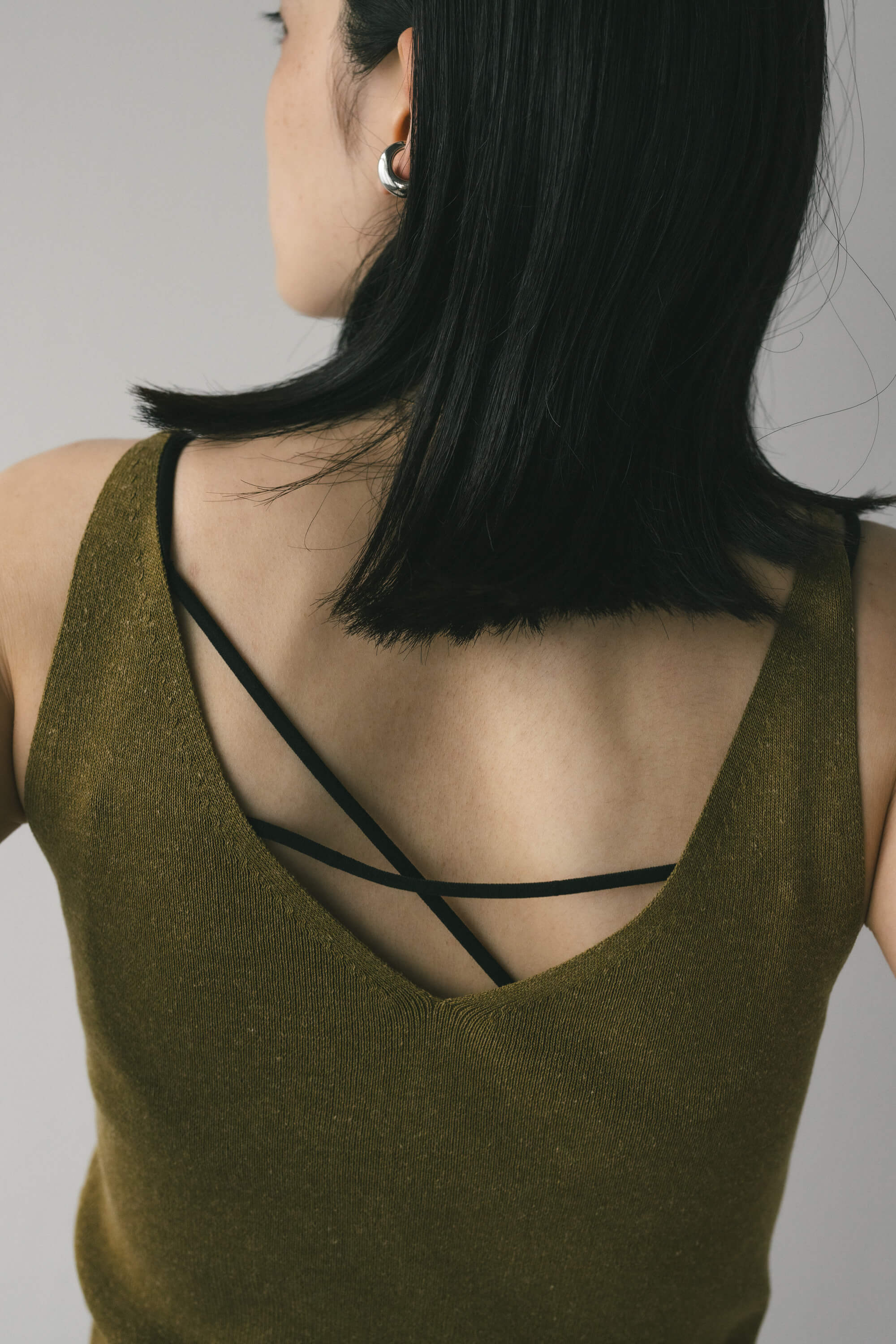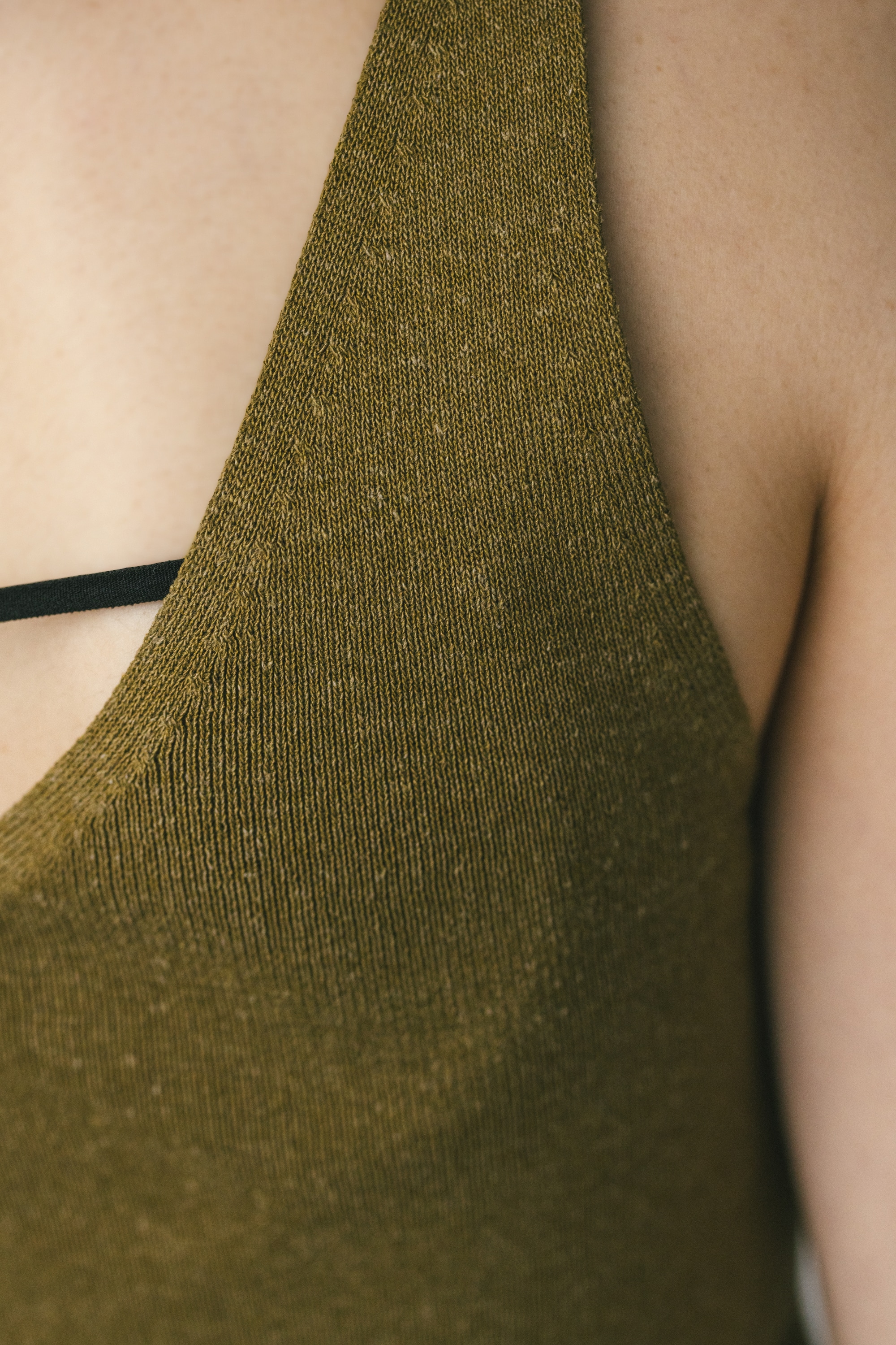 デコルテ、ボディーラインを綺麗に見せるためのシルエットとカッティングにこだわったリラックス感のあるリネン混ニット。