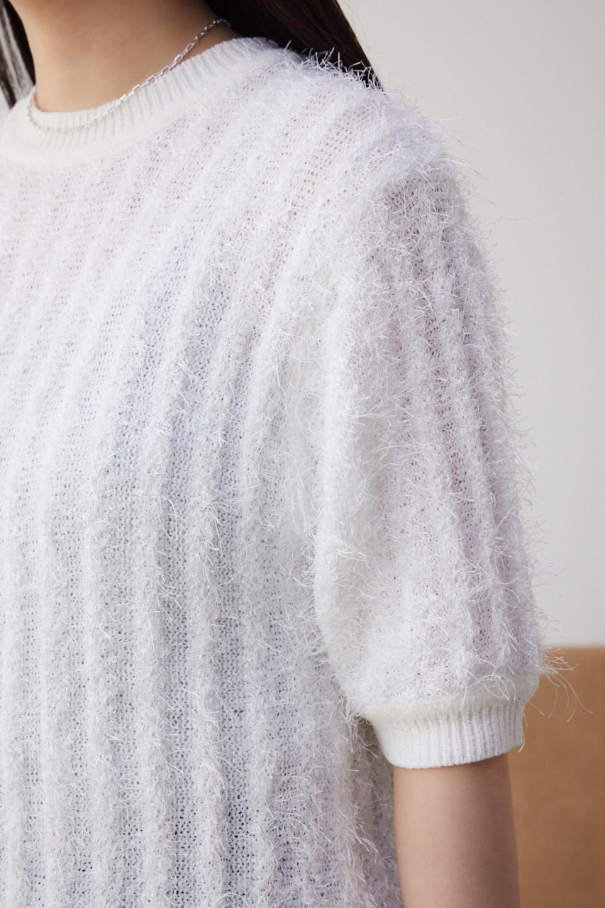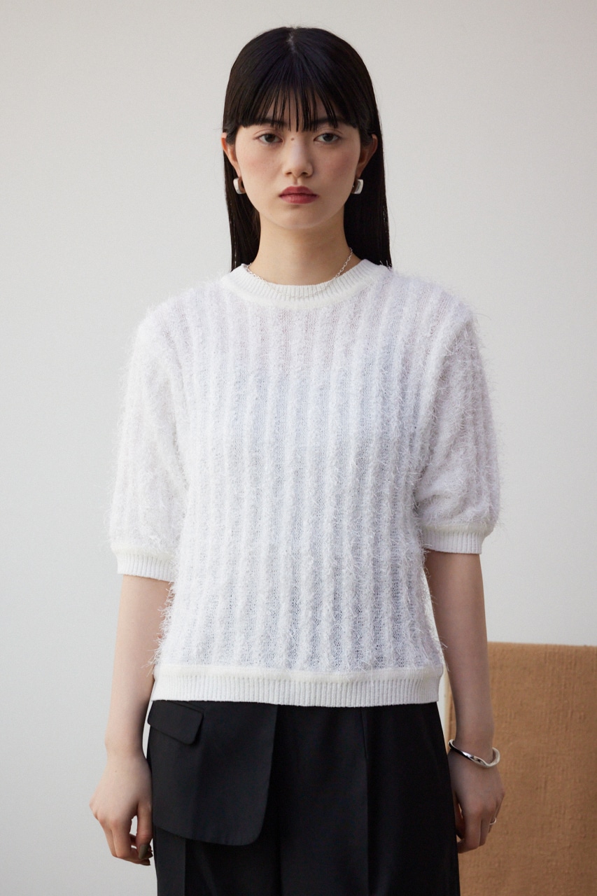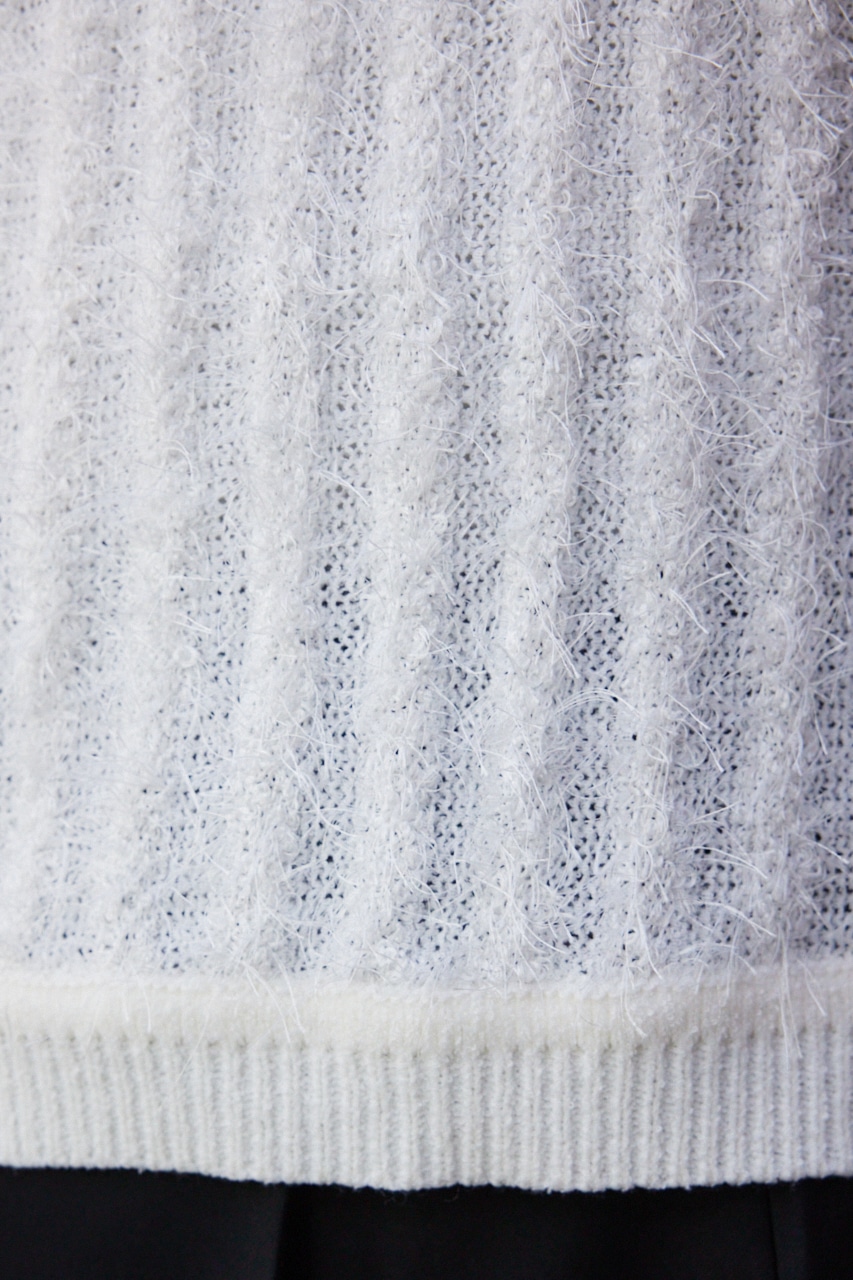 ・テープヤーンとフェザーヤーンを引き揃えて、天竺の裏目を使用してストライプ見えになる様に編み立てています。・柔らかい風合いも特徴です。