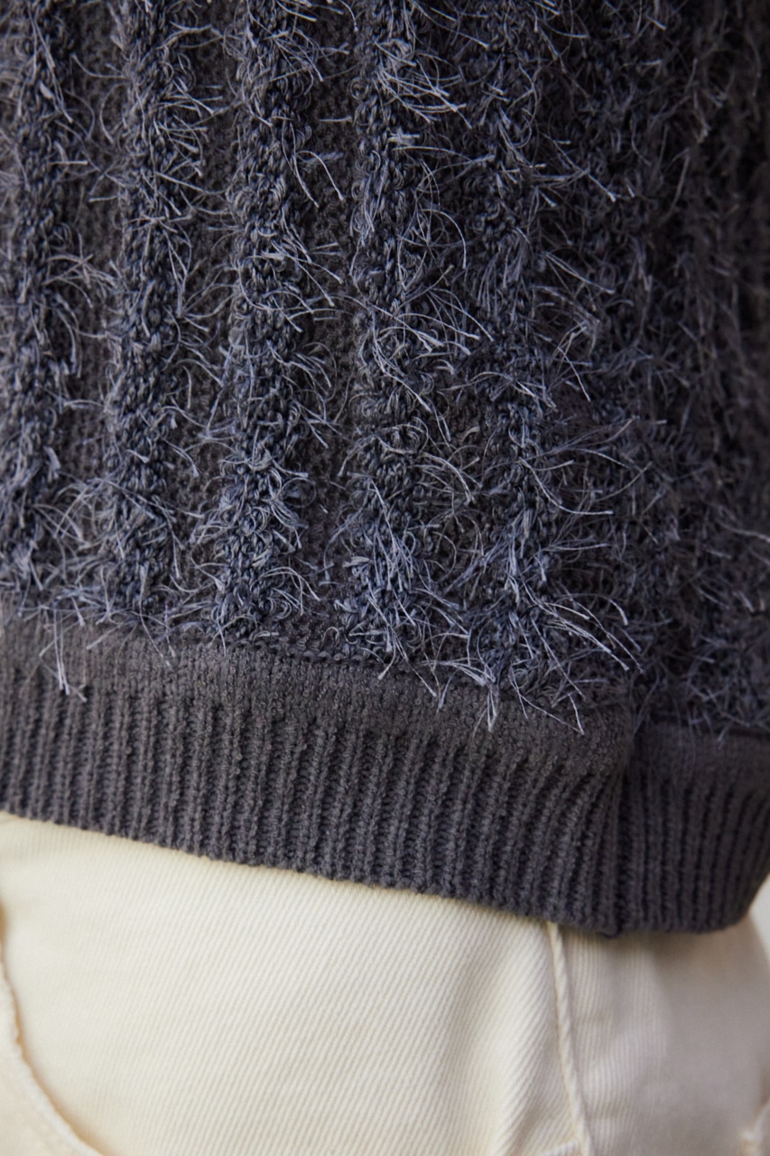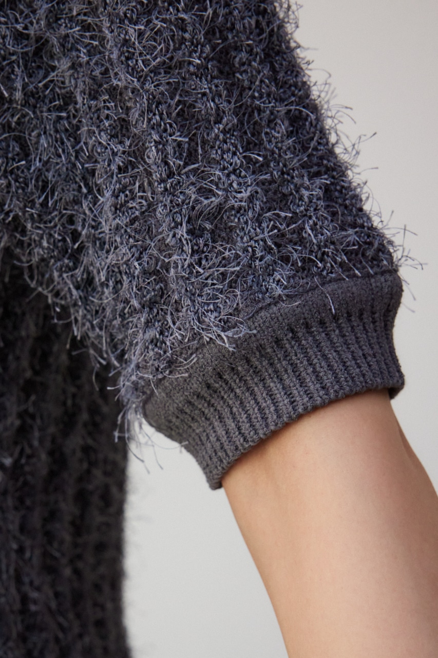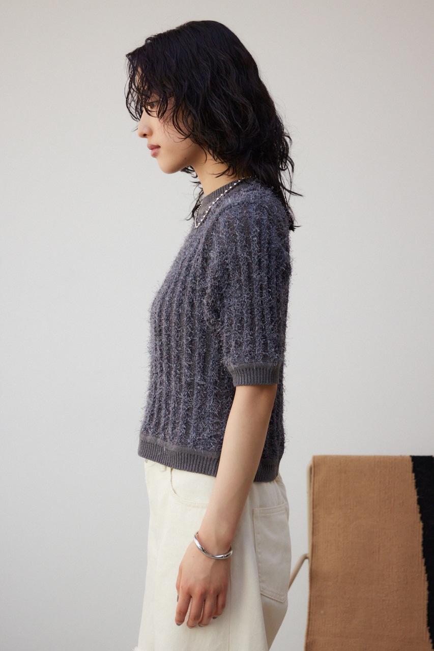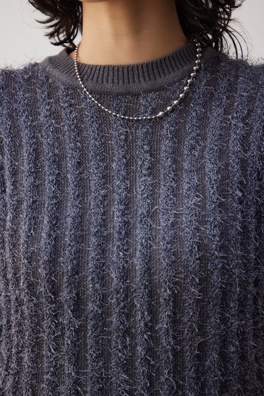 ・テープヤーンとフェザーヤーンを引き揃えて、天竺の裏目を使用してストライプ見えになる様に編み立てています。・柔らかい風合いも特徴です。