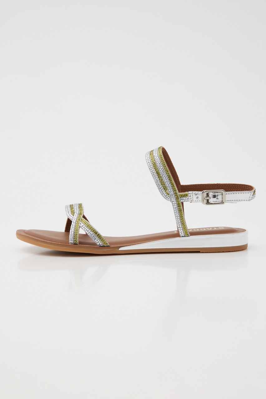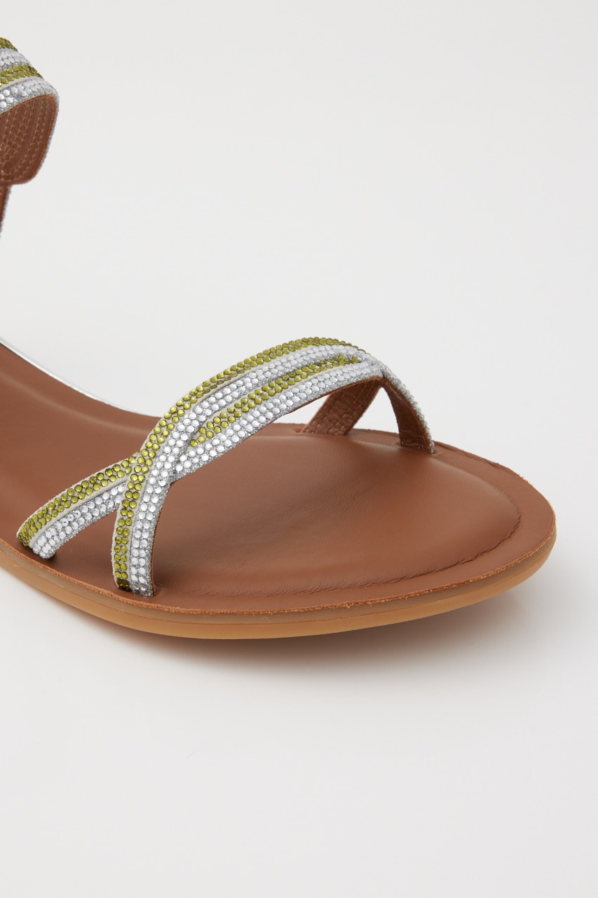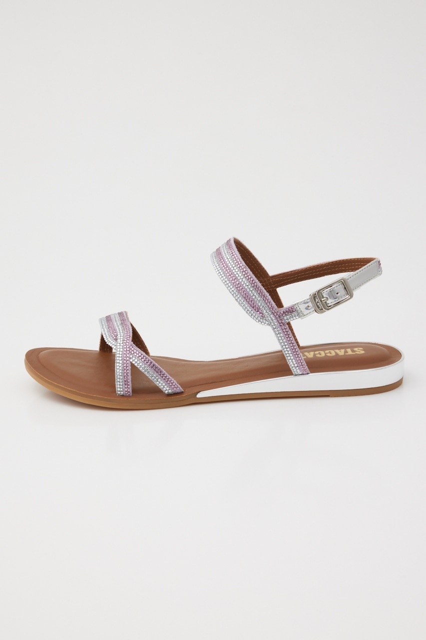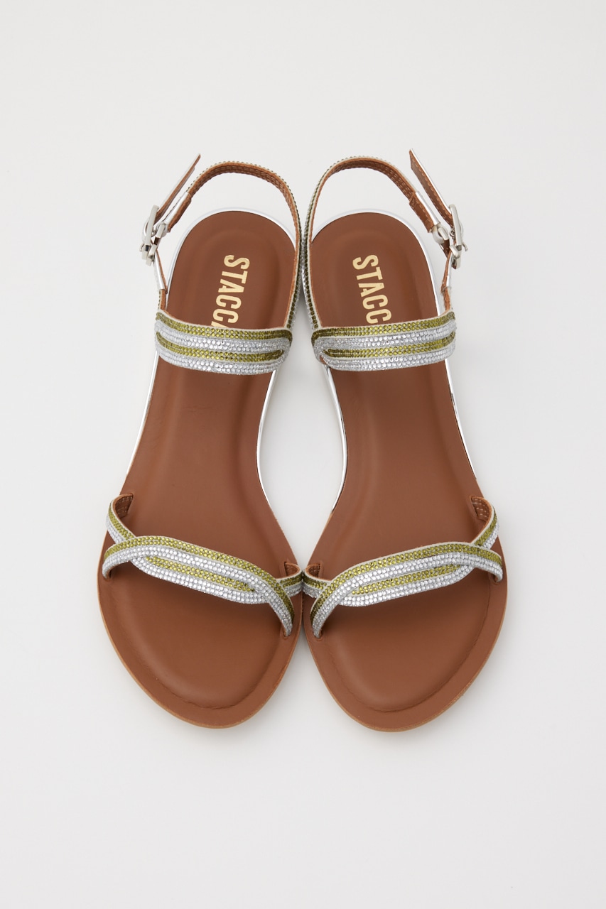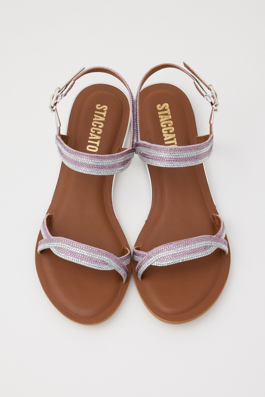 ”HAPPY”な気分に上げてくれるオリエンタルなムード漂うフラットサンダル。ツイストされた華奢なベルトに極小のカラーストーンをデザインした、真夏の足元を彩る1足。低反発のクッション入りで屈曲も良く跳ねるように軽やかに履いていただけます。