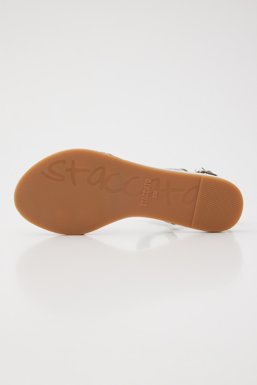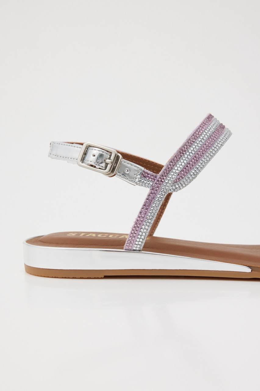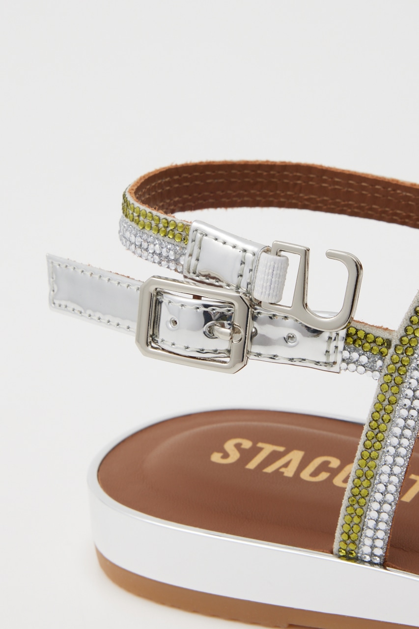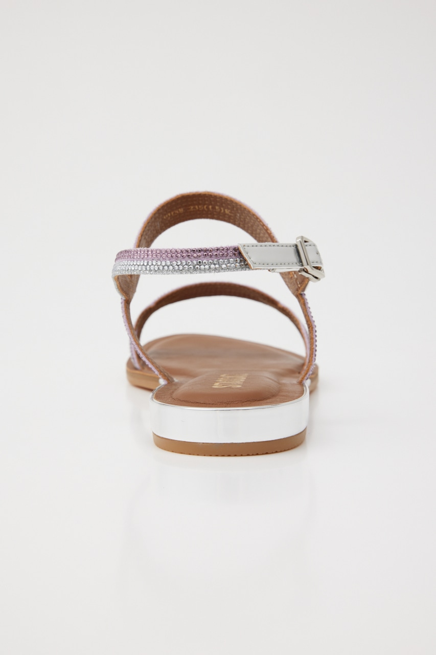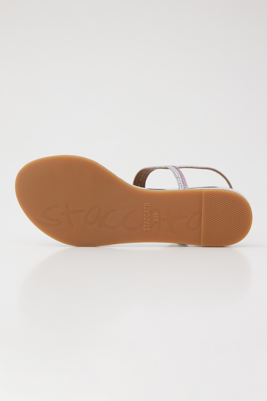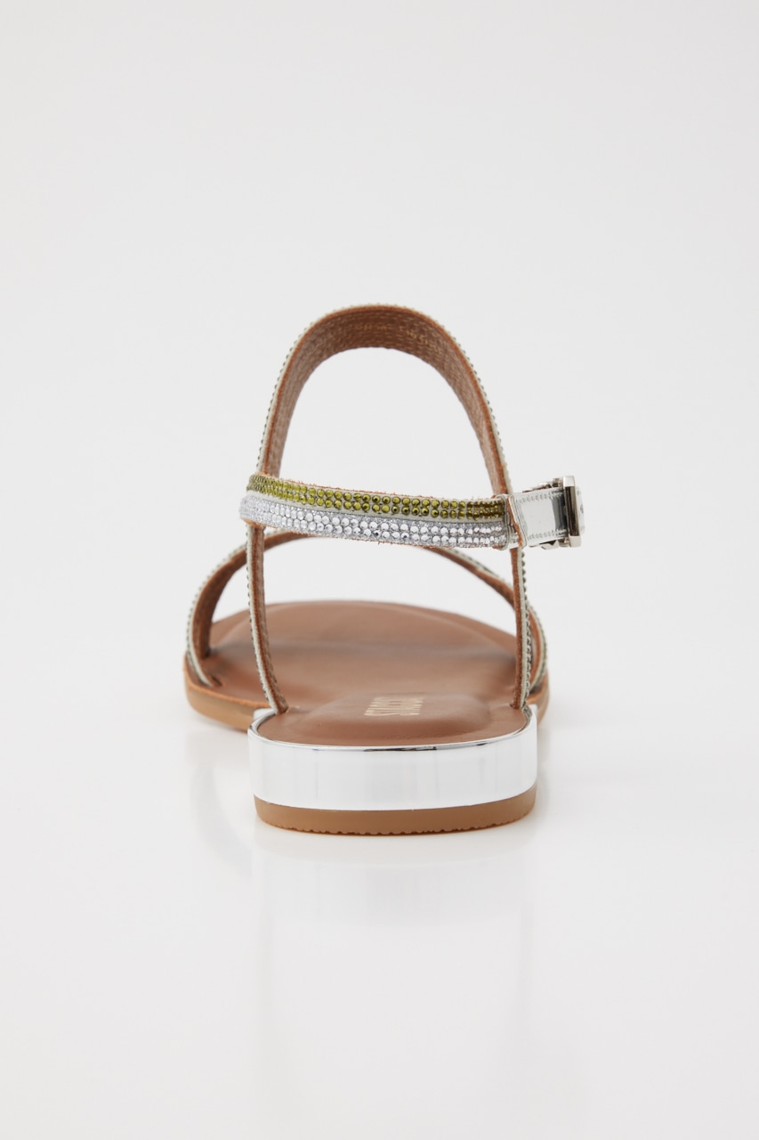 ”HAPPY”な気分に上げてくれるオリエンタルなムード漂うフラットサンダル。ツイストされた華奢なベルトに極小のカラーストーンをデザインした、真夏の足元を彩る1足。低反発のクッション入りで屈曲も良く跳ねるように軽やかに履いていただけます。