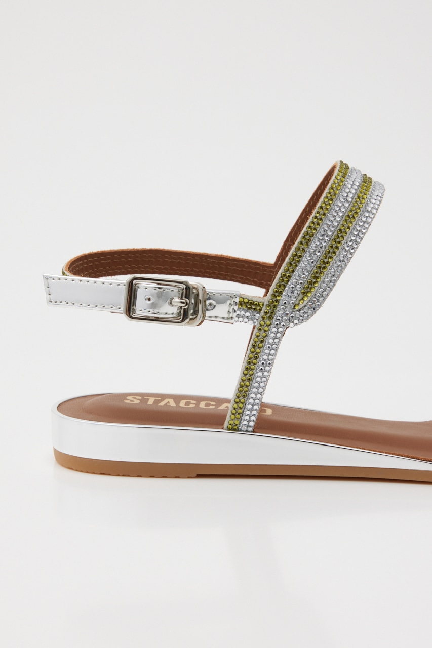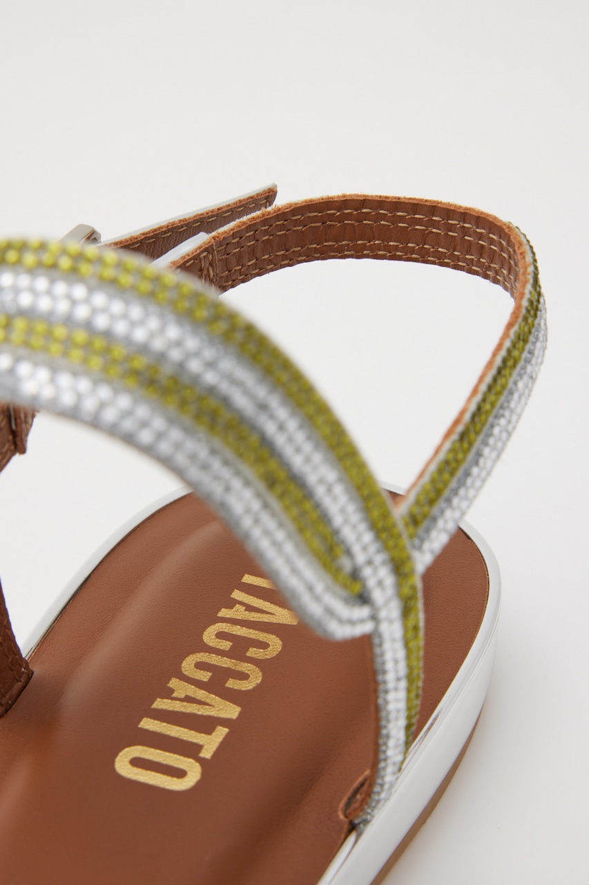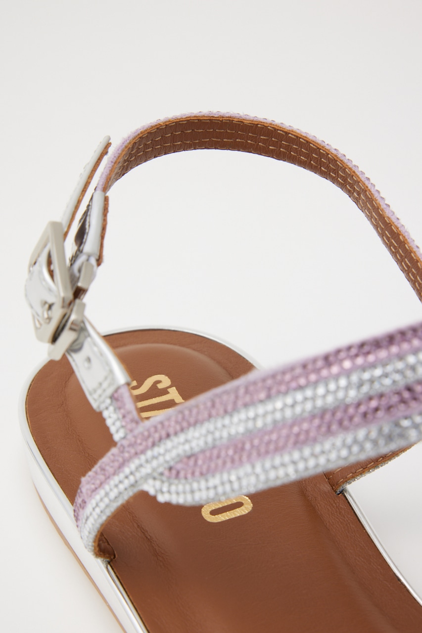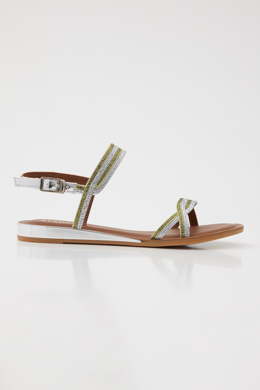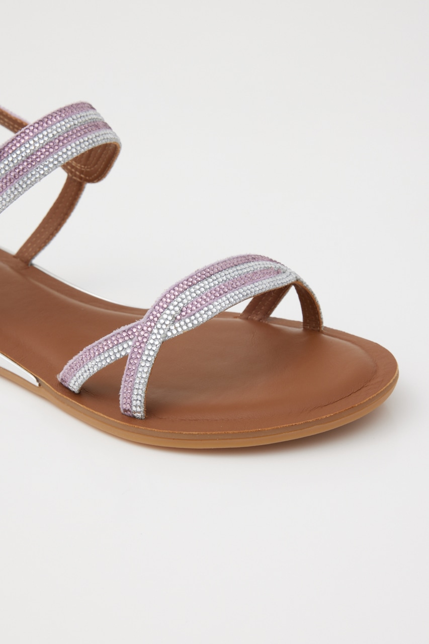 ”HAPPY”な気分に上げてくれるオリエンタルなムード漂うフラットサンダル。ツイストされた華奢なベルトに極小のカラーストーンをデザインした、真夏の足元を彩る1足。低反発のクッション入りで屈曲も良く跳ねるように軽やかに履いていただけます。