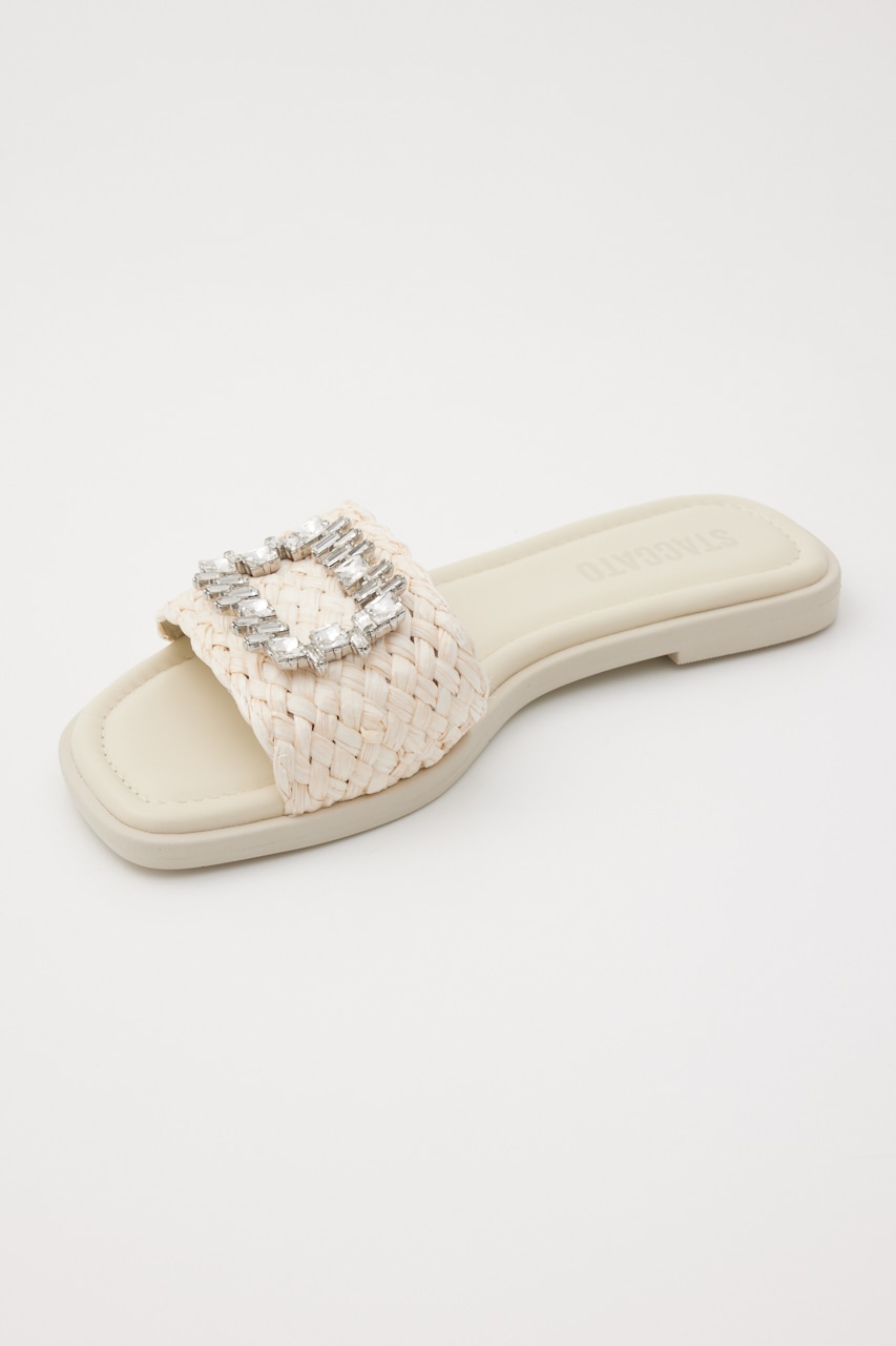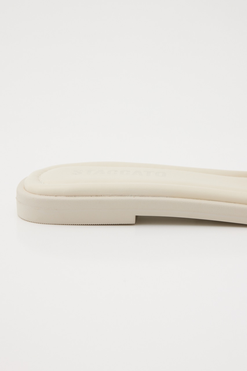 夏気分が上がる、パステルカラーのフラットサンダル。涼し気な雰囲気のラフィア調のイントレチャートに幾何学なデザインバックルが、ラフ&ルーズになりがちなフラットサンダルを華やか&カジュアル感をおさえてくれます。また、軽量かつクッション性も◎