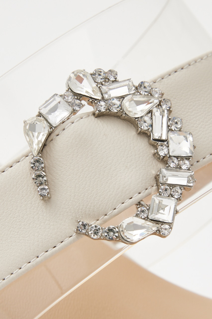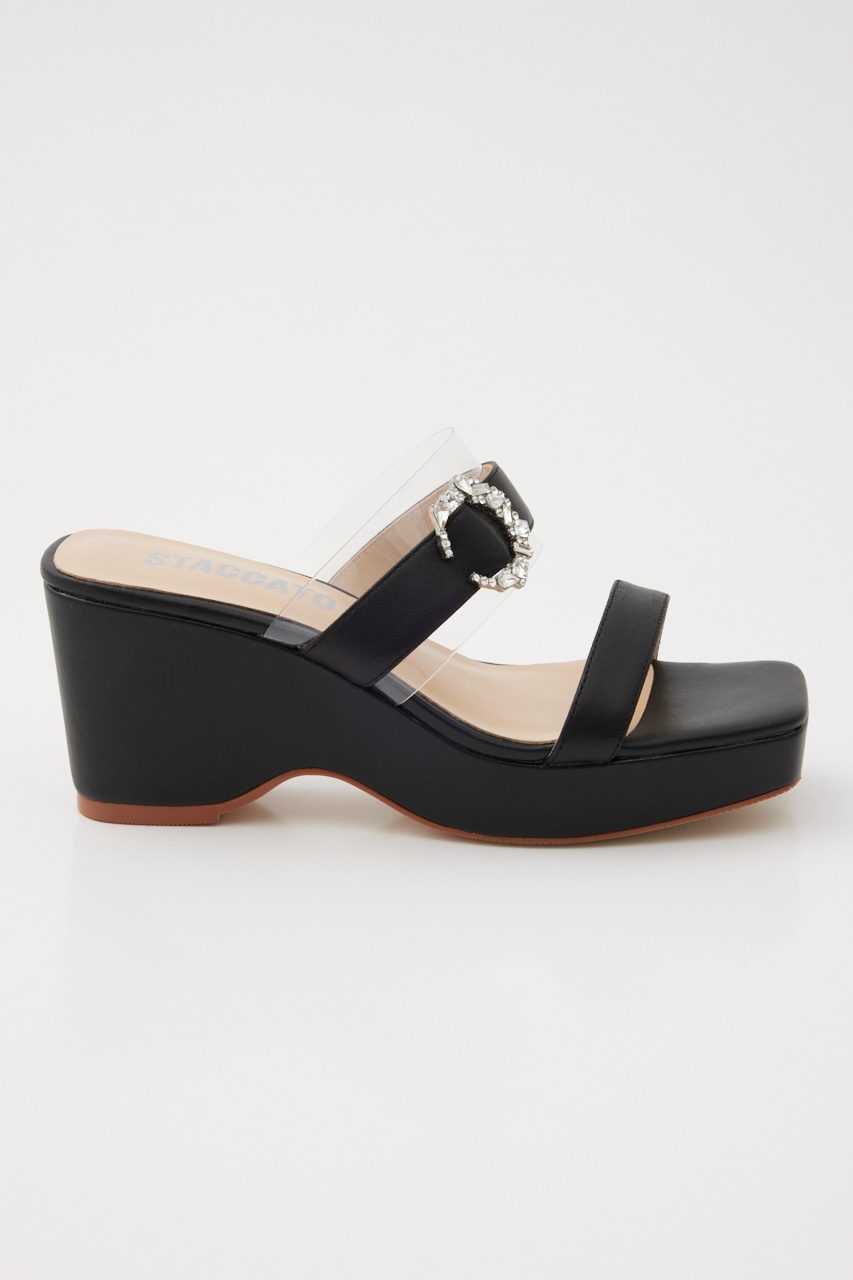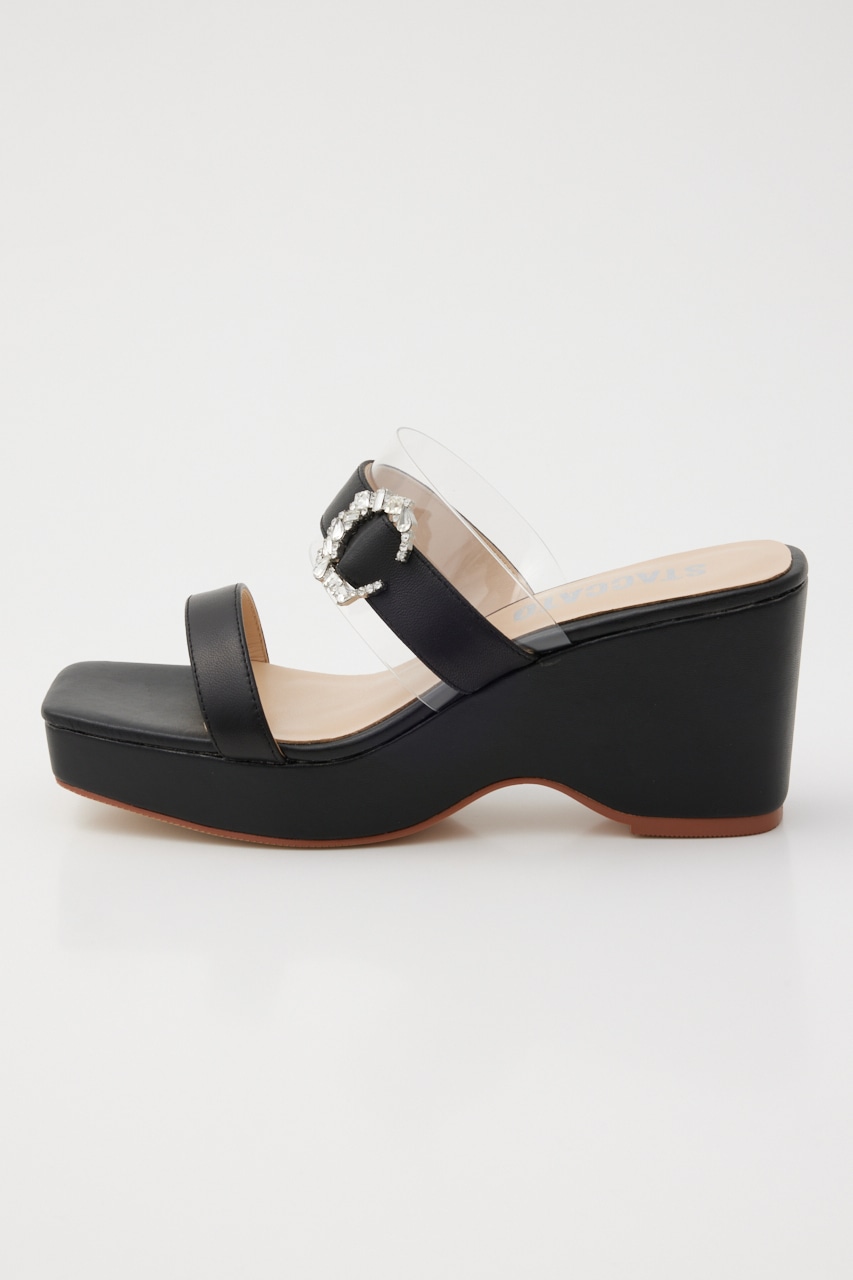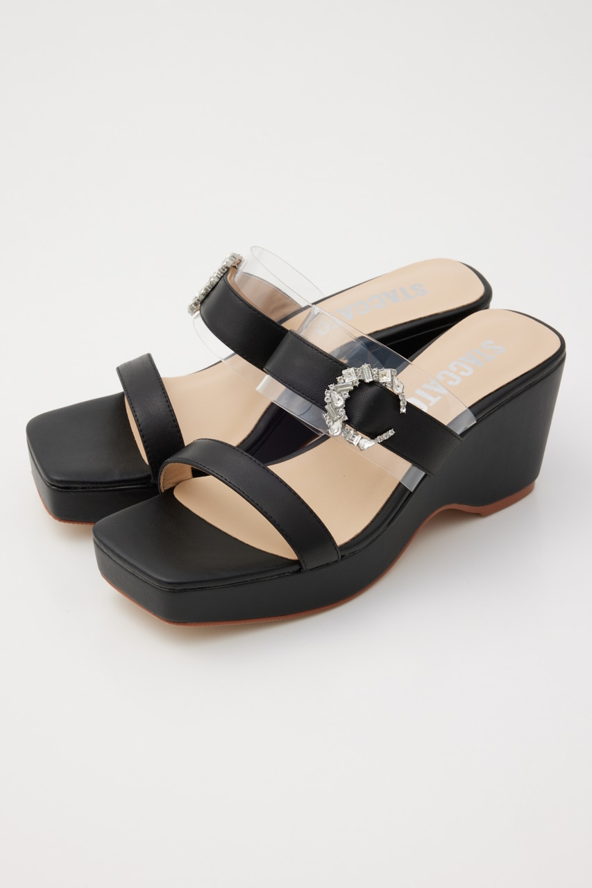デイリーシーンからバカンスにも大活躍する、子供っぽすぎないアーバンな雰囲気のウエッジソールサンダル。スクエアのフォルムに甲ベルト部分にはPVC上に人気のムーン型ビジューバックル装飾。さりげない小ぶりのバックルが品格も漂います。ウエッジソールながらストームが3.0cmあるので高低差も感じにくいです。