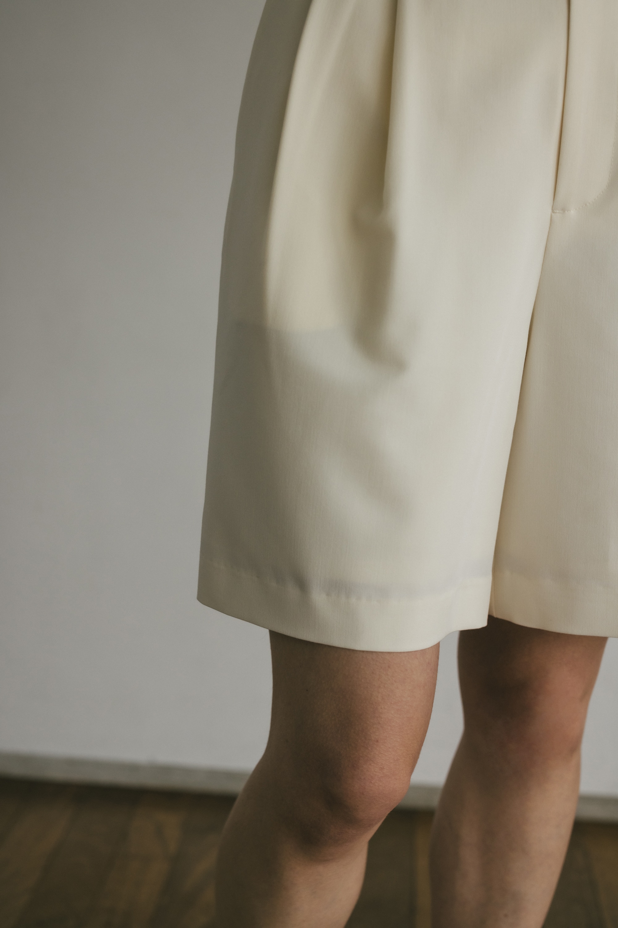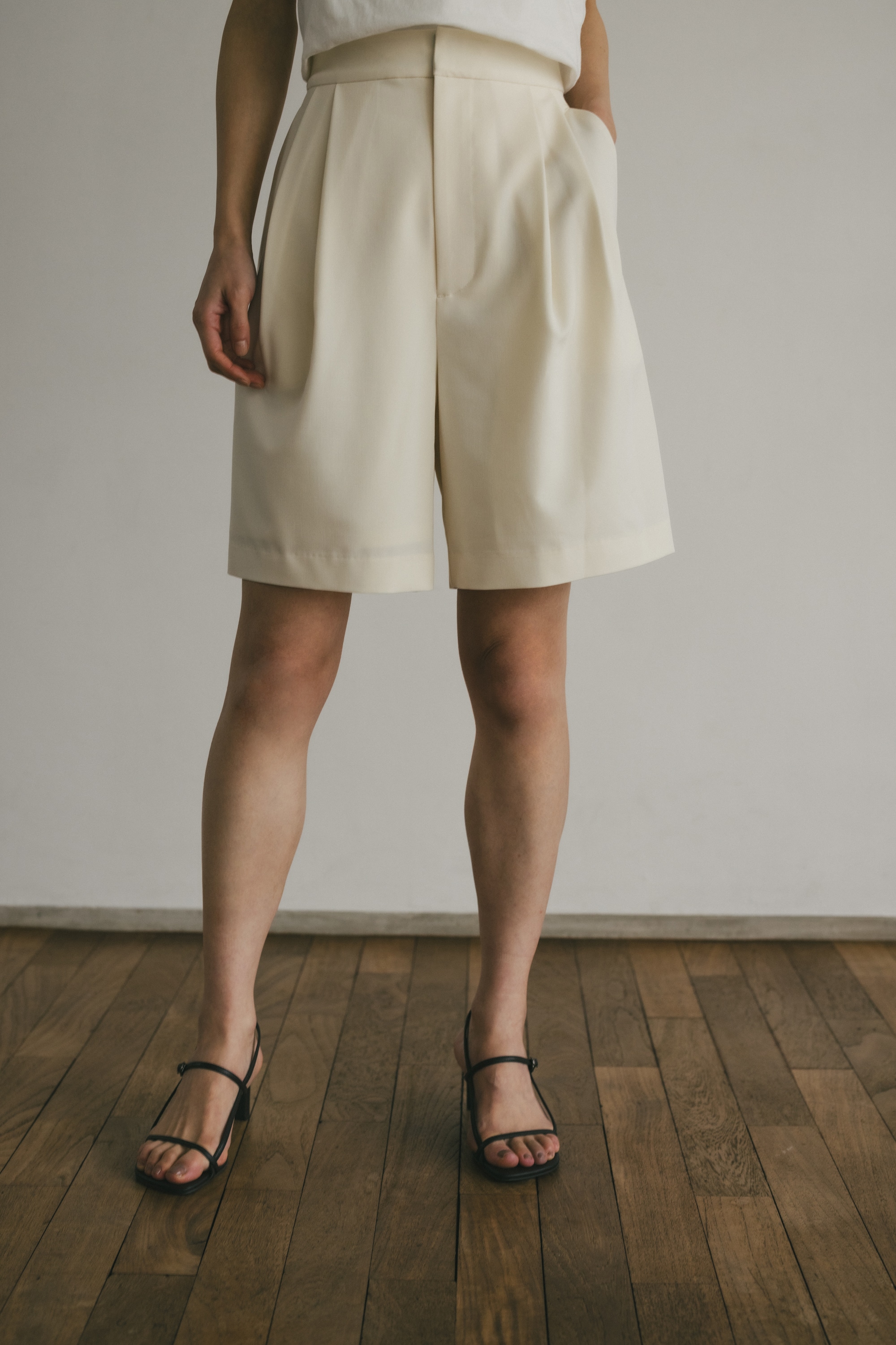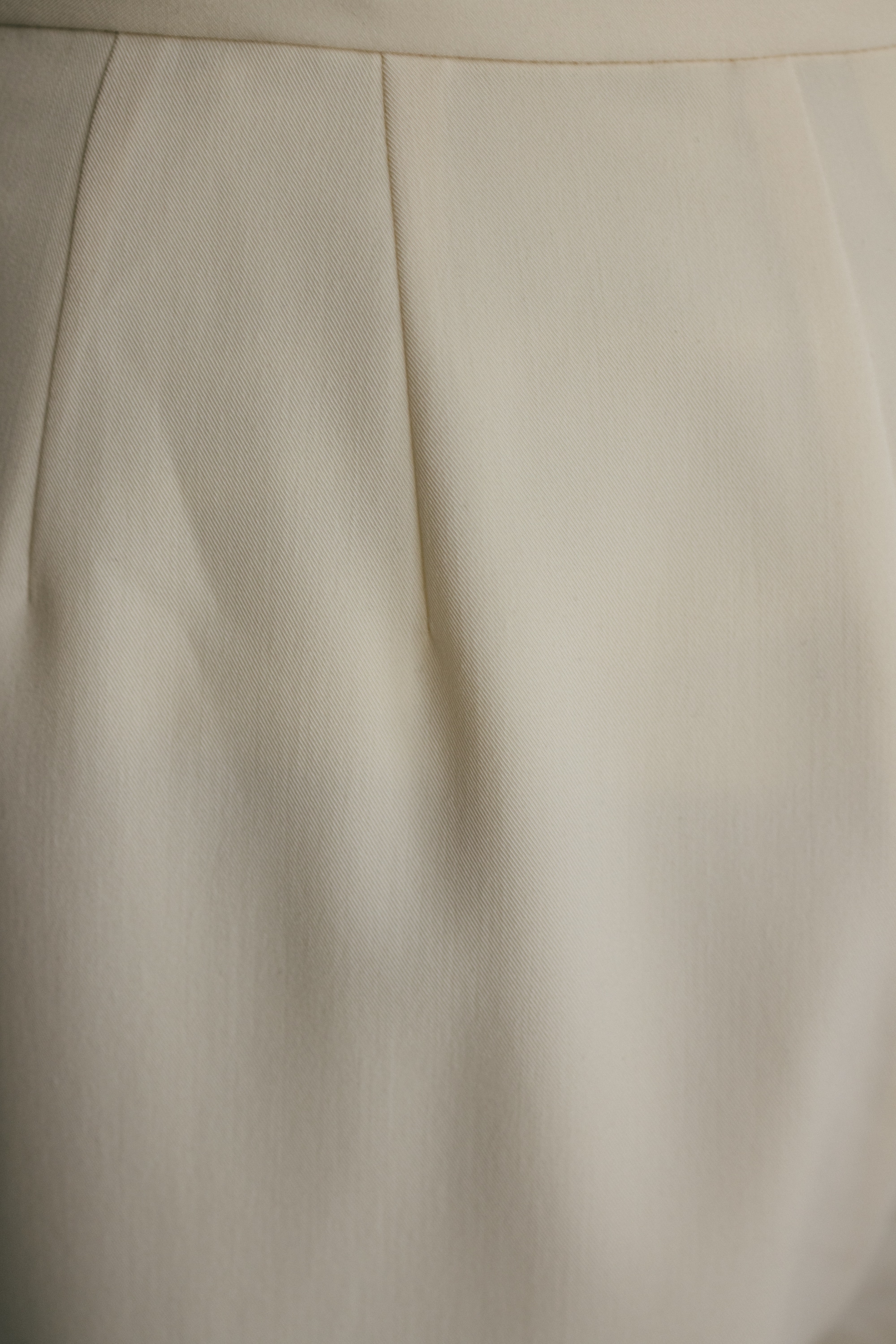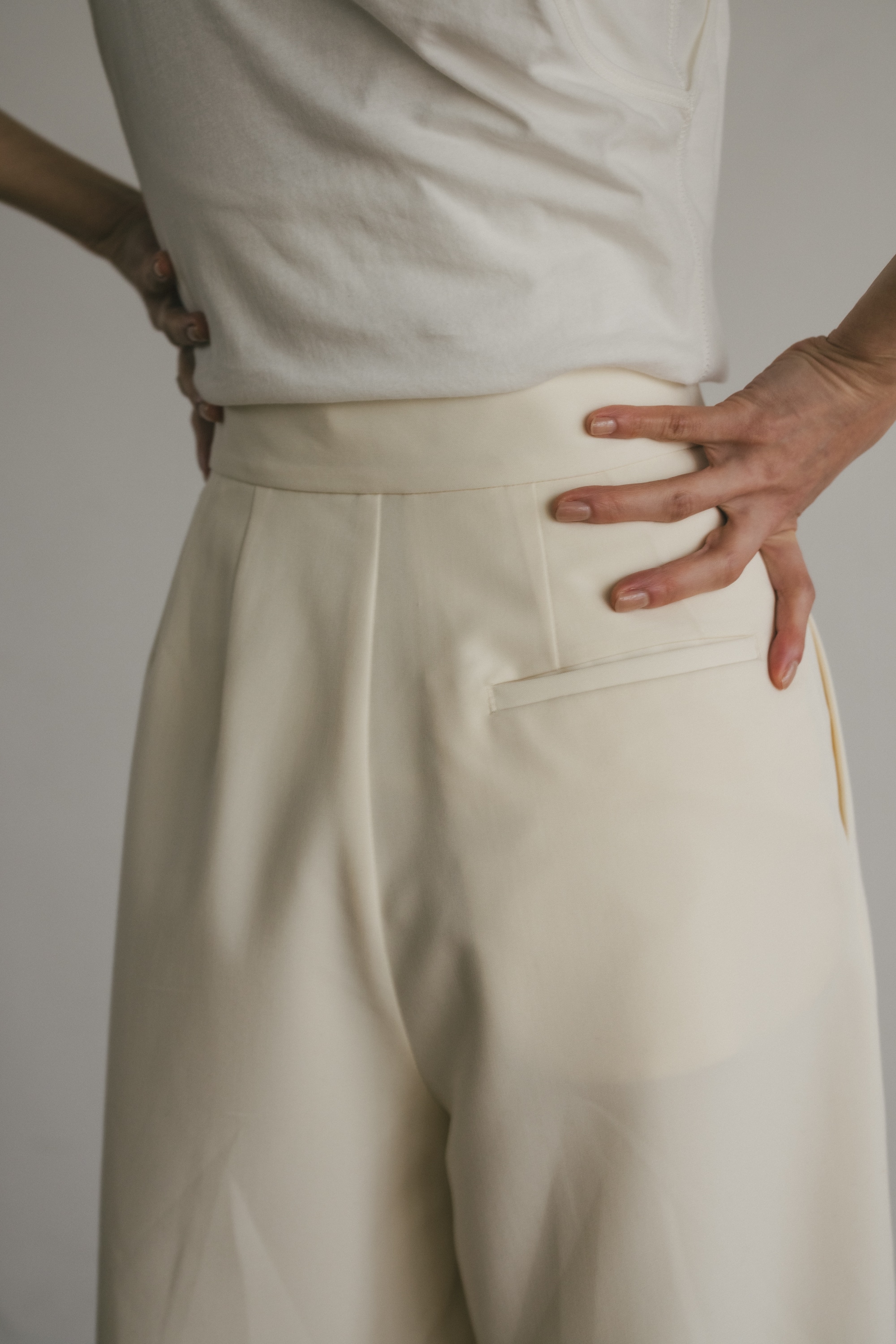 ゆとりのある裾幅とタックが身体のラインを拾わず美脚見えに導きます。