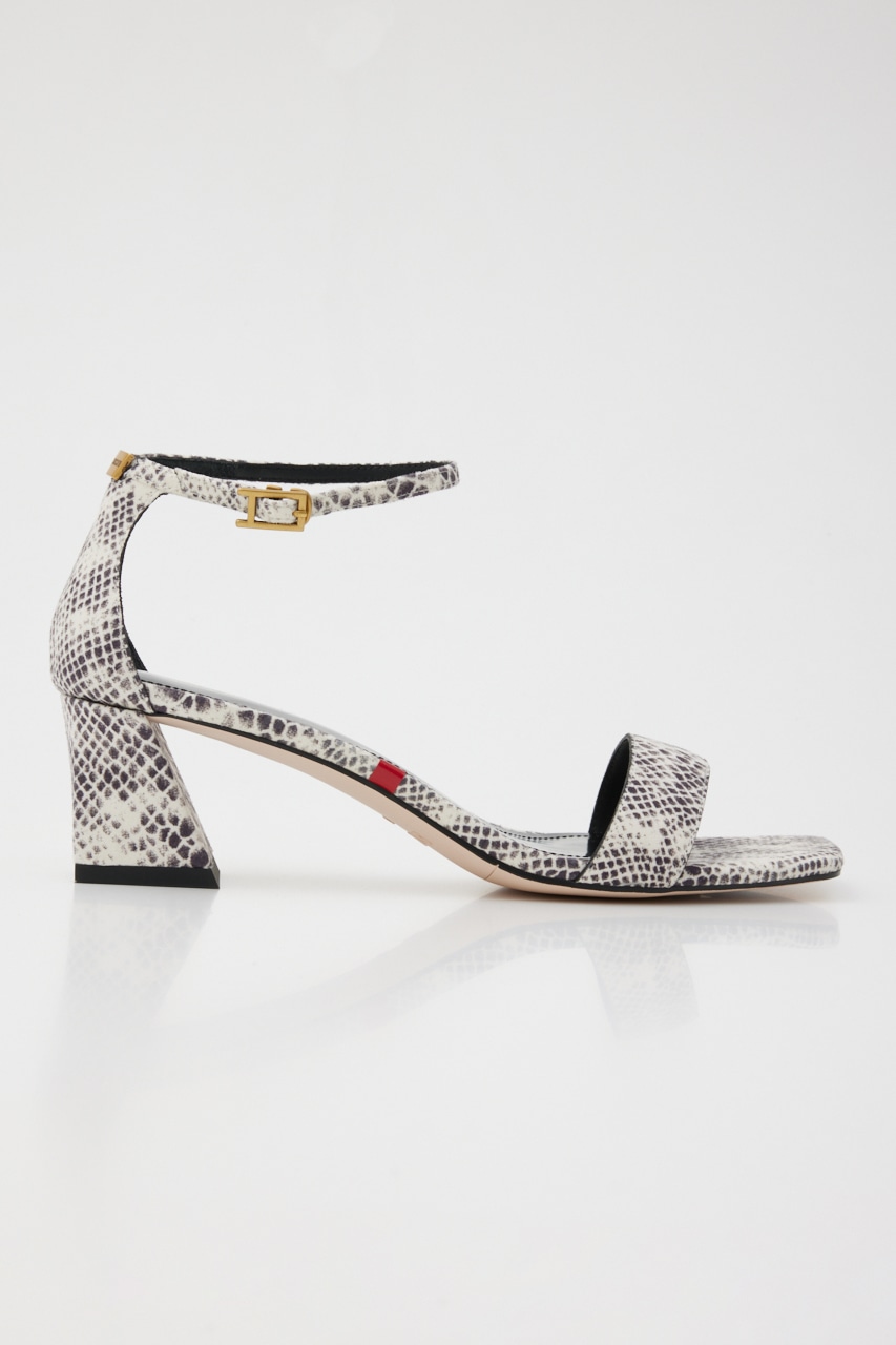 定番のアンクルストラップサンダルながら、脚を綺麗にみせてくれる華奢なストラップに安定感のあるフレアヒールがポイント。上品に履けるスクエアフォルムも大人きれい目に一役。エキゾチックなホワイトを基調としたパイソン柄が旬なスタイリングのアクセントに。