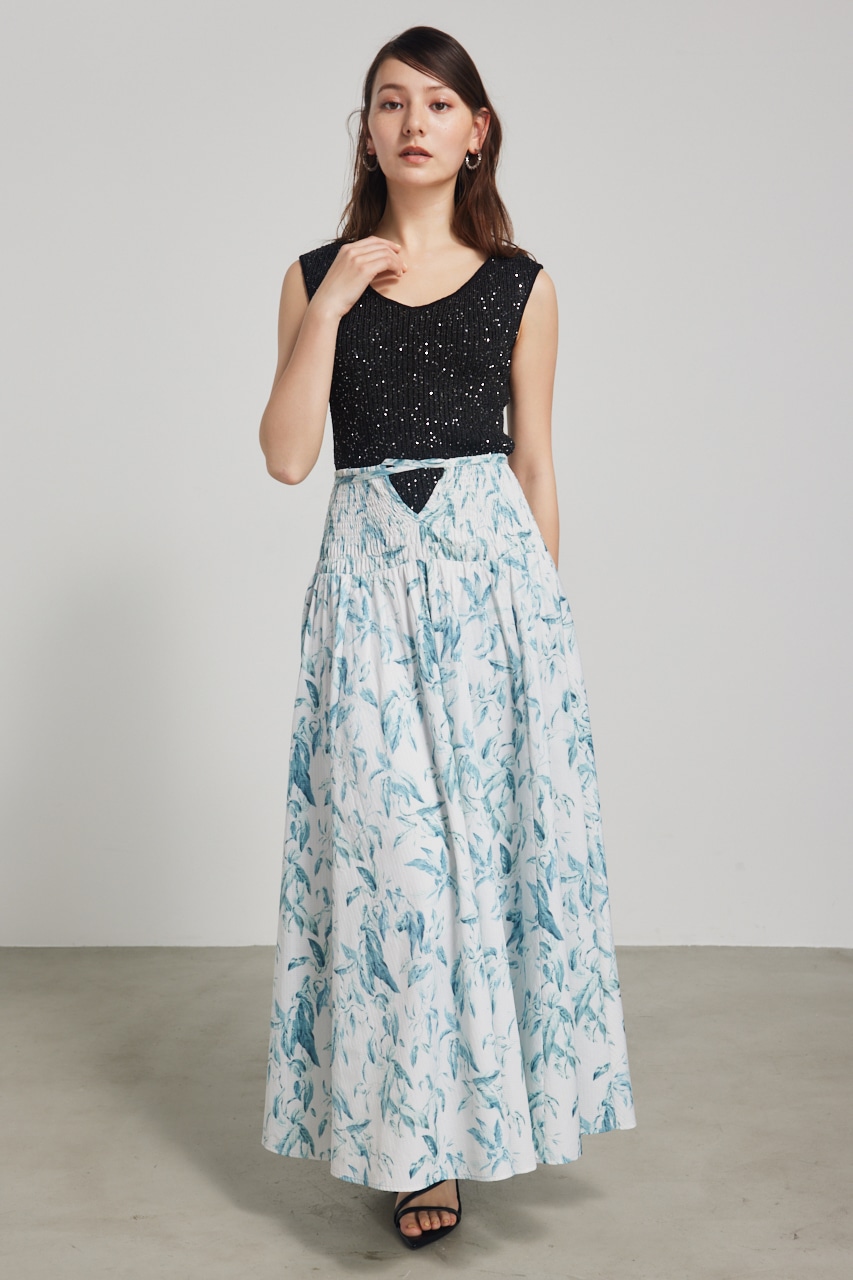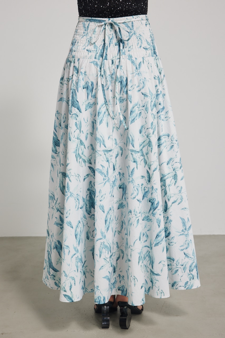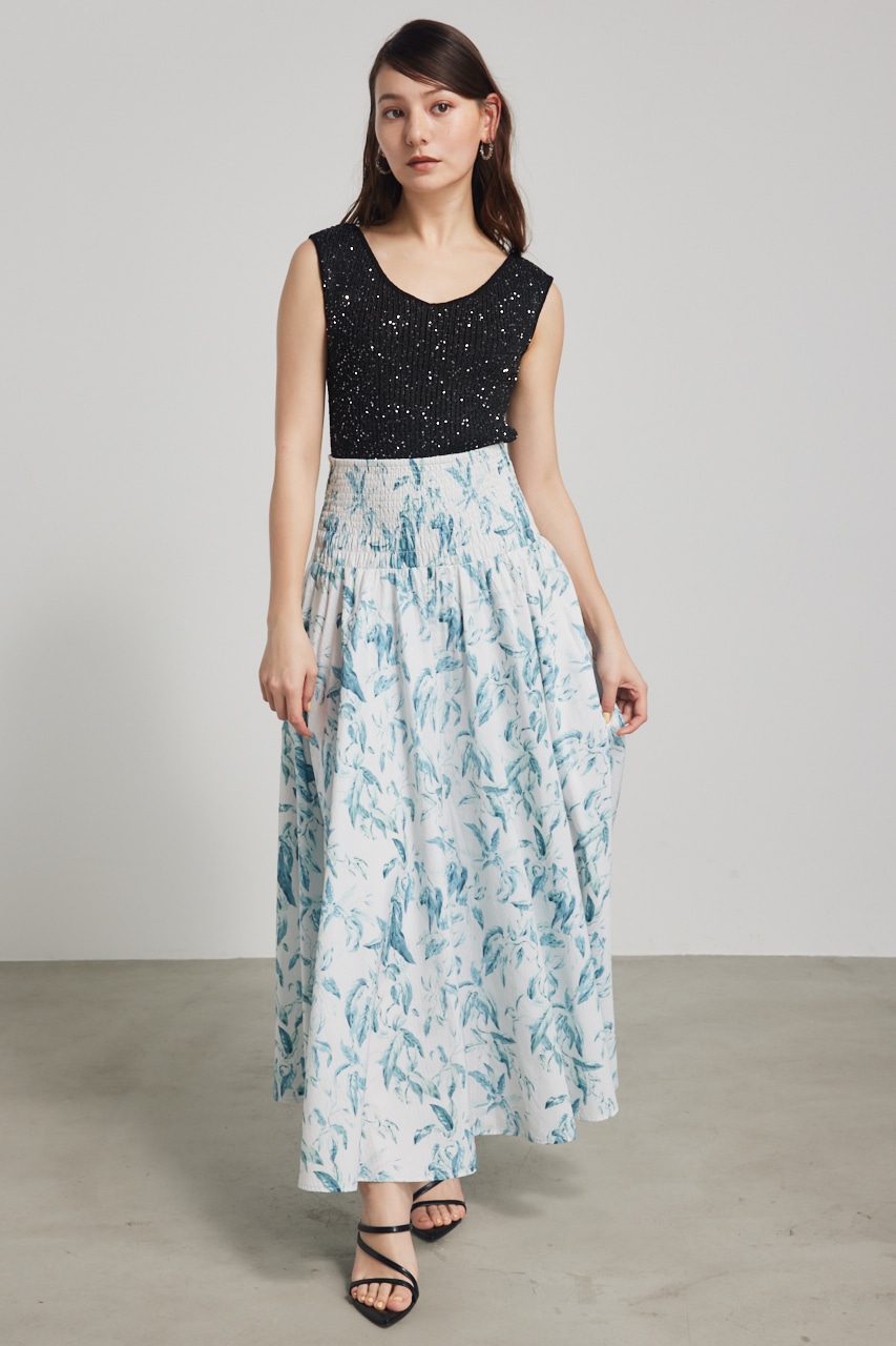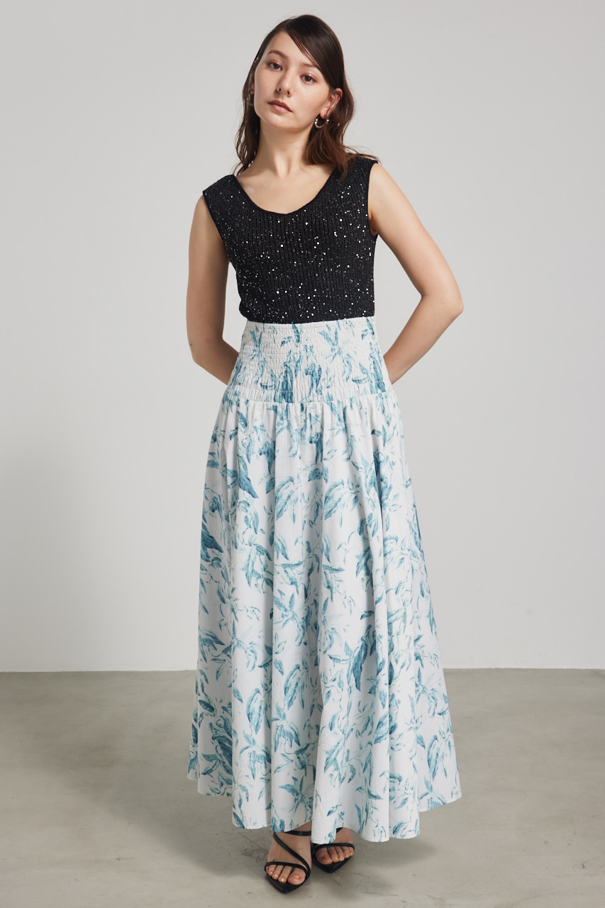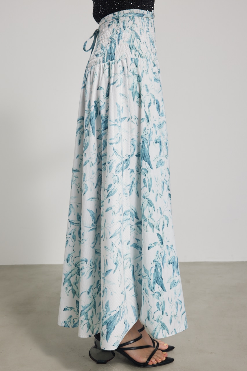 昨年も販売して大好評を得たV&A限定プリントのスカートからインスピレーションを得たアイテム。110HS631-0931と同型を使用し、プリント色は土台は落ち着いたアイボリーを使い、葉と葉脈を緩いカーブ状に配置し大人っぽいBLUの濃淡の色使いで表現しました。