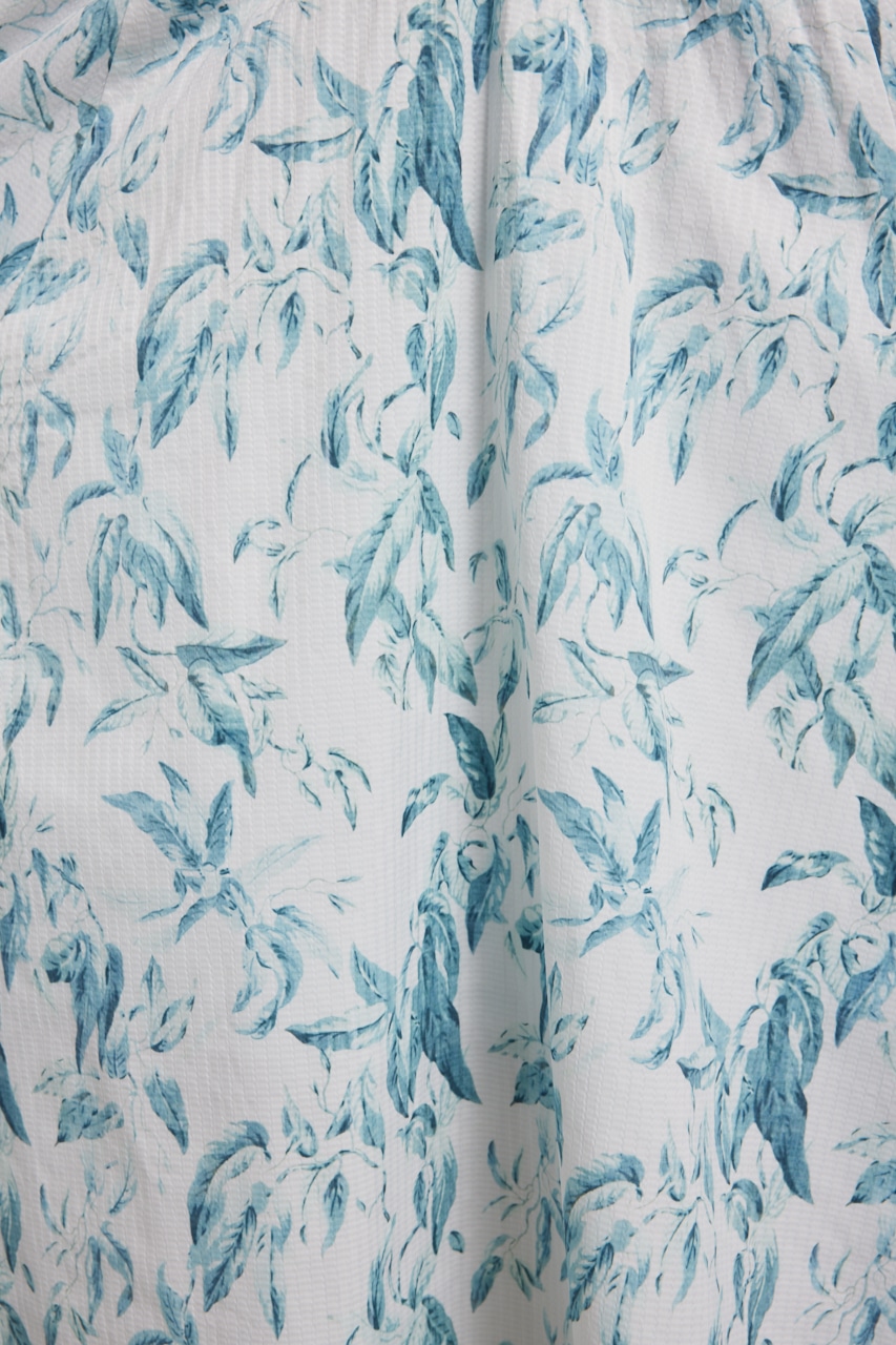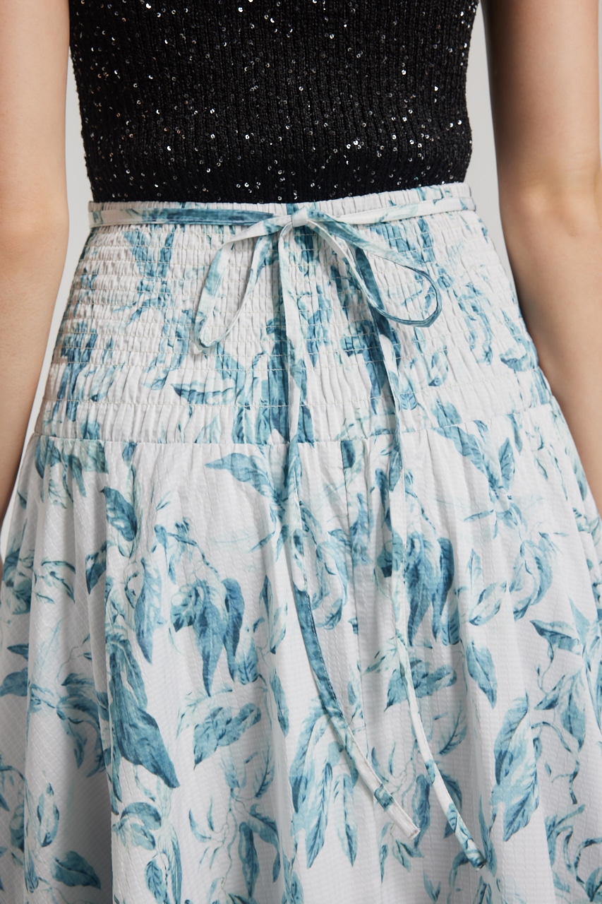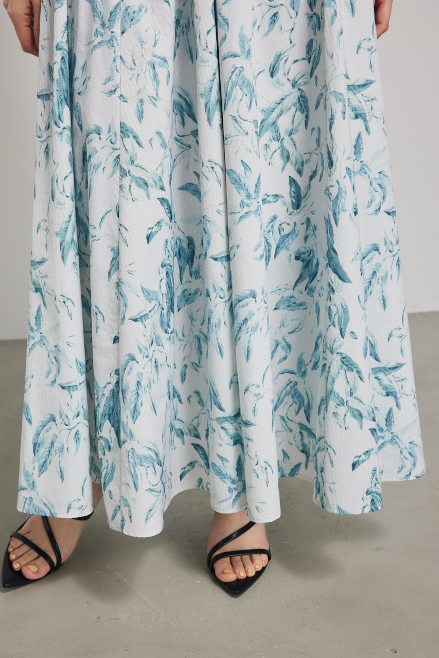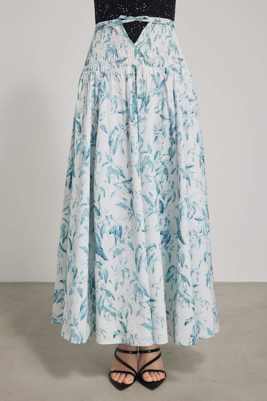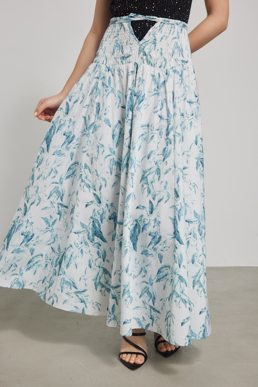 昨年も販売して大好評を得たV&A限定プリントのスカートからインスピレーションを得たアイテム。110HS631-0931と同型を使用し、プリント色は土台は落ち着いたアイボリーを使い、葉と葉脈を緩いカーブ状に配置し大人っぽいBLUの濃淡の色使いで表現しました。