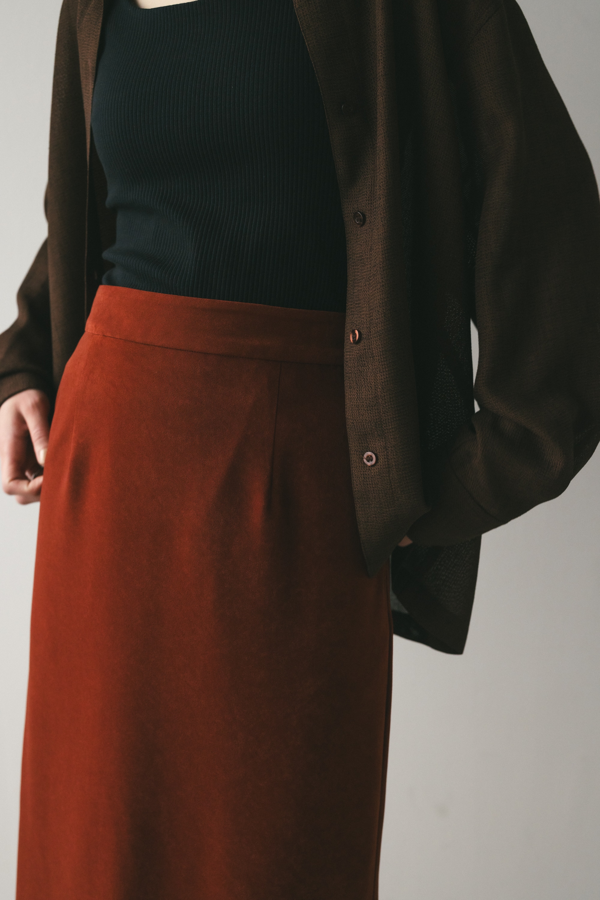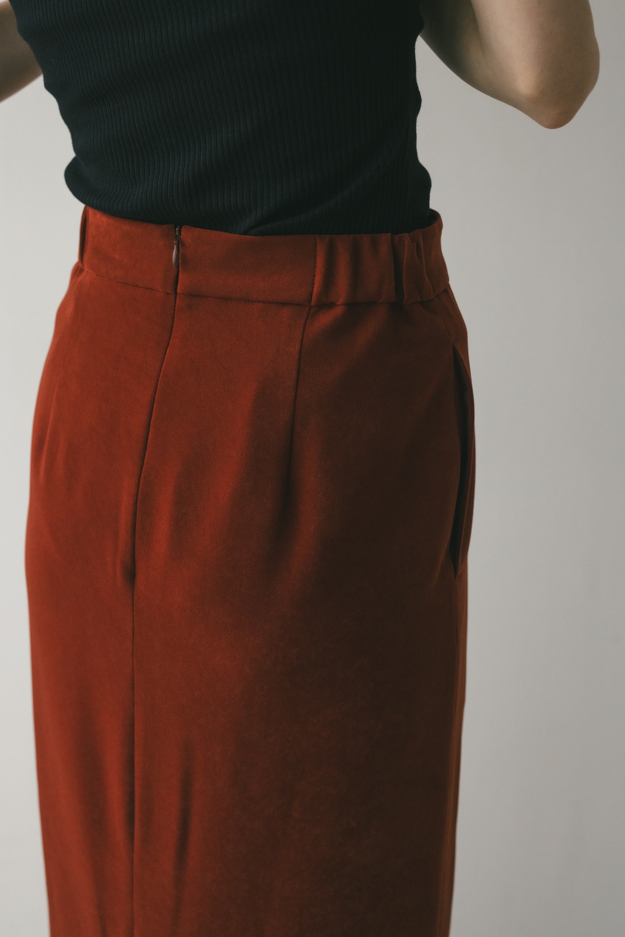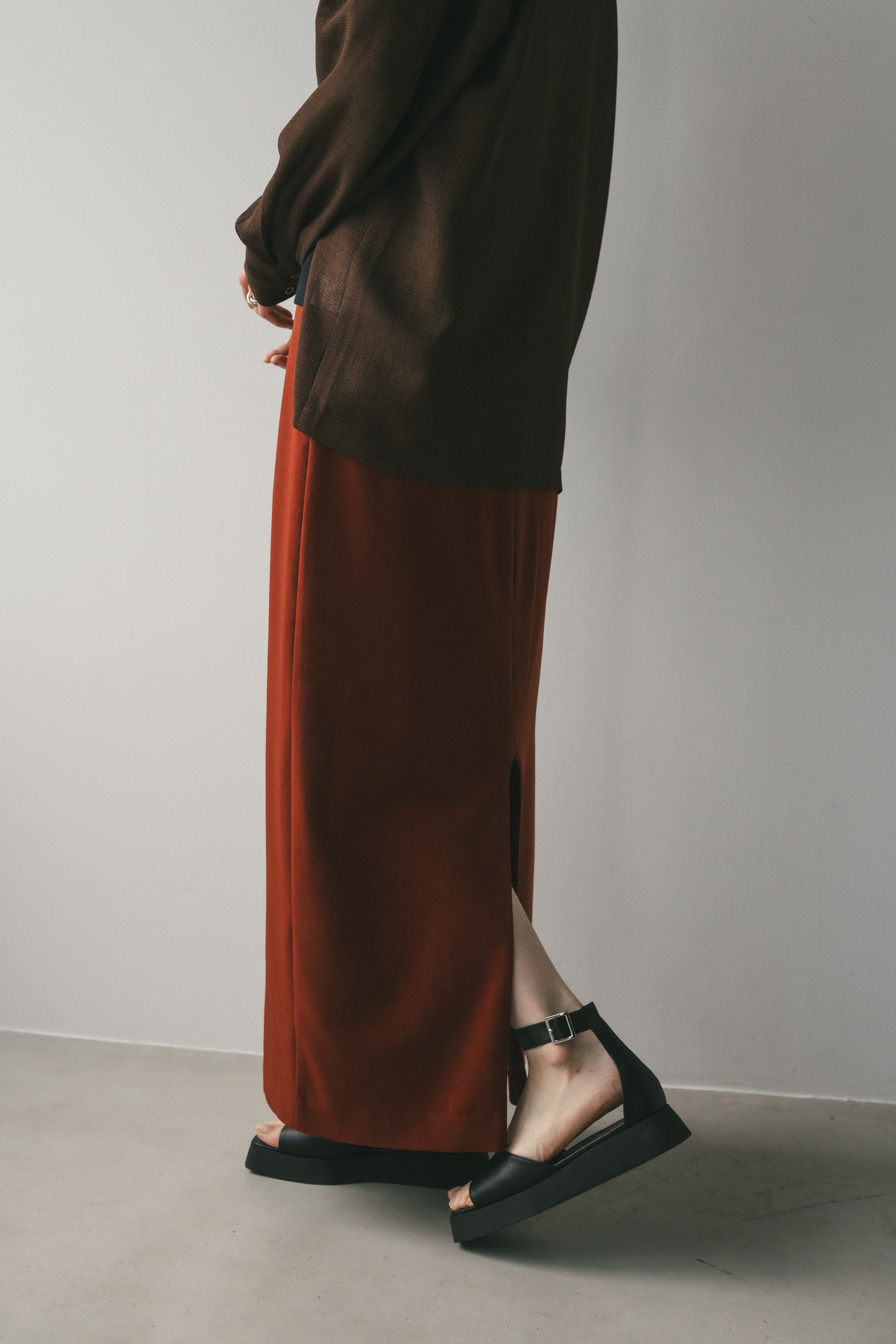 Iラインシルエットと足さばきしやすい深めのラウンドスリットがポイントのストレートスカート。