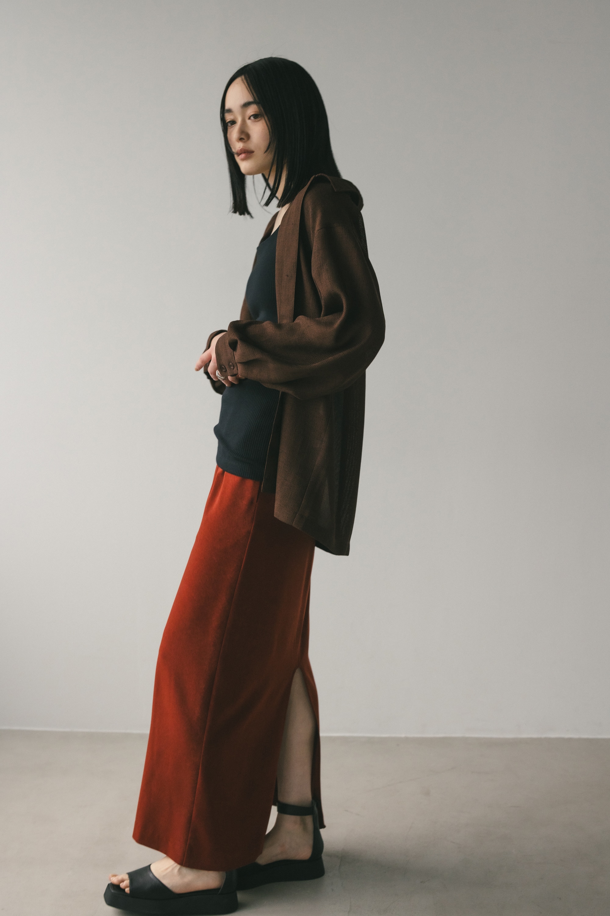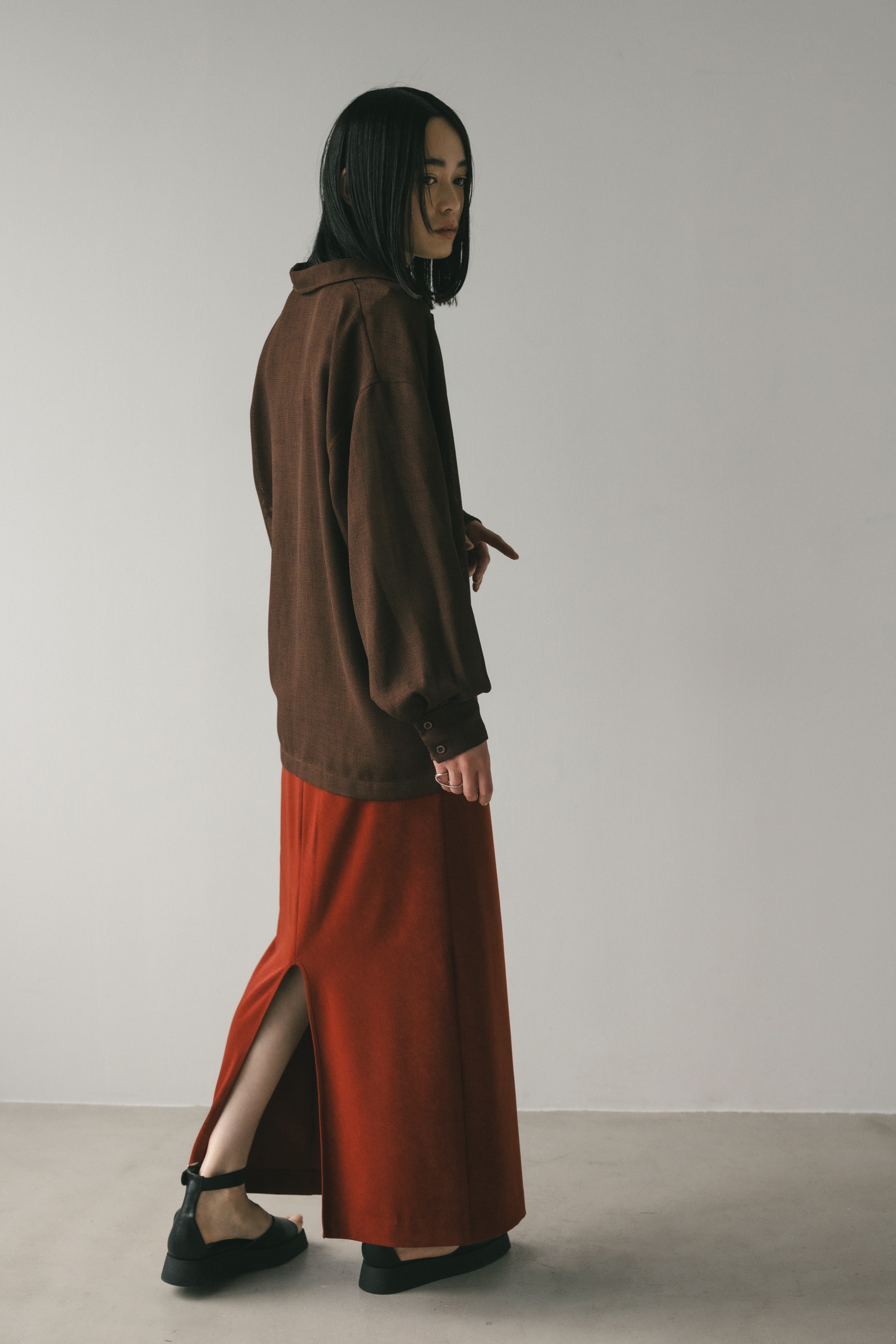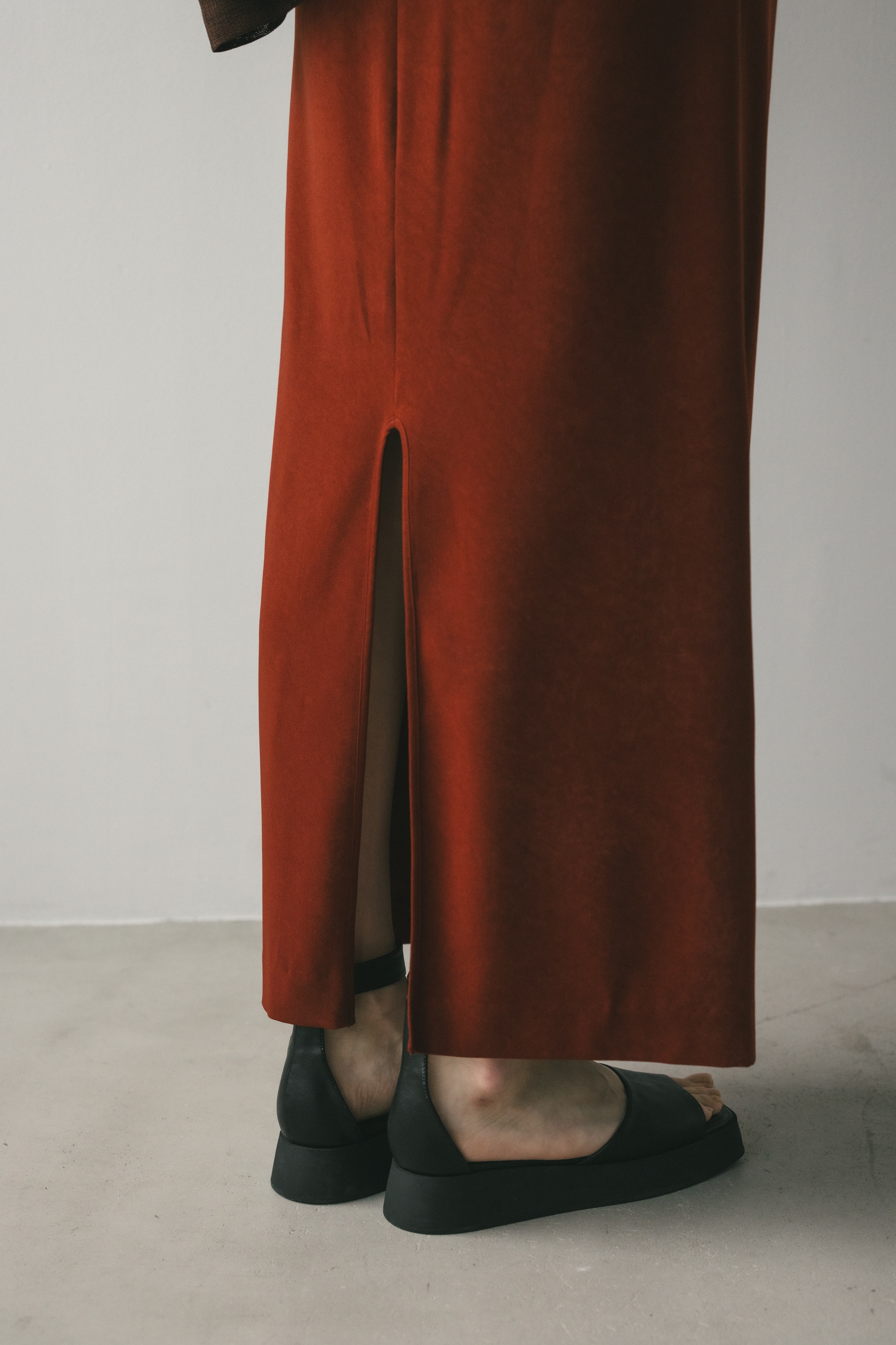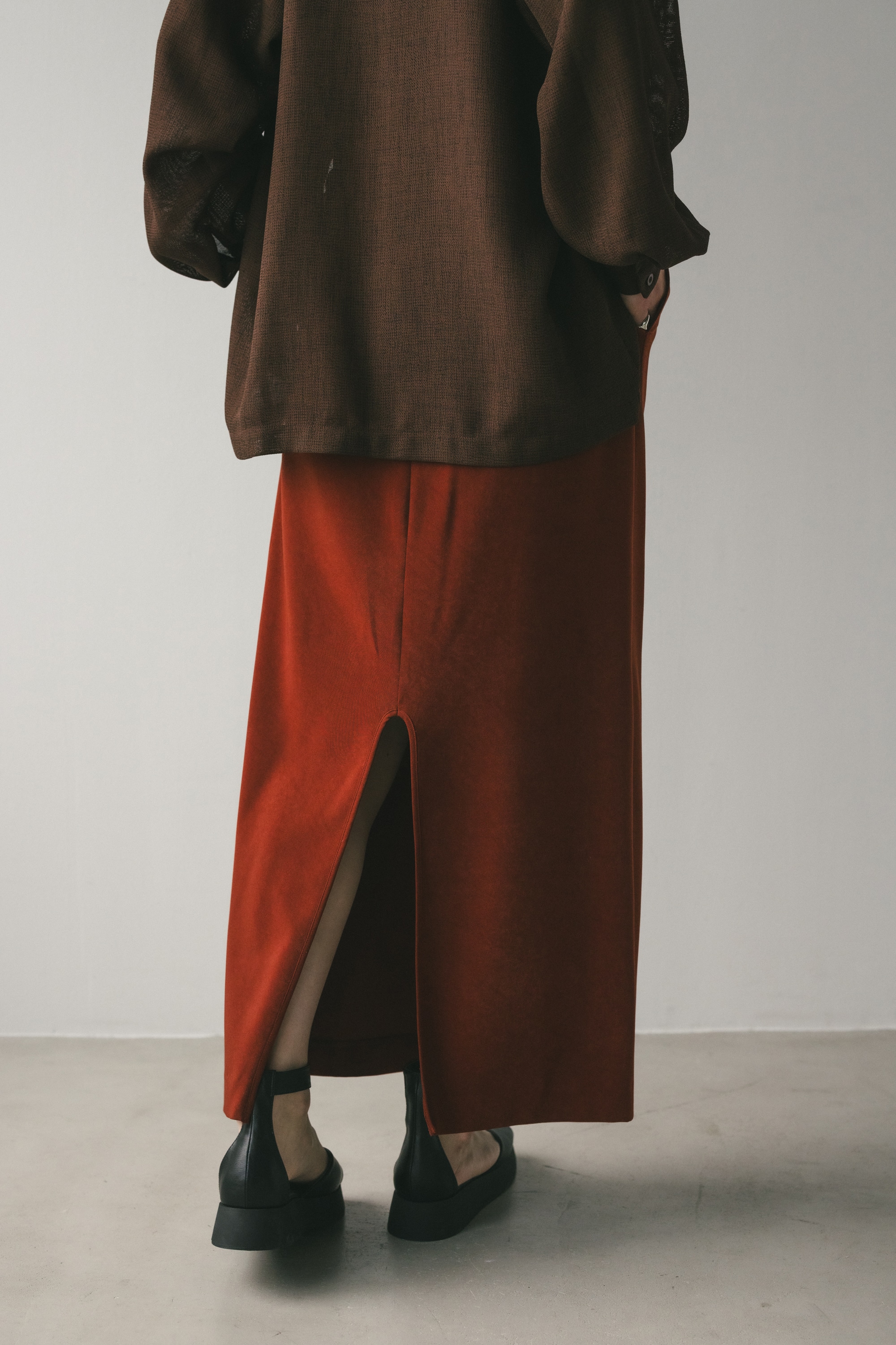 Iラインシルエットと足さばきしやすい深めのラウンドスリットがポイントのストレートスカート。