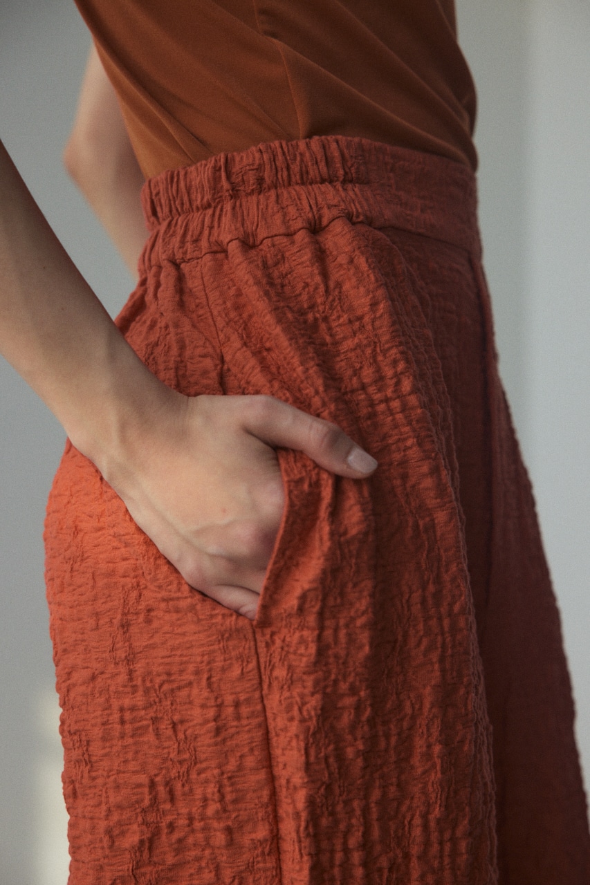 ジャガードの生地を使用していて、凹凸感が女性らしく雰囲気もあるボトム。