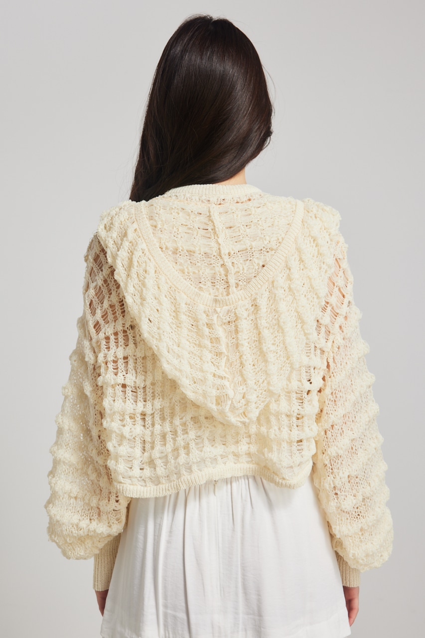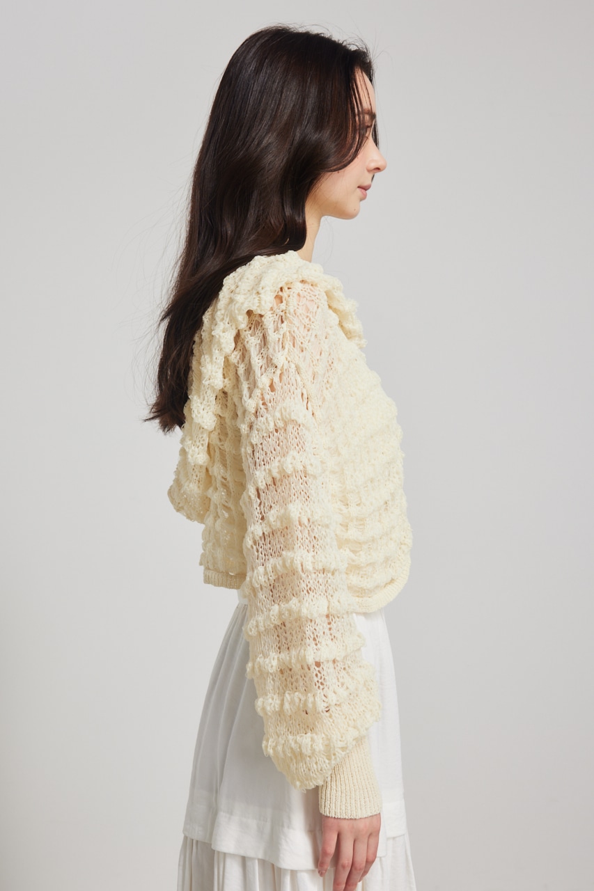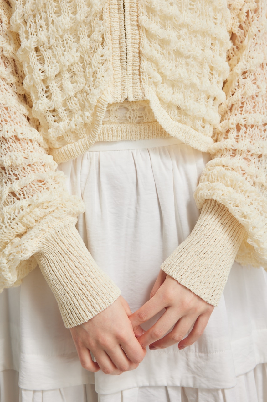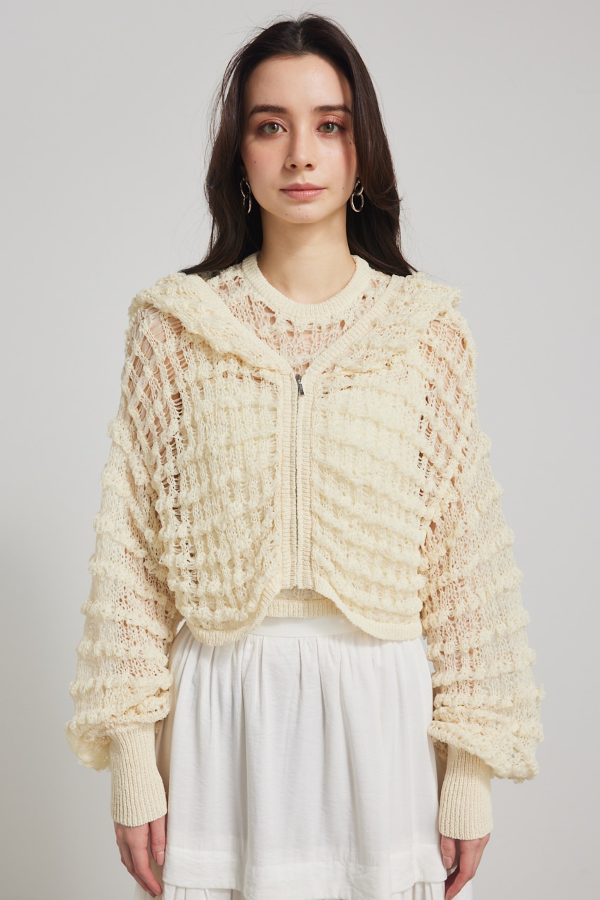 1枚でも存在感がでるように、表面感と立体感のある編地がポイントです。