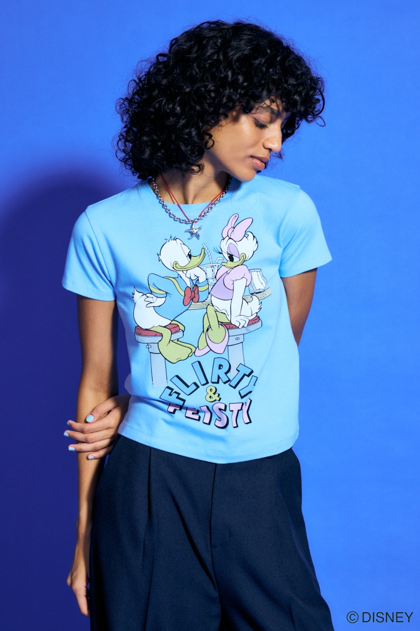 DONALD DUCKとDAISY DUCKがプリントされたTシャツは程良いルーズさで抜け感のあるシルエット。