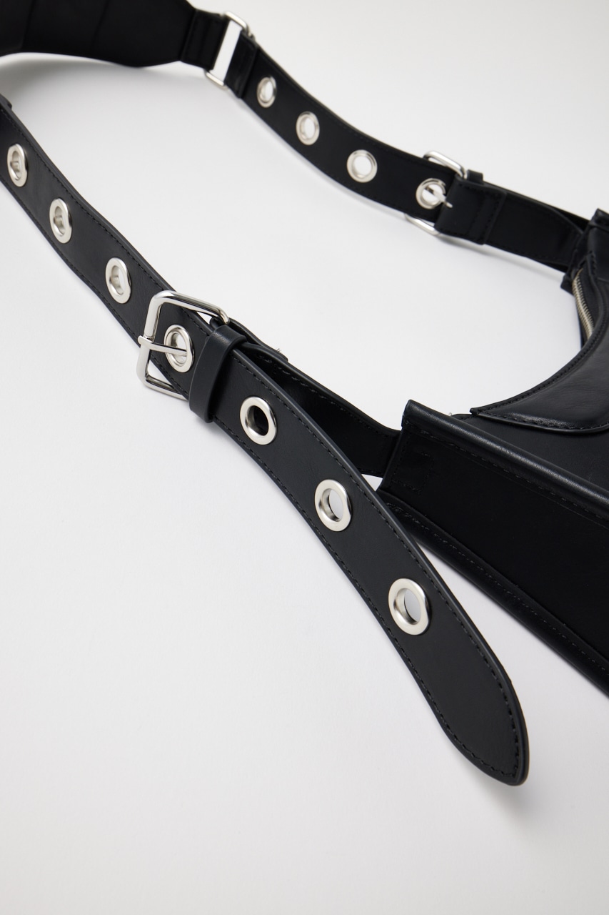ショルダーのアイレットで自在に長さ調節ができ、肩掛けから最大では斜めがけも可能。