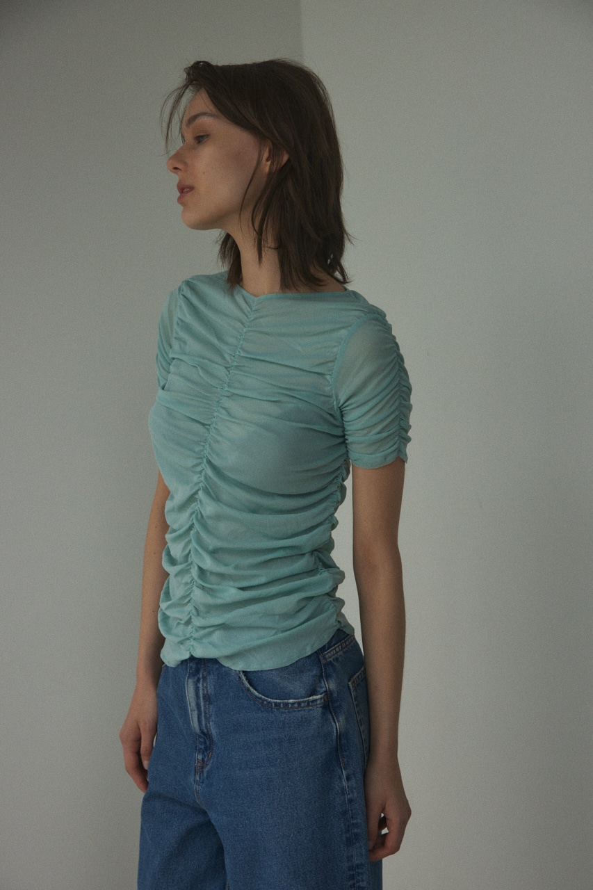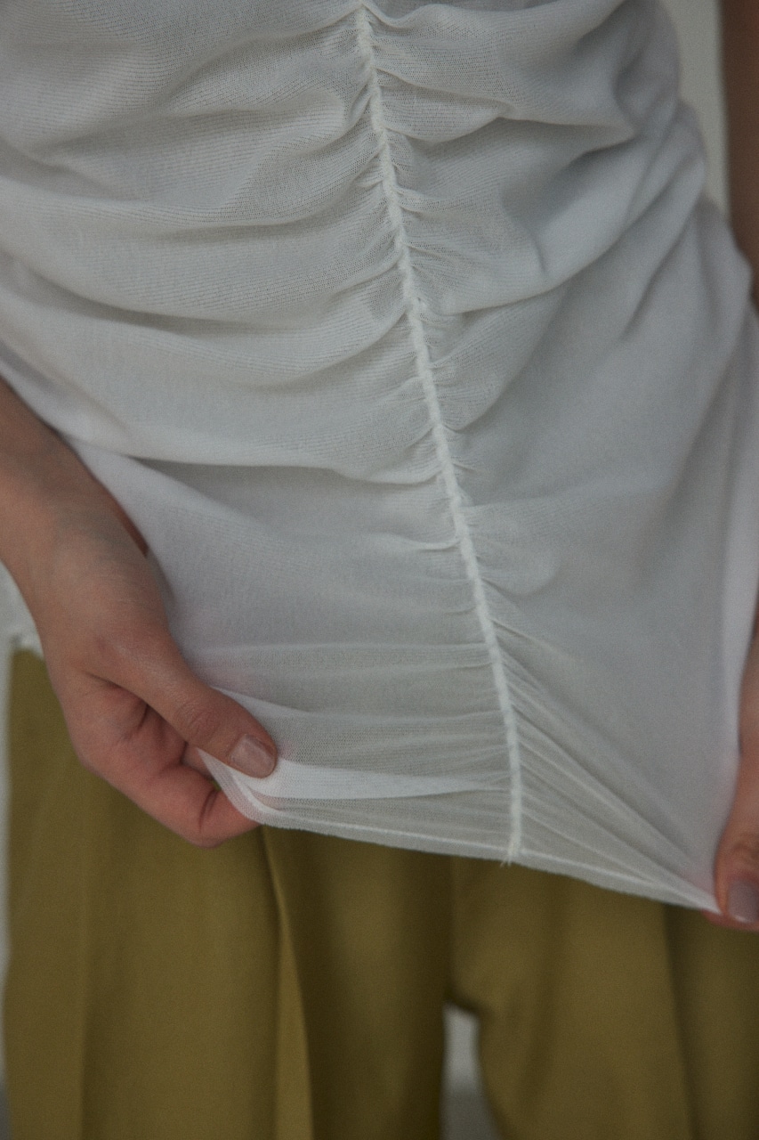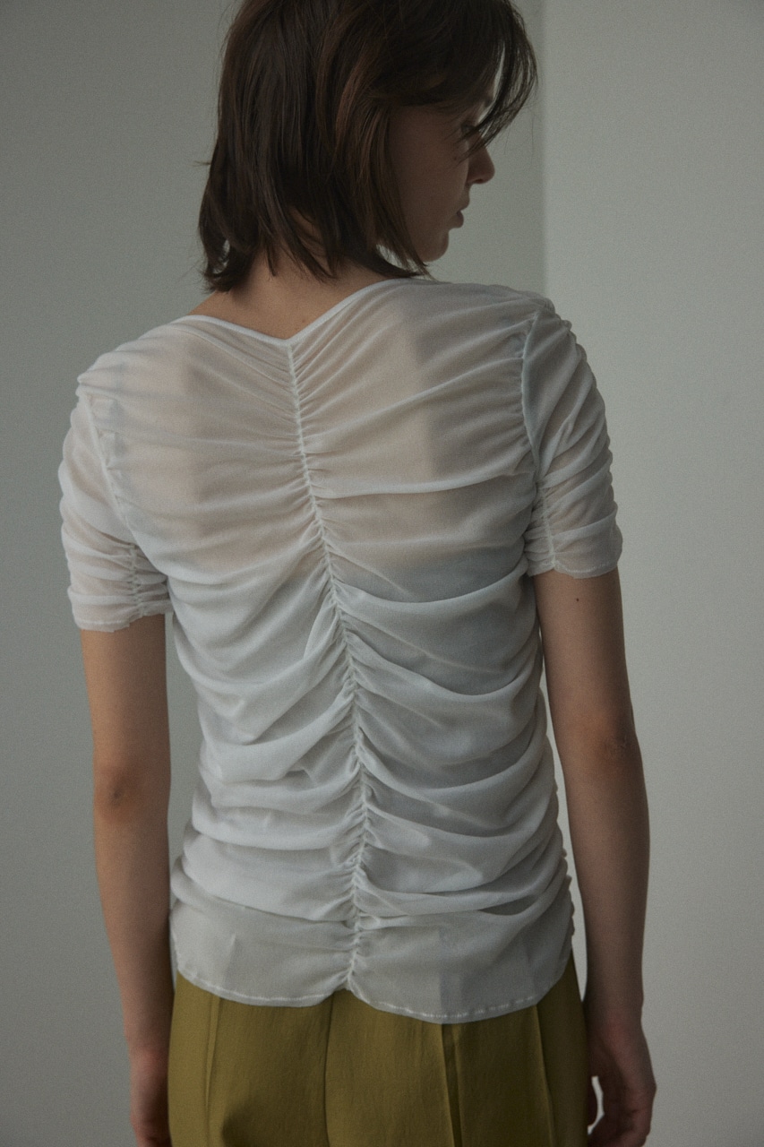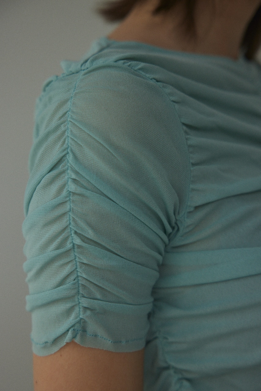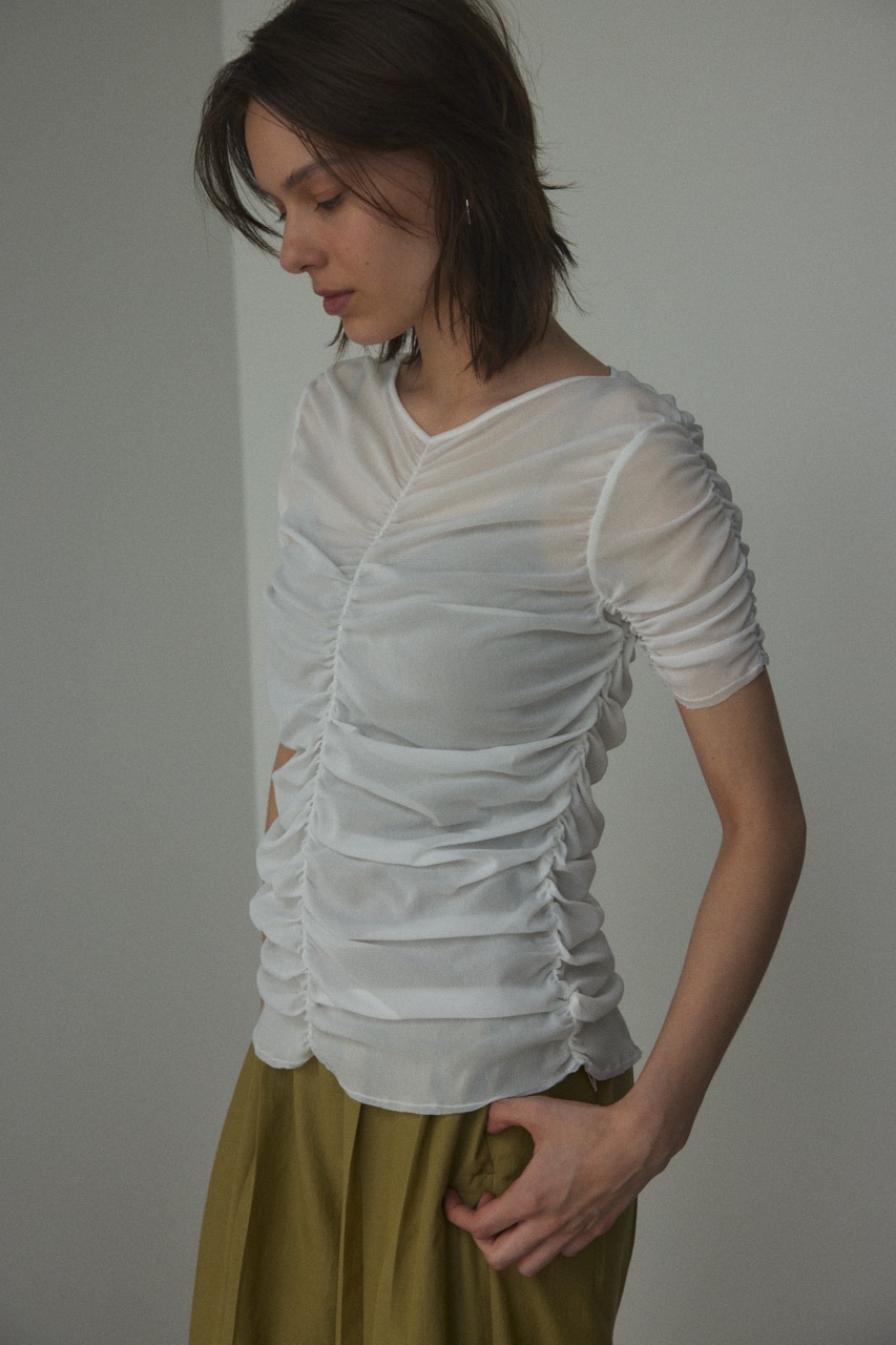 透け感のある素材で、全体にシャーリングを入れたデザイントップス。