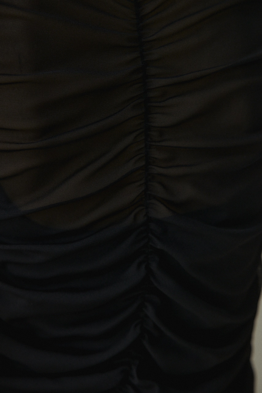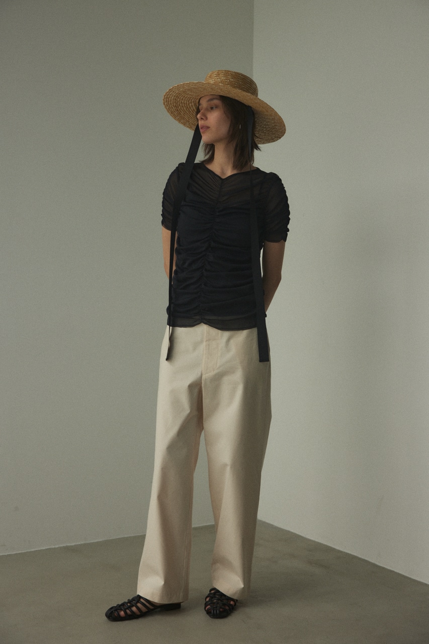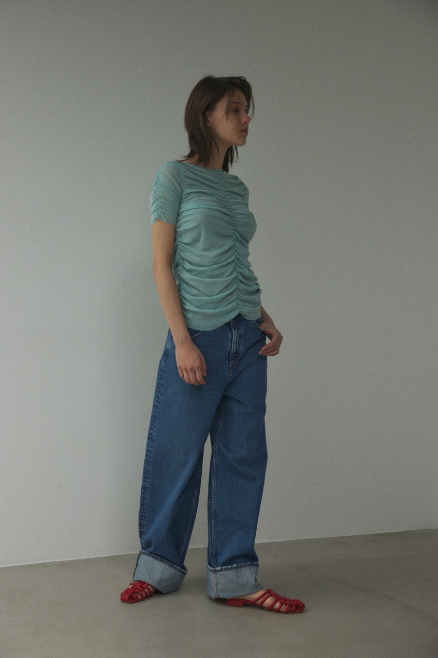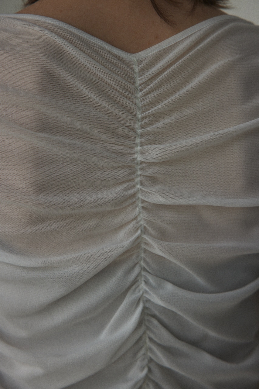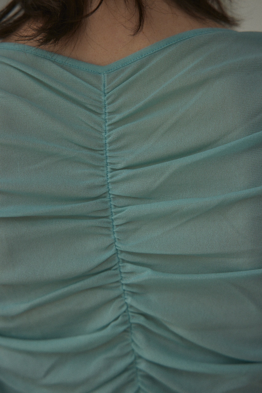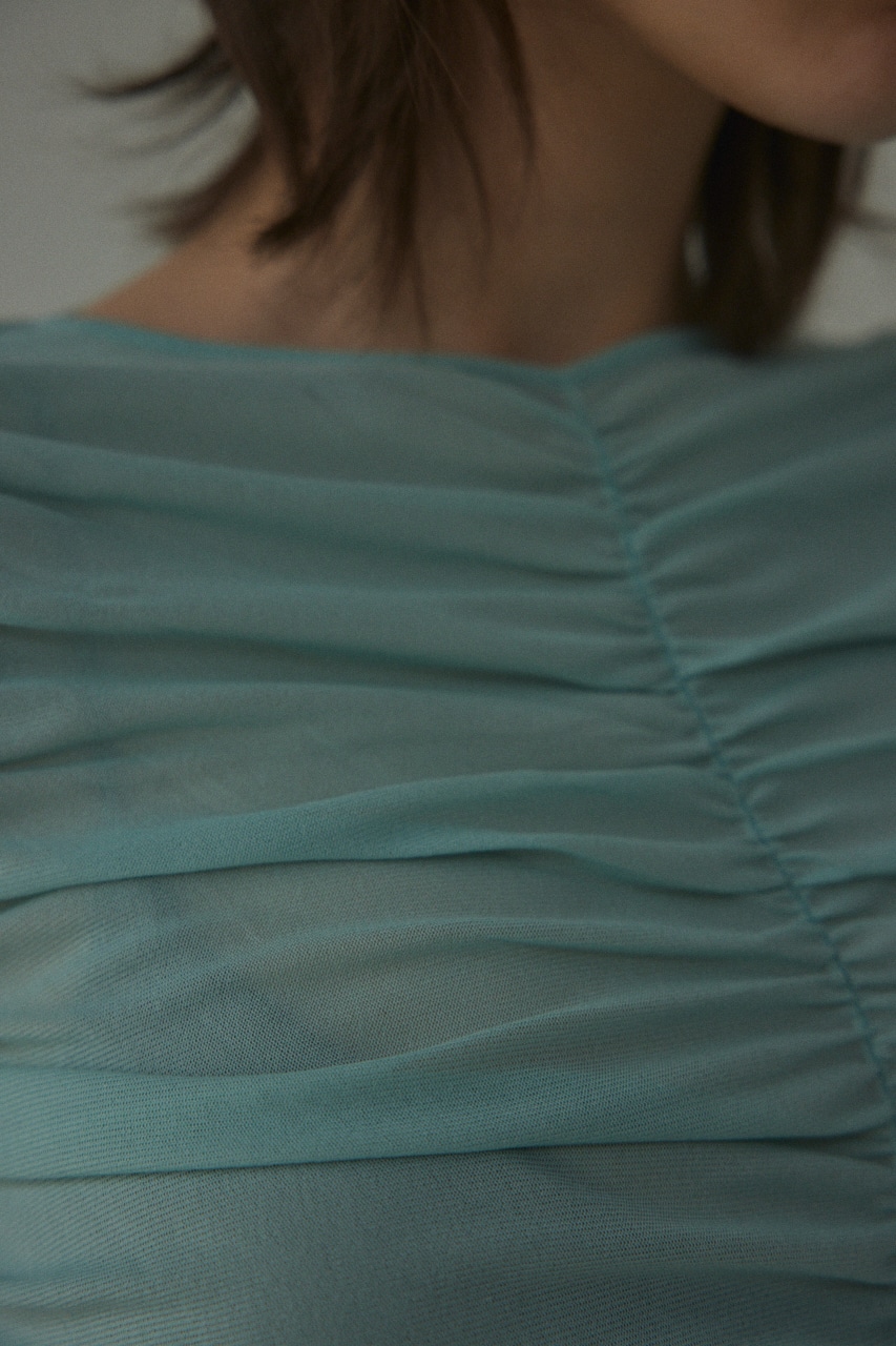透け感のある素材で、全体にシャーリングを入れたデザイントップス。