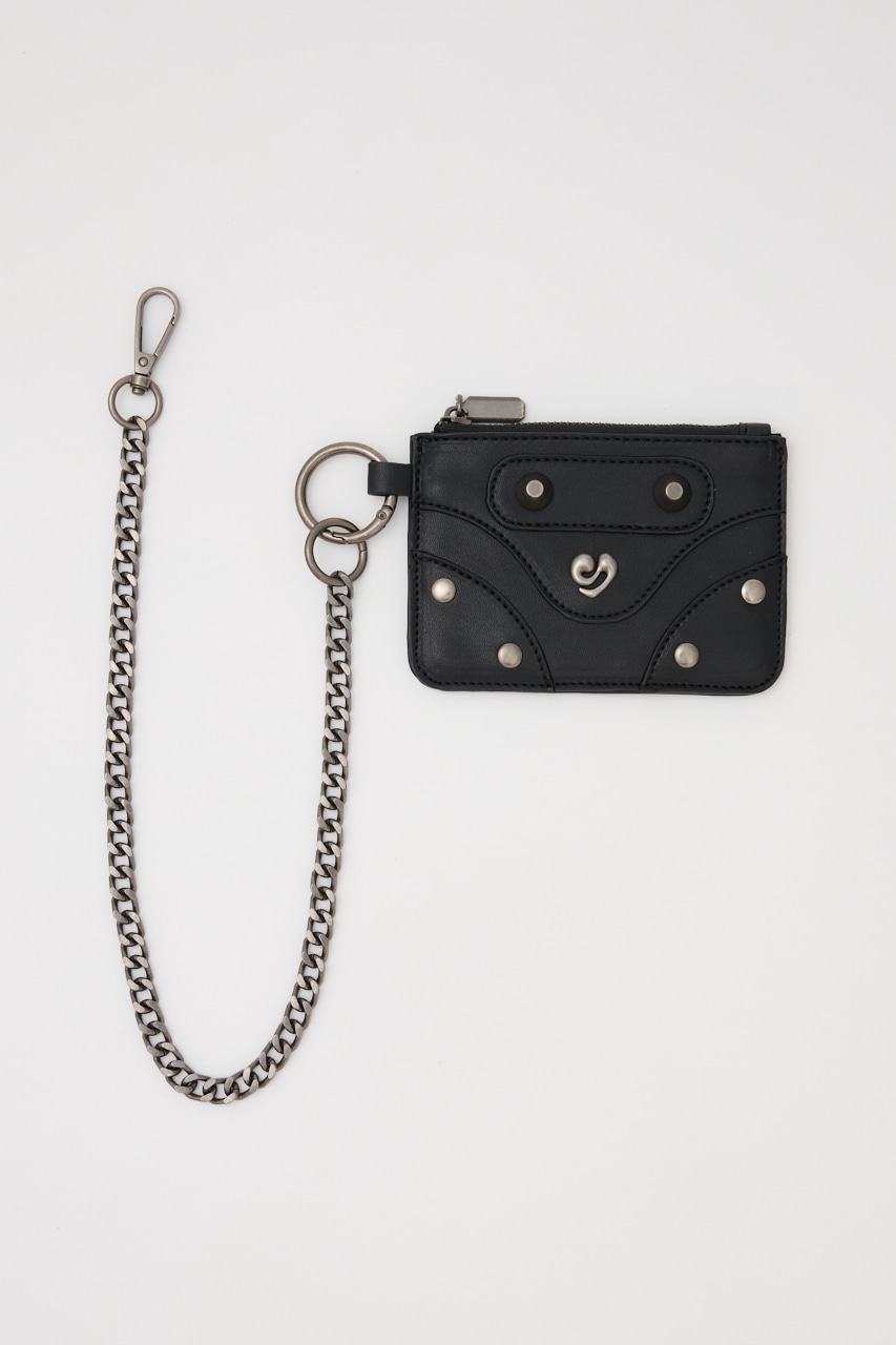 ■DETAIL:プリン型スタッズやカシメを取り入れ、あえてハードめに仕上げたデザインは、さりげない存在感でいつものコーディネートをワンランク上の仕上がりにしてくれます。チェーンとポーチは取り外し可能で、ポーチは小銭入れとしてもカードケースとしても使用できます。チェーンはキーチェーンとしても使用可能。