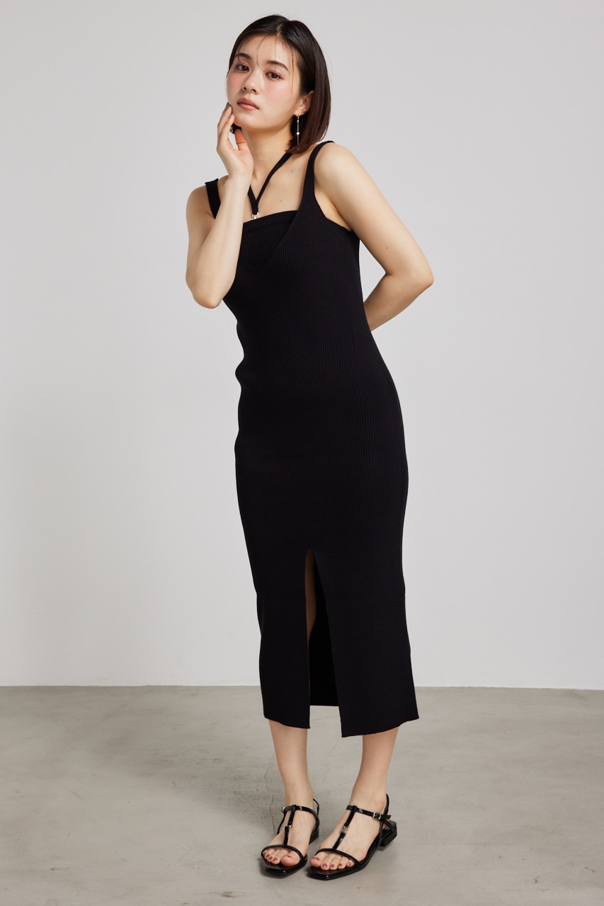 ニットの編み地はドライタッチなので綺麗めな印象で着用でき、BODYに沿ったシルエットが女性らしくセクシーなイメージです。ベアTOPとキャミワンピースを合わせたデザインワンピースです。