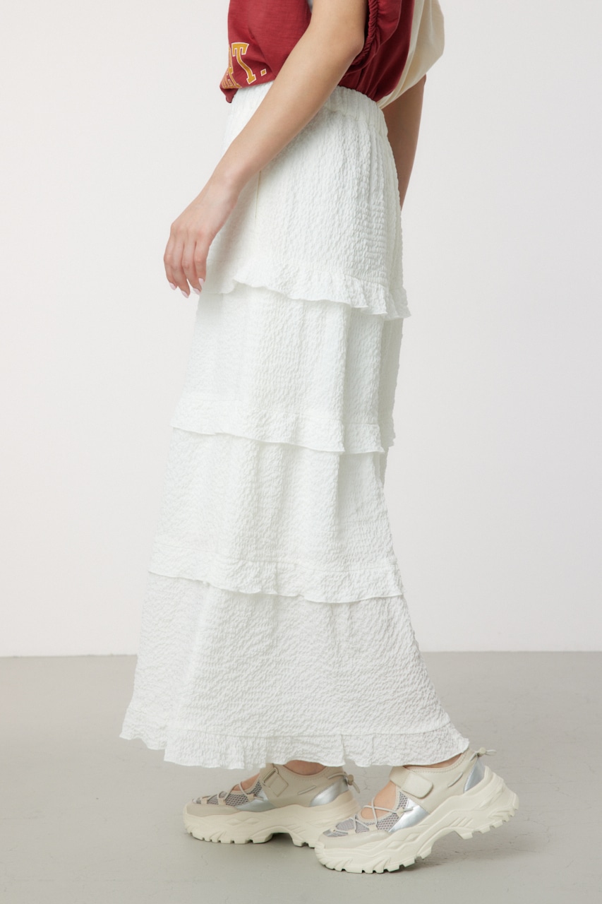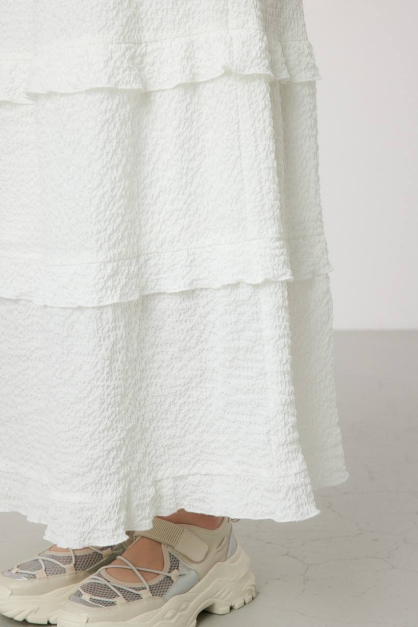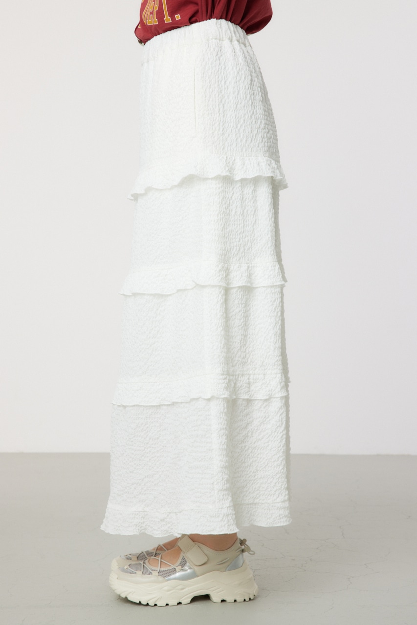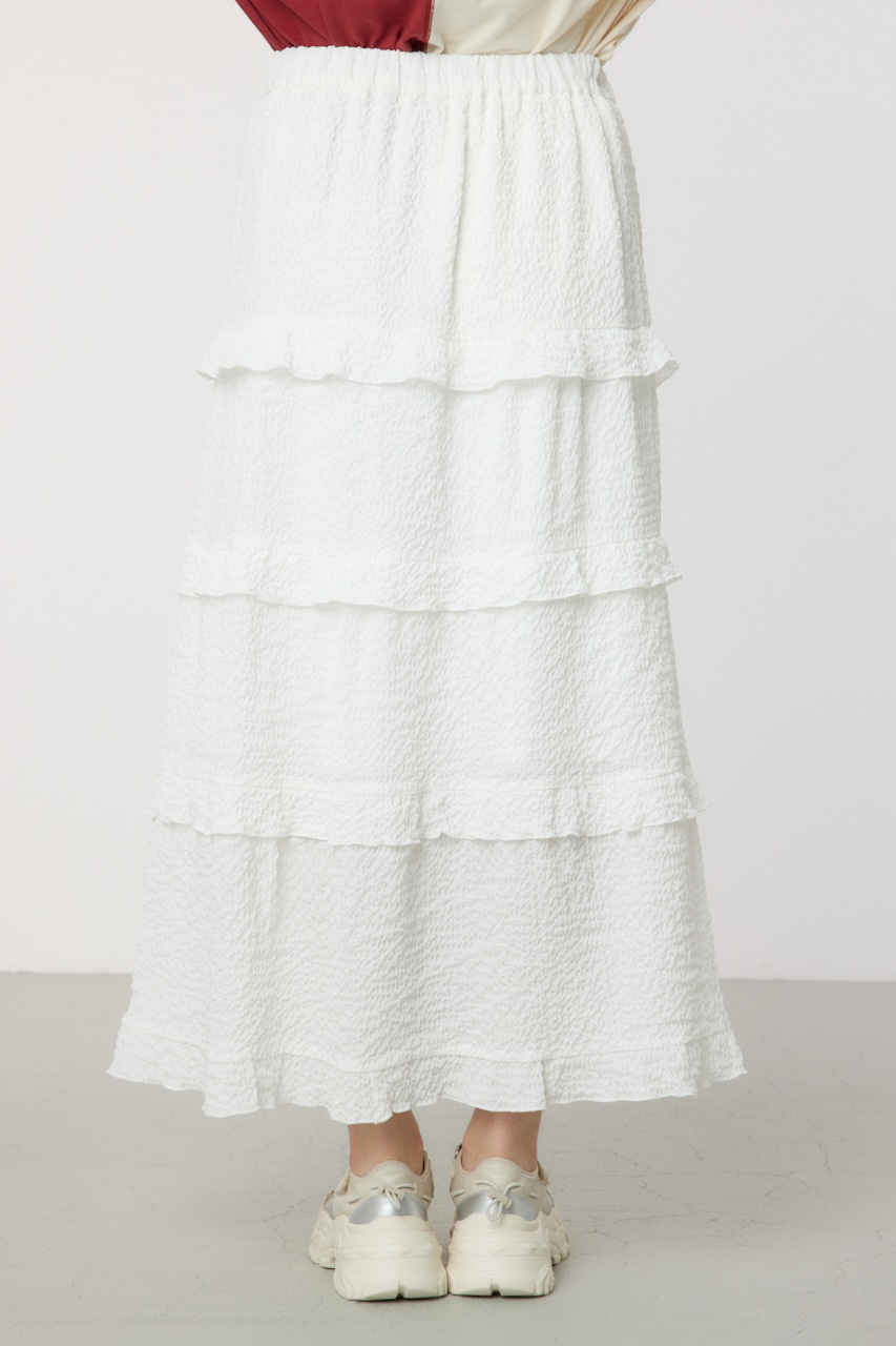 切替にチビフリルを挟んだティアードスカート。表面感のある凸凹素材が夏らしいアイテムです。ウエストはゴム仕様なので、ストレスフリーで着用できます。