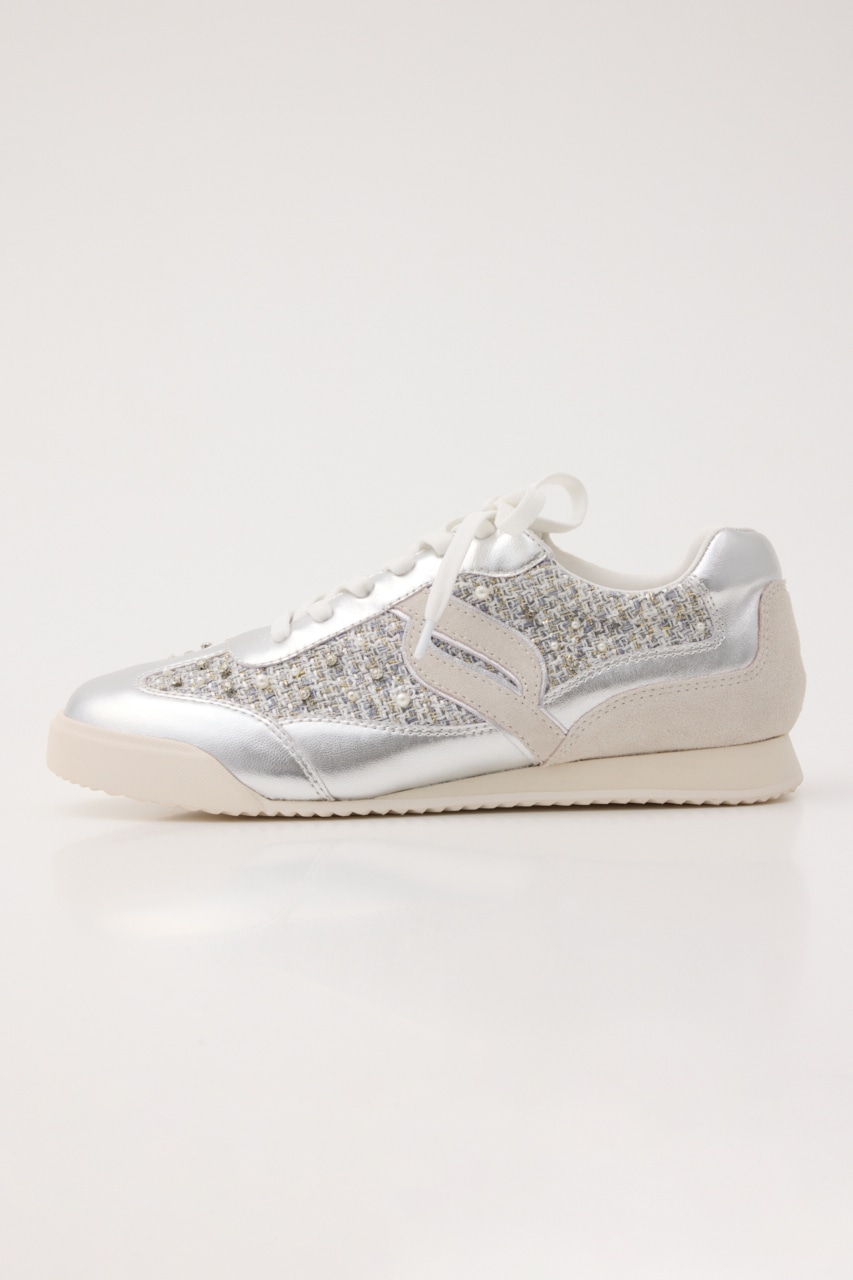 様々な要素をクロスオーバーさせ、レトロ感と旬を調和させた感度高めなスニーカー。丸みをおびたスタイルに、異素材レザー×MIXツイード×パール&クリスタルストーンの繊細で秀逸なデザインセンスが光る、唯一無二のマイスニーカー。