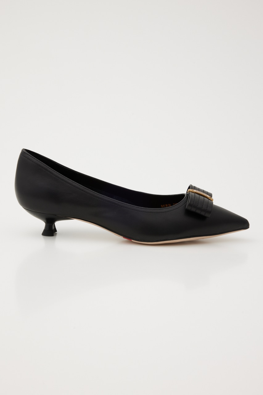 クラシカルなローヒールパンプス。滑らかなレザーにワントーンカラーでまとめた品格あるなリボン&歩行も楽なキトゥンヒールかつグリップ力もあり足裏に吸い付くような履き心地です。フォーマルからデイリーにも万能に履いていただけます。