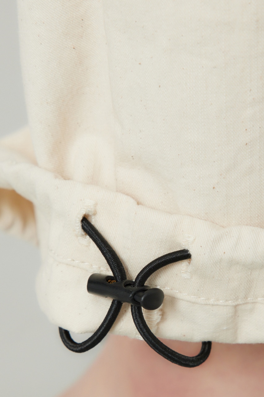 古着をリメイクして仕上げたようなカーゴパンツ。微配色で切替え、ヴィンテージテイストのプリントを施しました。クロップドトップスとも相性抜群のワイドシルエットで、裾に通したコードを絞ってアレンジが可能。ウエストはサイズ調整可能なスピンドルを施しています。シンプルなトップスと合わせるのがおすすめです。