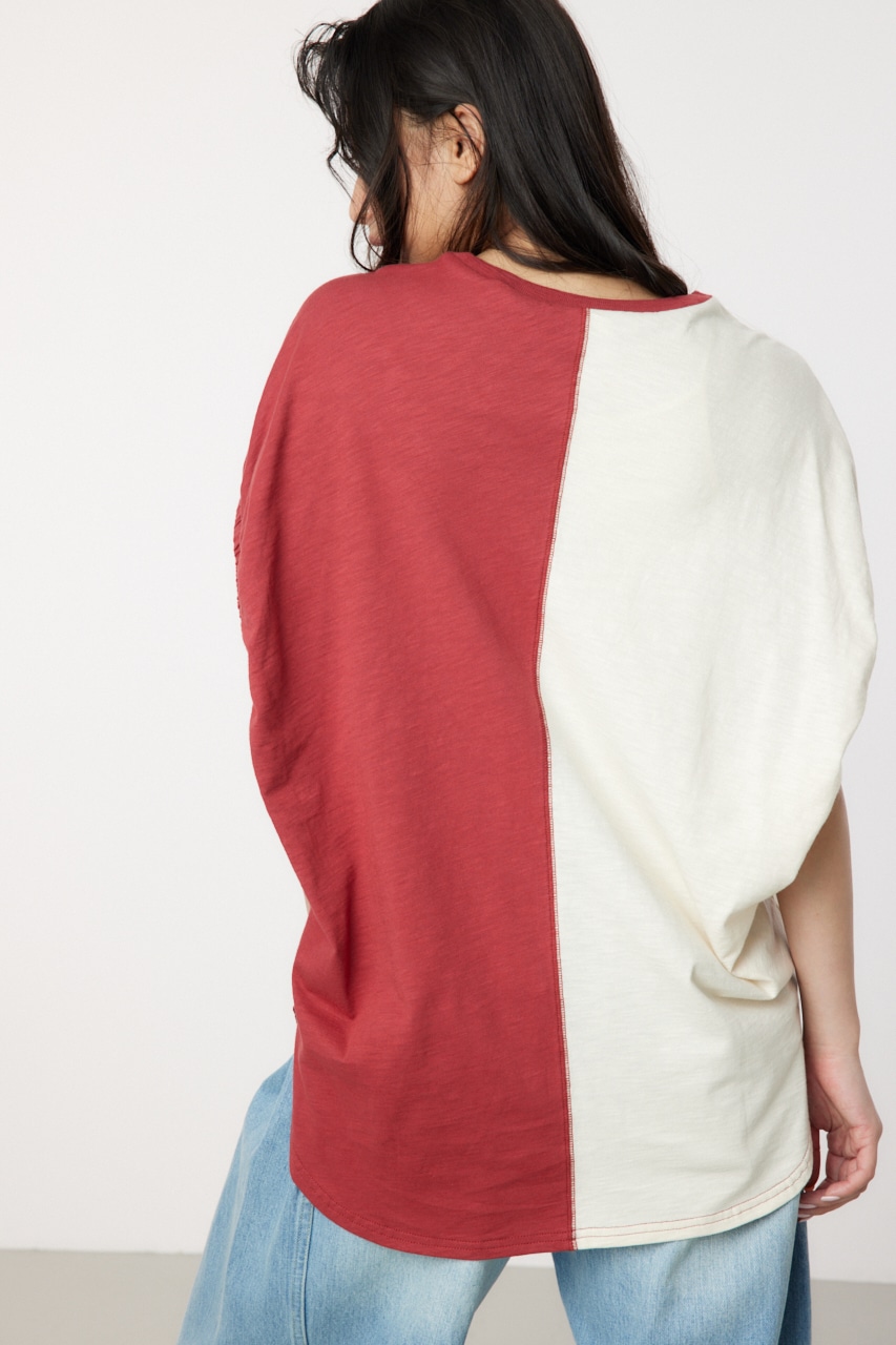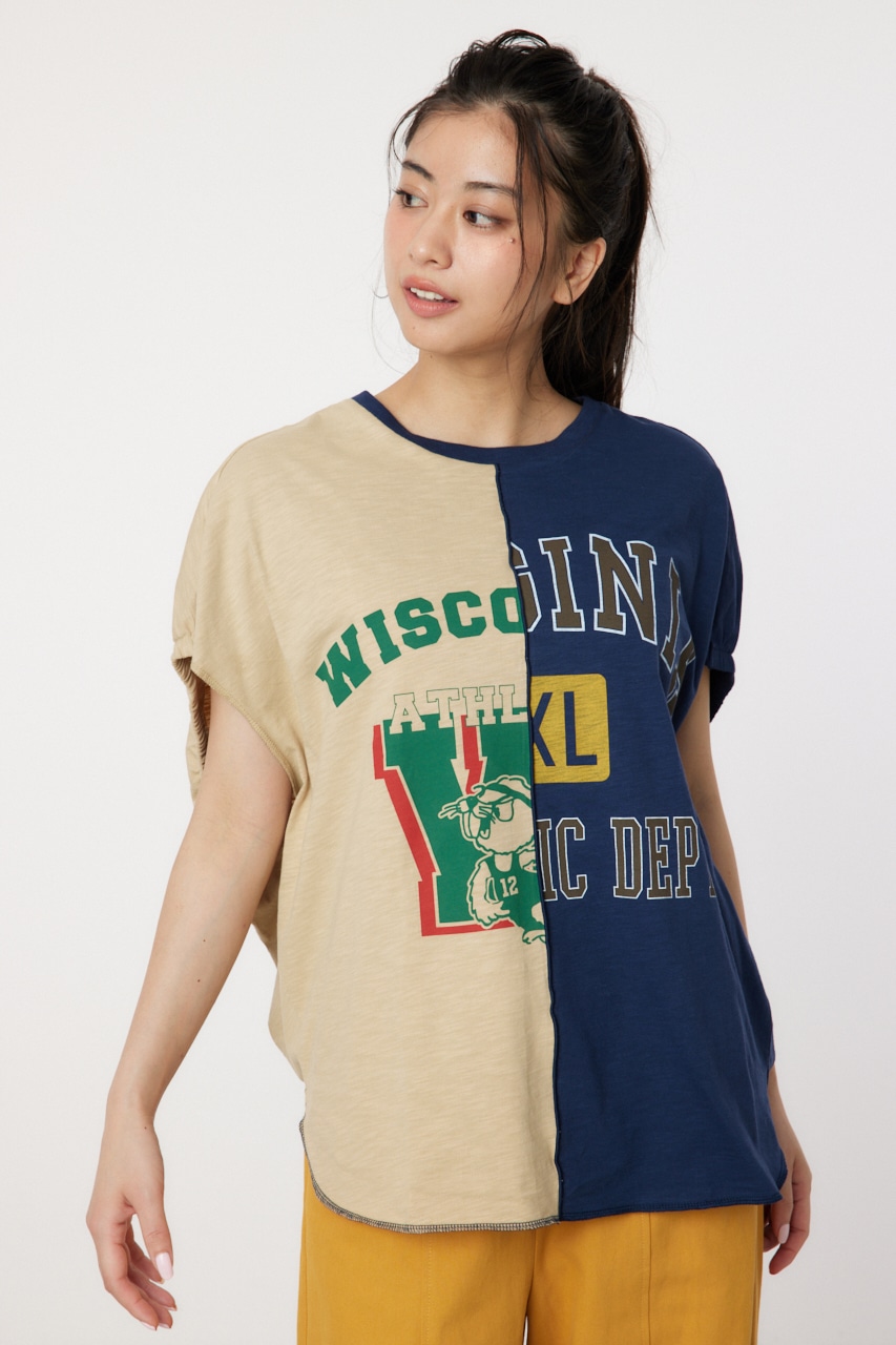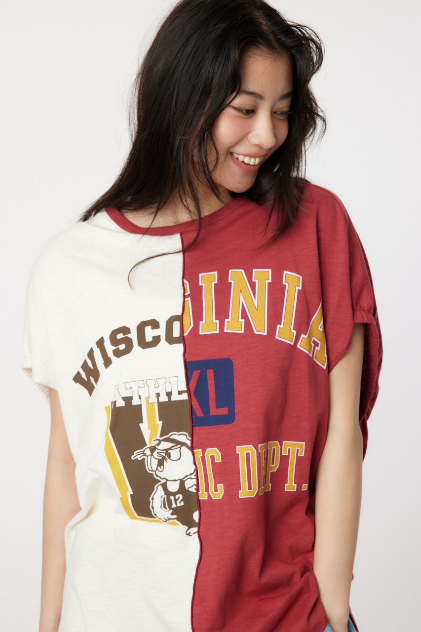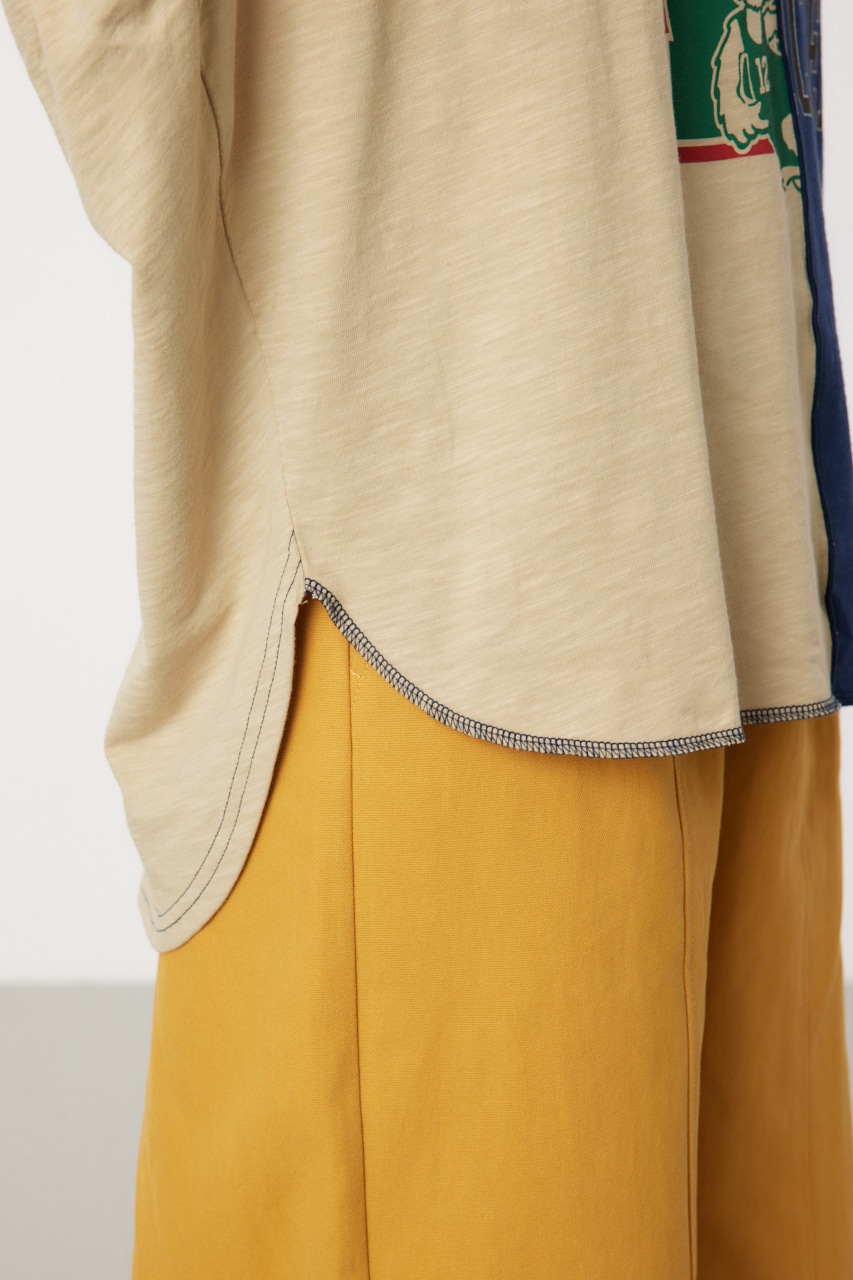 スラブ糸を使用した雰囲気のあるドッキングトップス。2種のカレッジTシャツをドッキングしたようなリメイク風デザインで、さらりとデニム合わせでも様になるアイテム。袖口は後ろ身のみゴムを入れることで、バックスタイルがドレープデザインになり、気になる腰回りを隠してくれます。