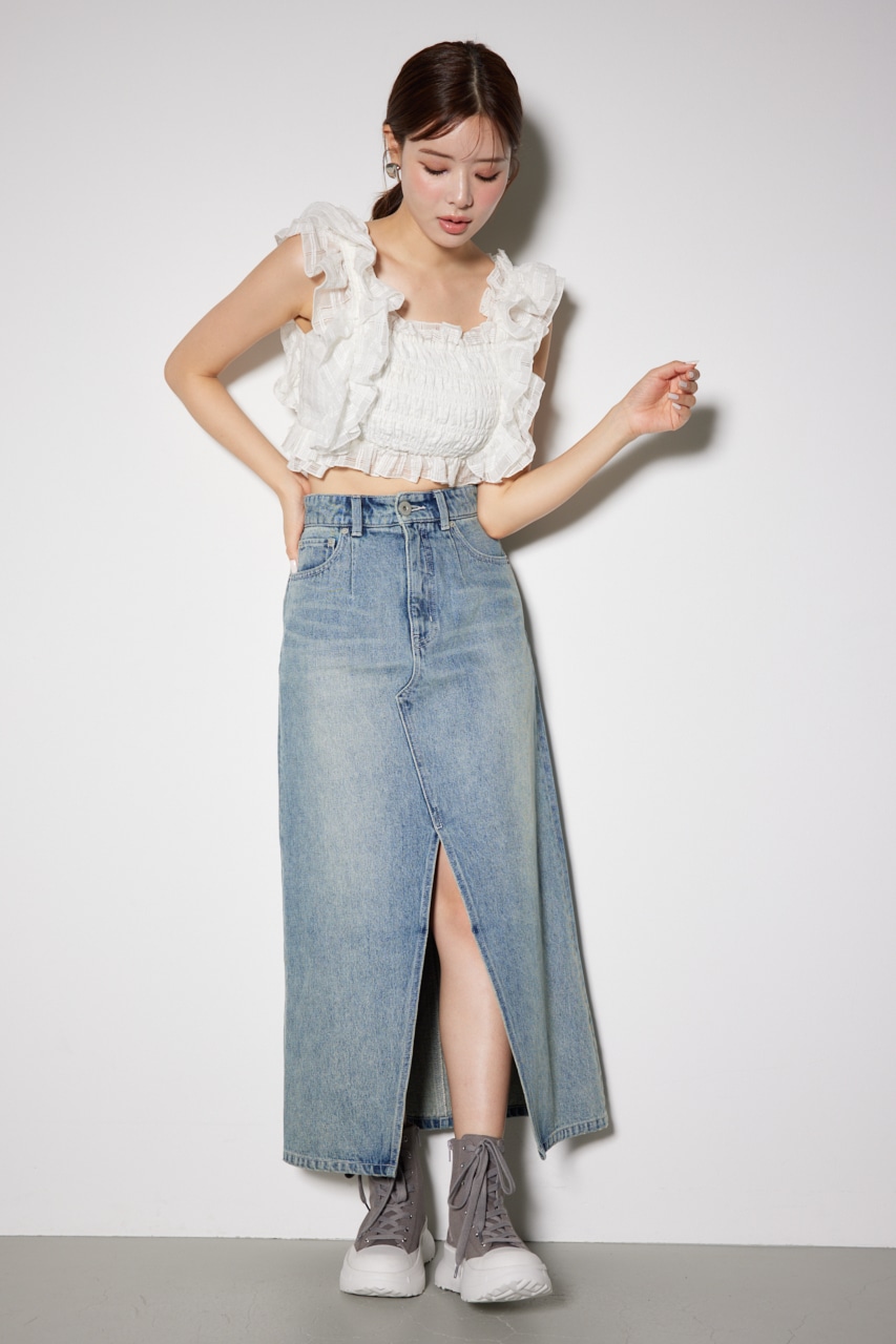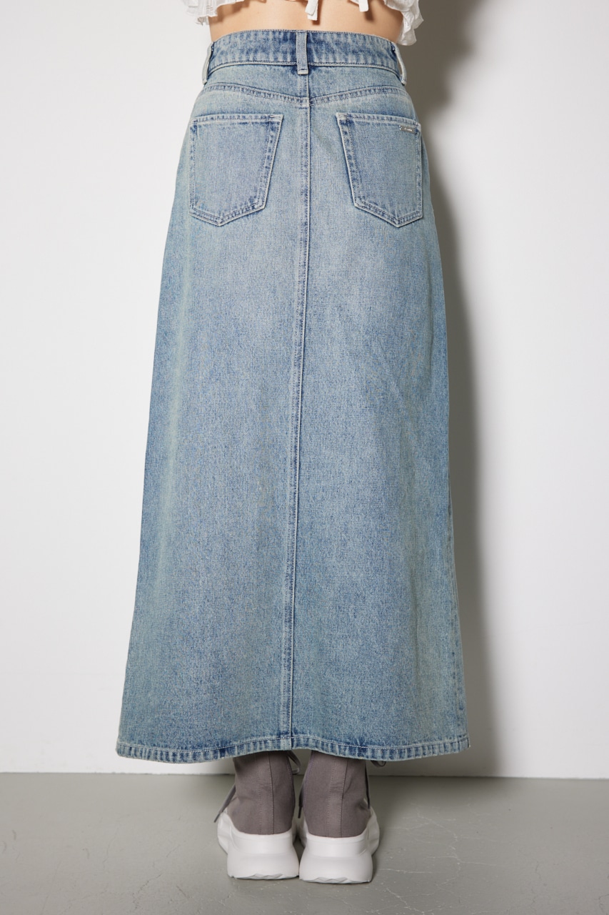 シンプルでクリーンなデザインに大胆なフロントスリットをあしらった大人のデニムスカート。