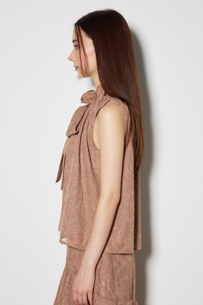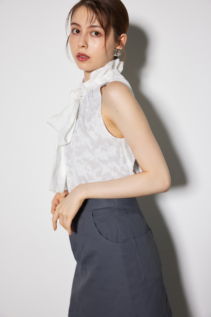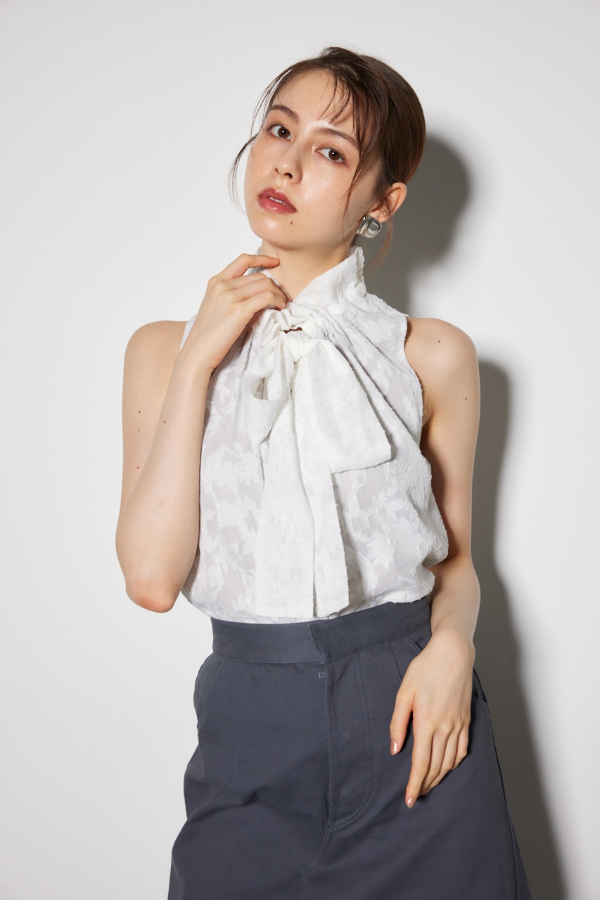 襟もとを絞ってギャザーを寄せてリボンで結ぶノースリーブのブラウスです。