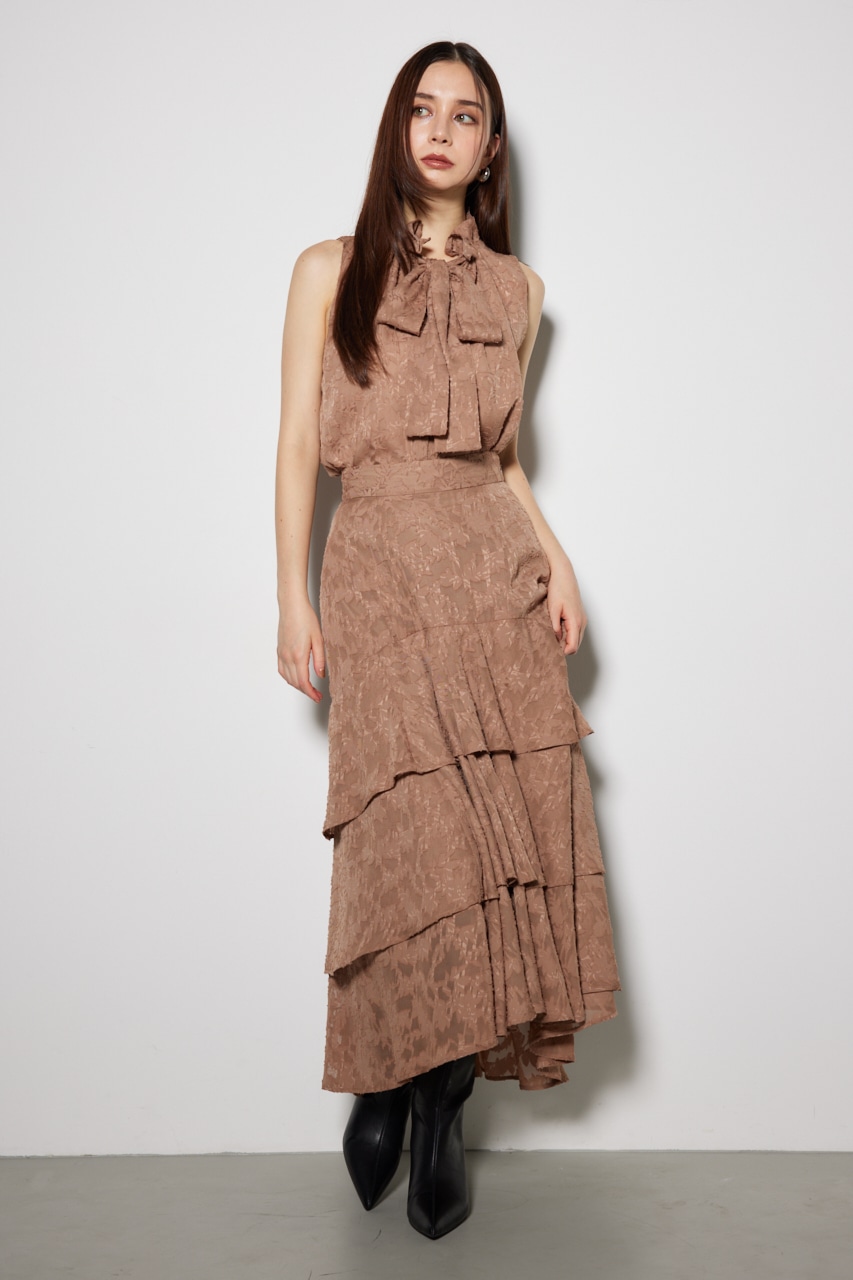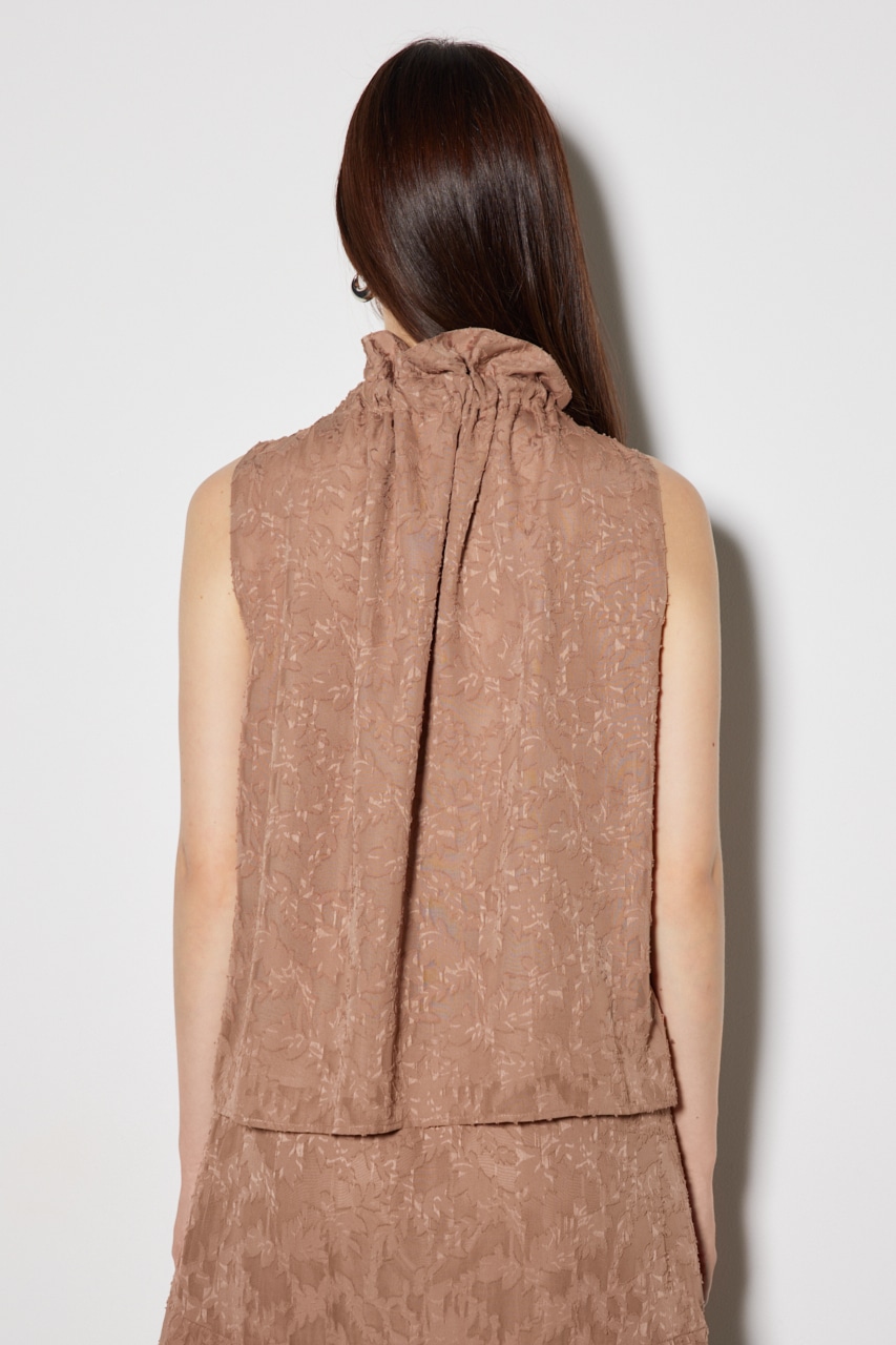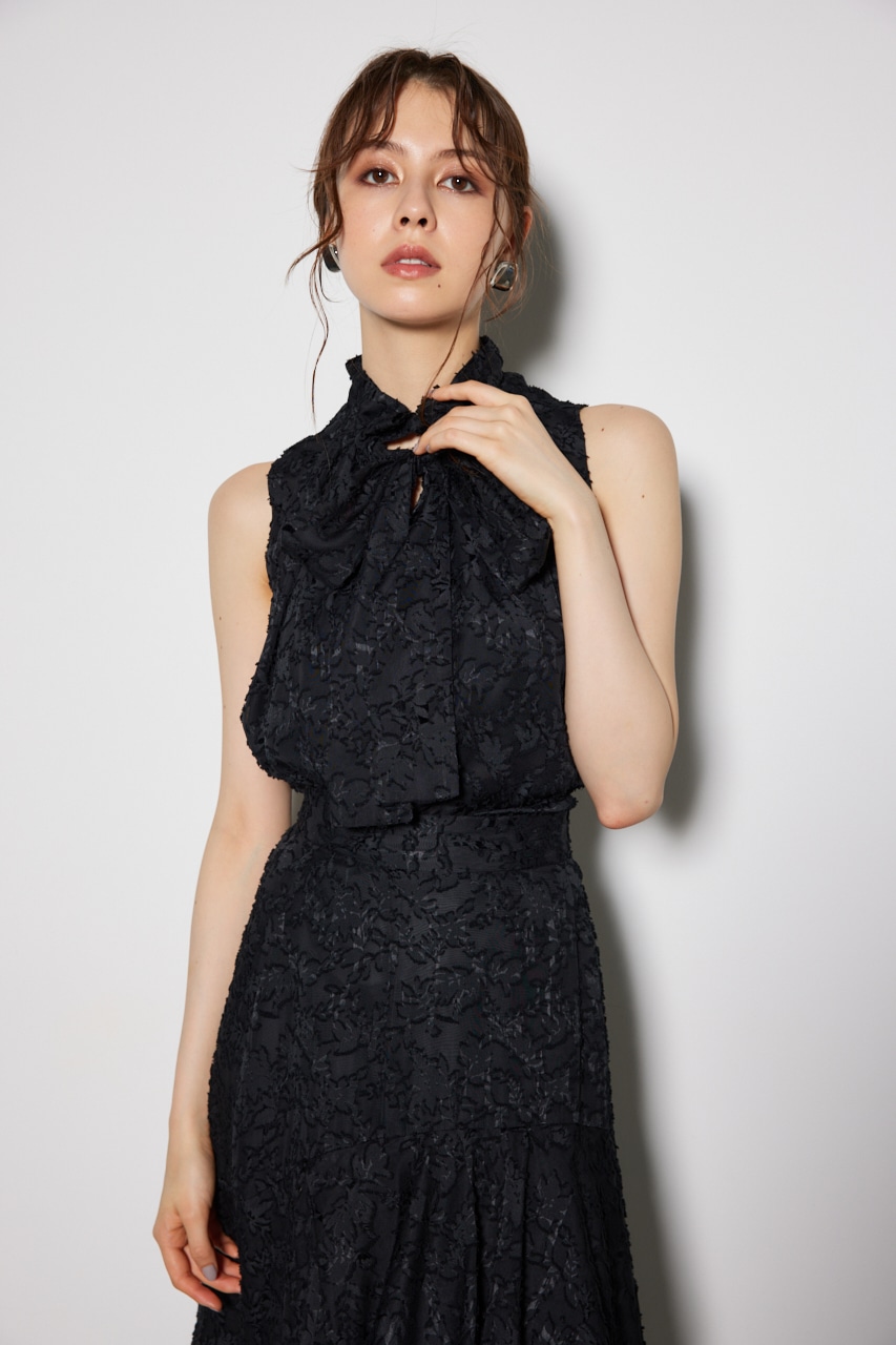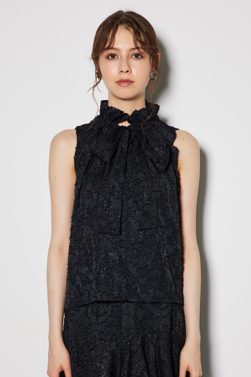 襟もとを絞ってギャザーを寄せてリボンで結ぶノースリーブのブラウスです。