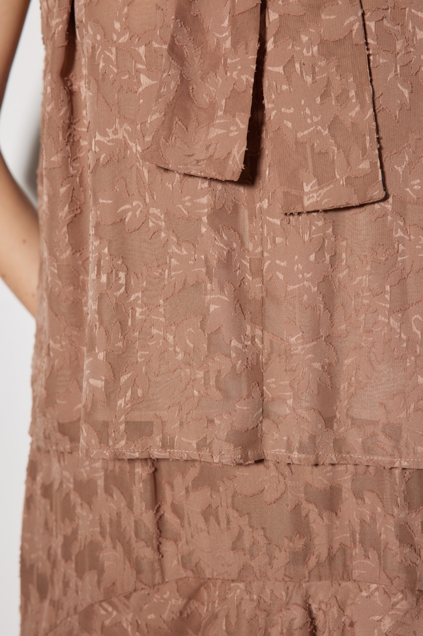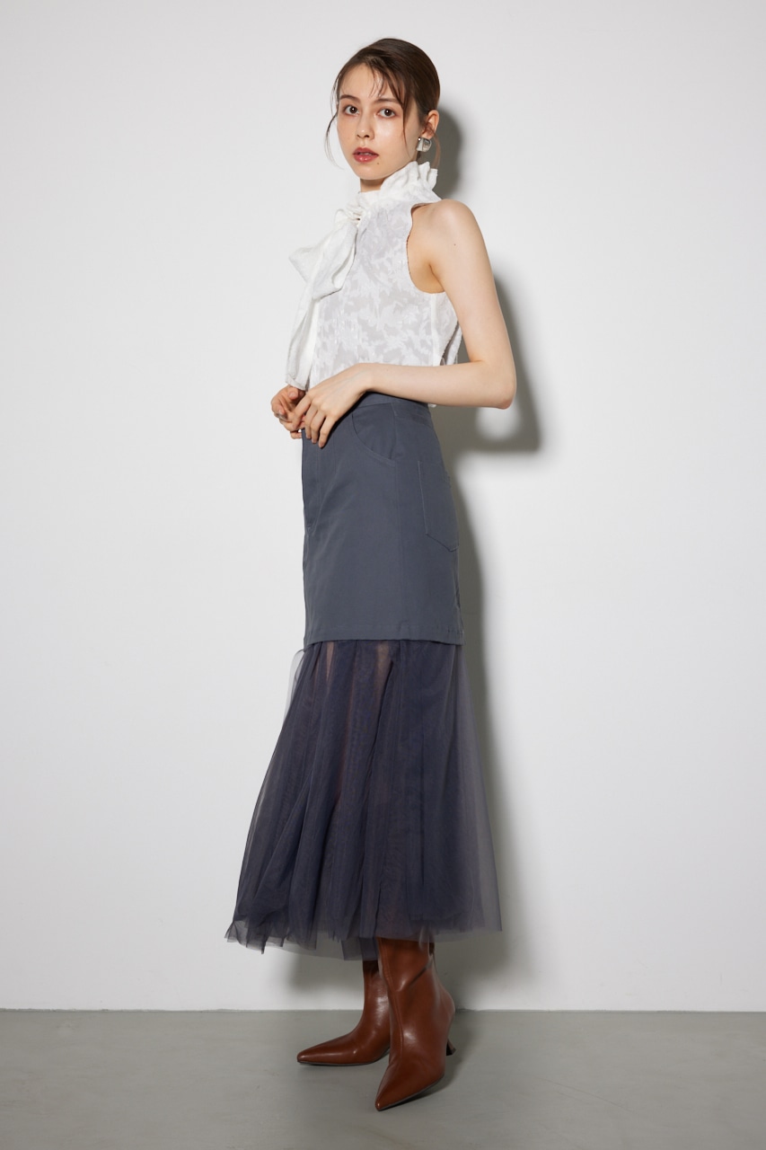 ホワイトの裏地にはあえて薄いグレーを組み合せました。表地のジャガード織りの生地の透け感もお洒落です。同じ生地のスカートも展開しており、上下で着用して頂ける他、トップスの下にはデニム合わせたり、スカートの上にはTシャツなど楽しんで着まわしてください。