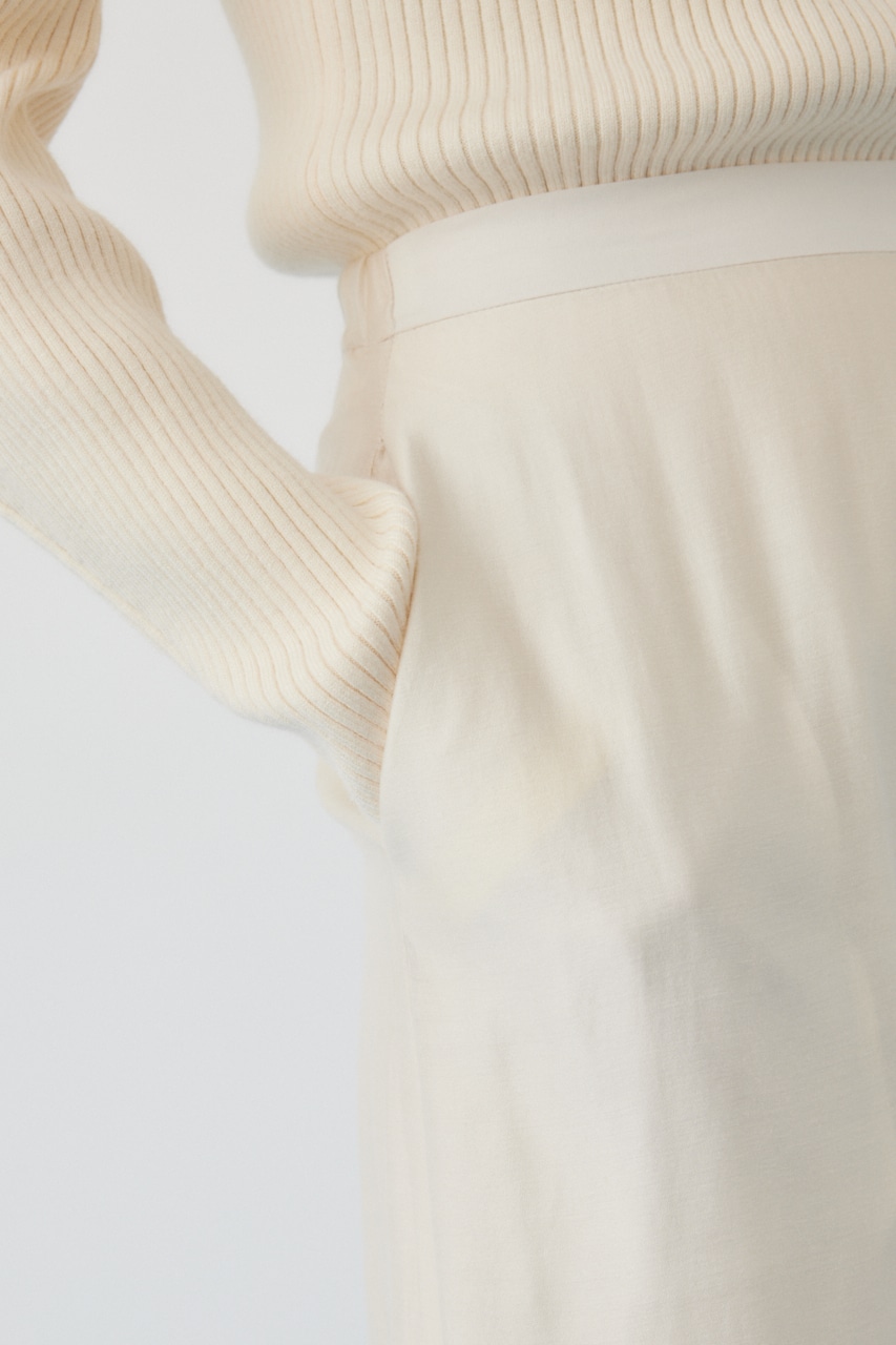 若干の光沢感のあるコットンポリエステル素材を使用。ひざ下から切り替えたフリンジディティールがどこか懐かしいビンテージ感を演出しています。