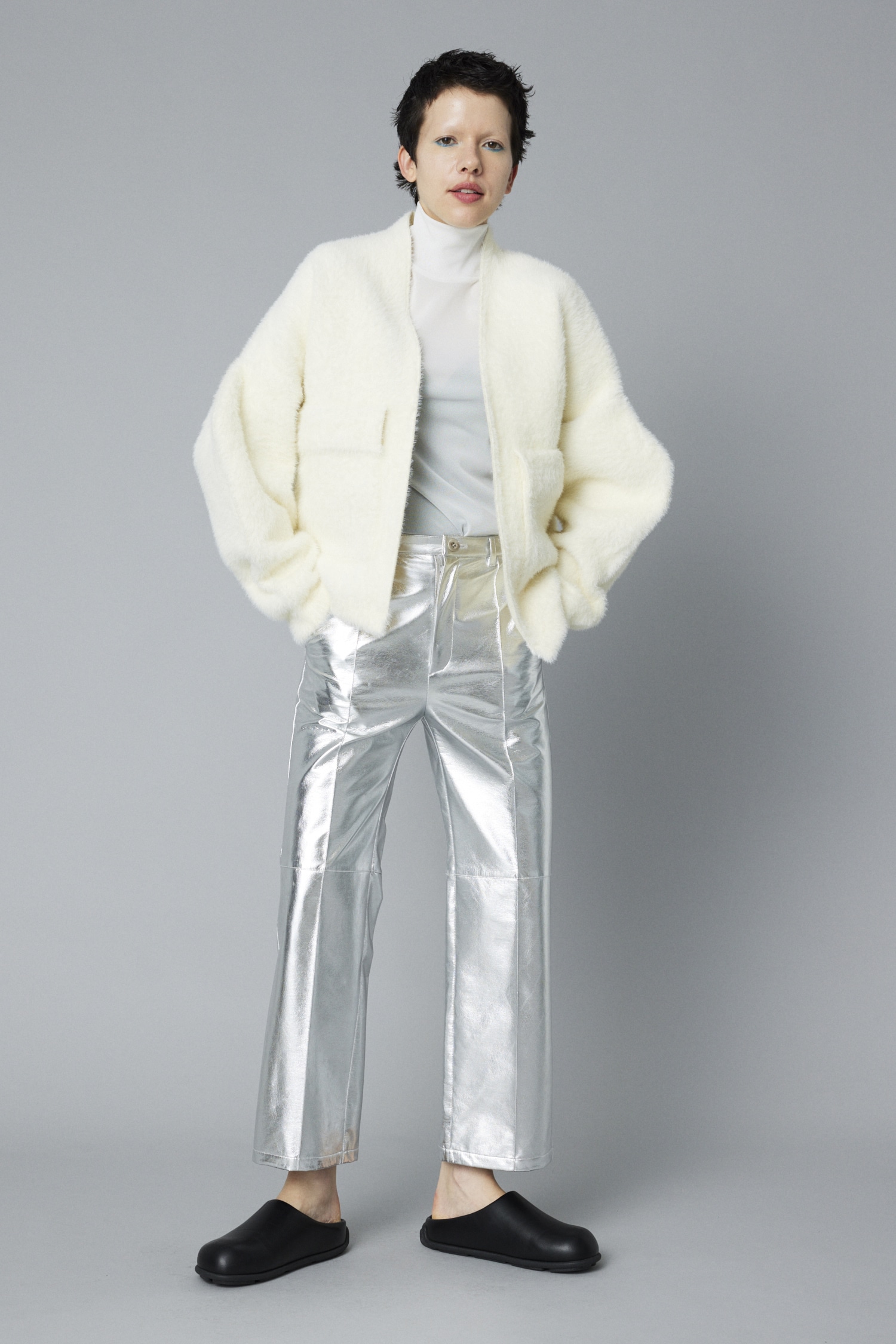 厚みのあるメタリックなフェイクレザー素材を使用したパンツで、インパクト十分なアイテムに仕上がりました。