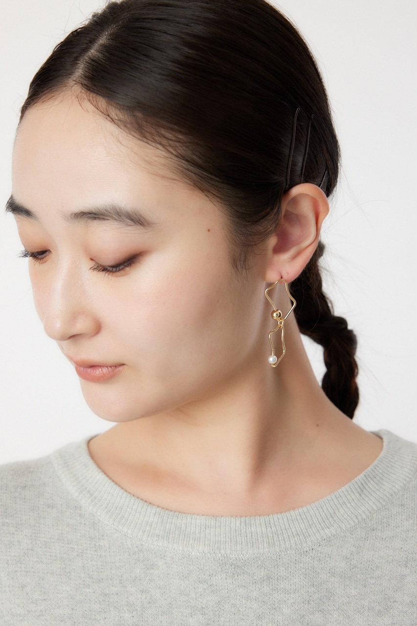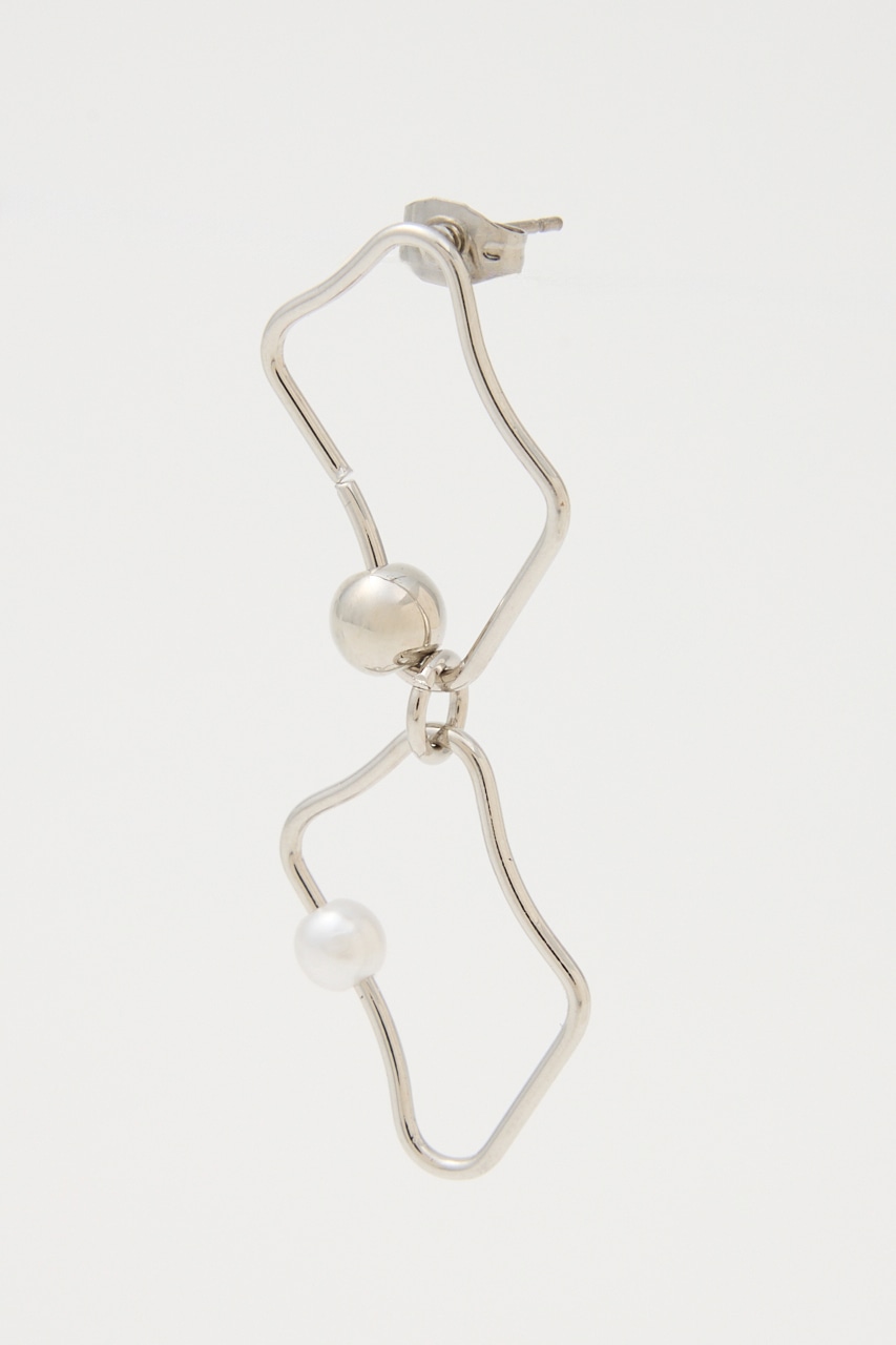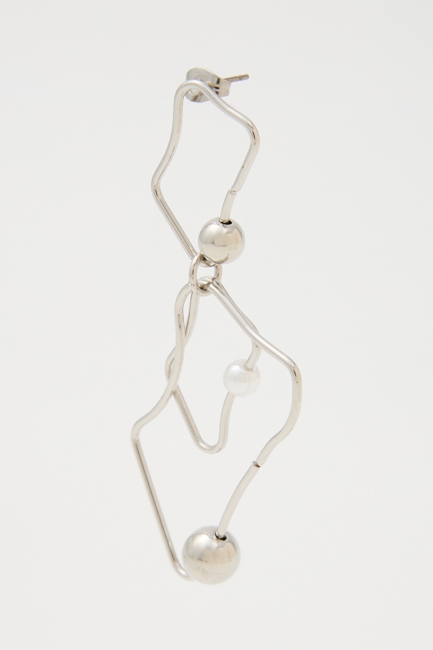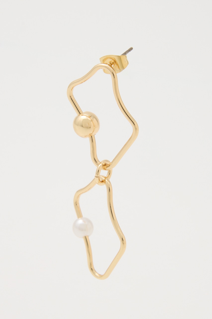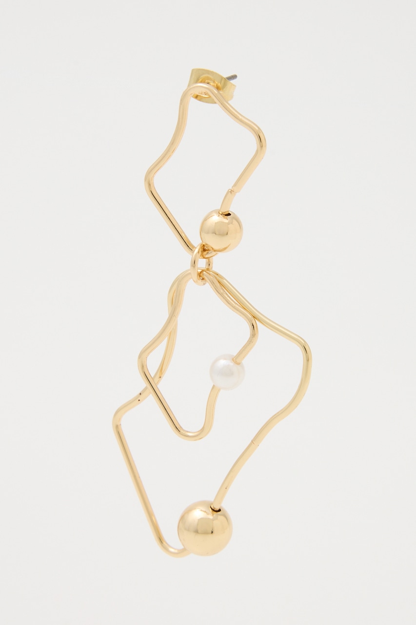 アシンメトリーに変形したピアス。華奢なフレームながらもボールとフェイクパールが存在感を引き立たせてくれます。変則的な形がスタイルにこなれ感を出し、つけるだけでグッとお洒落に。シンプルコーデにもアクセントになる個性的なアイテムです。