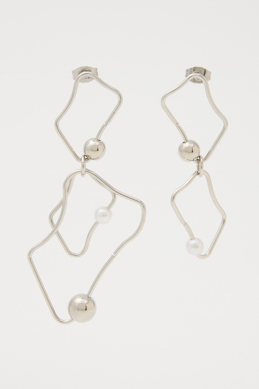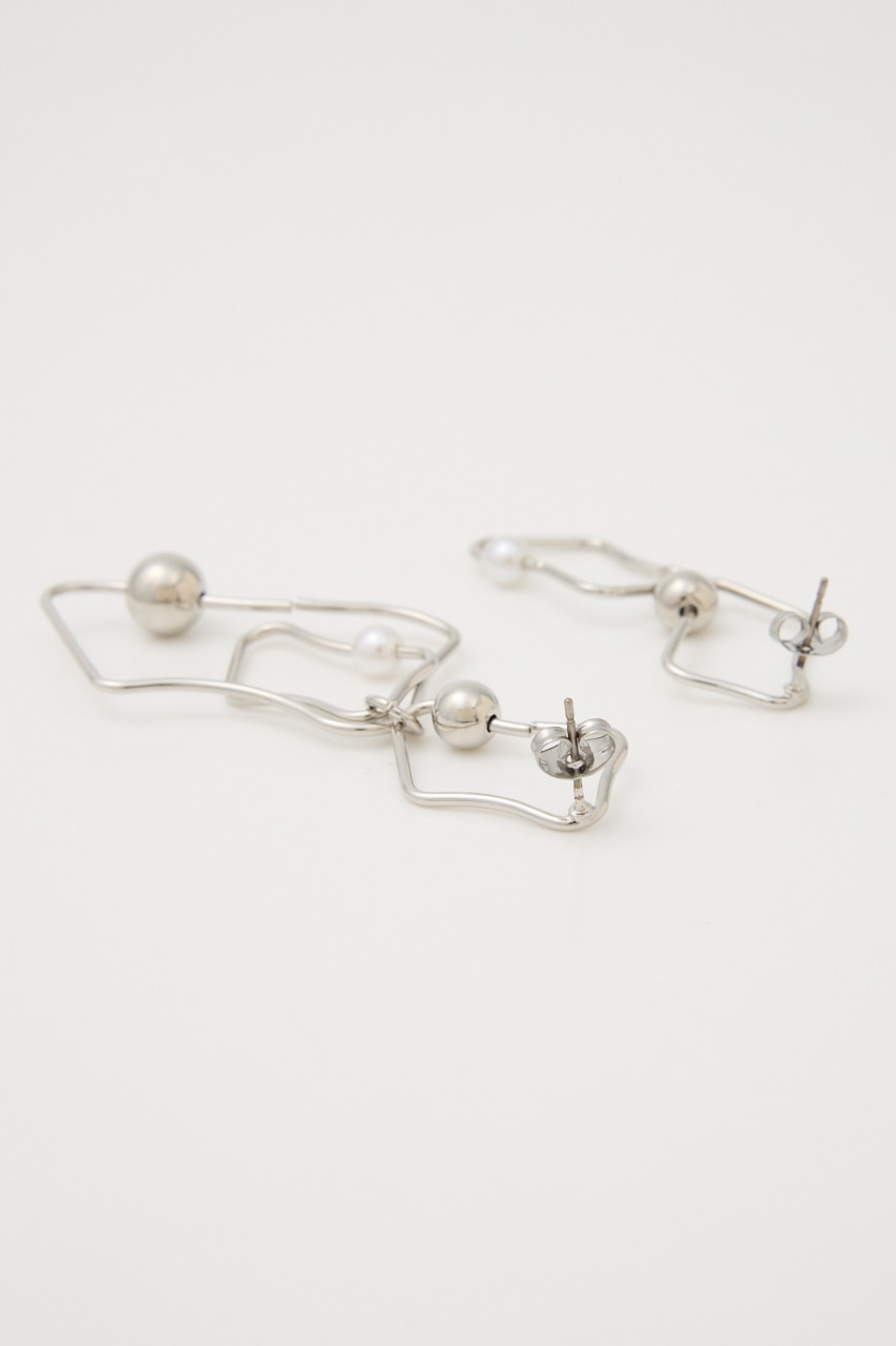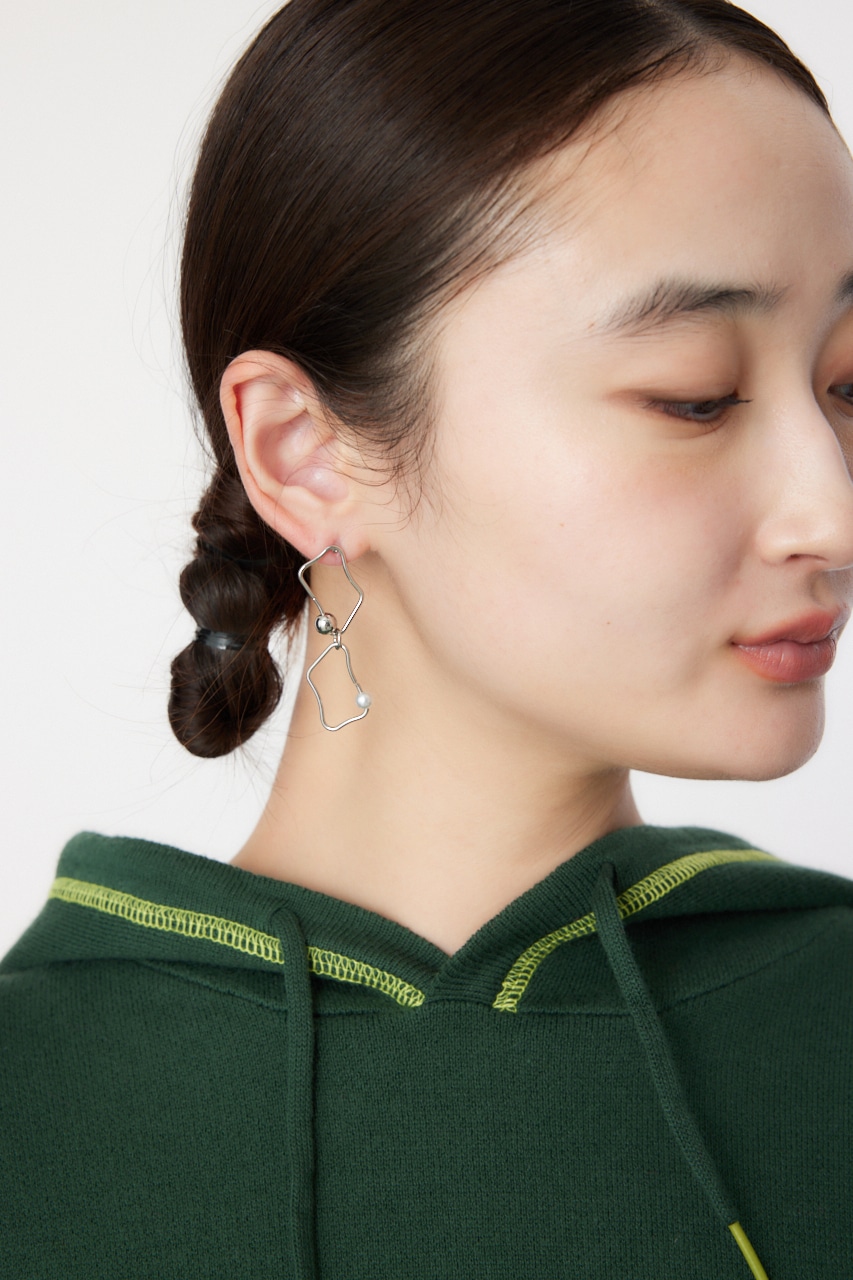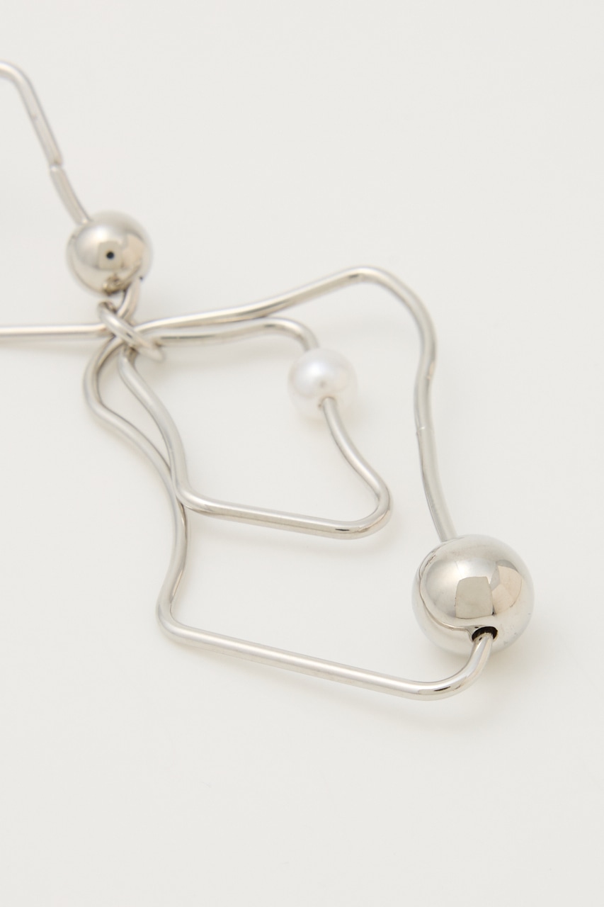 アシンメトリーに変形したピアス。華奢なフレームながらもボールとフェイクパールが存在感を引き立たせてくれます。変則的な形がスタイルにこなれ感を出し、つけるだけでグッとお洒落に。シンプルコーデにもアクセントになる個性的なアイテムです。