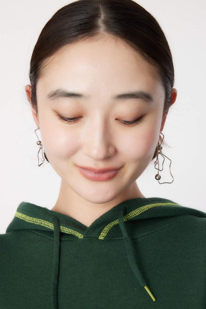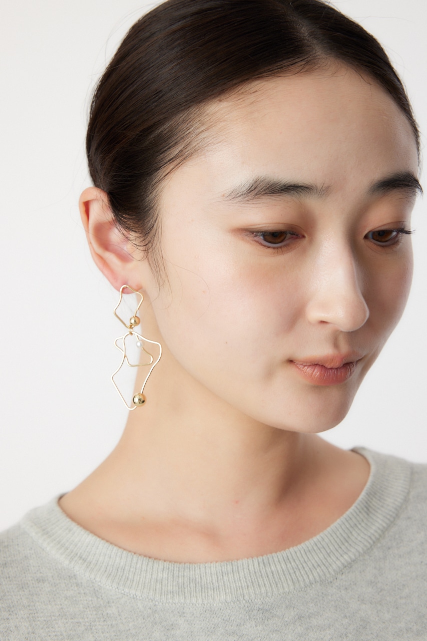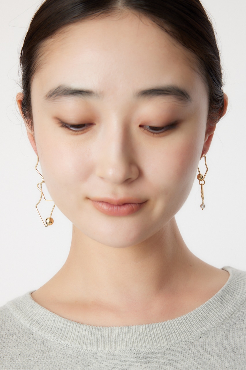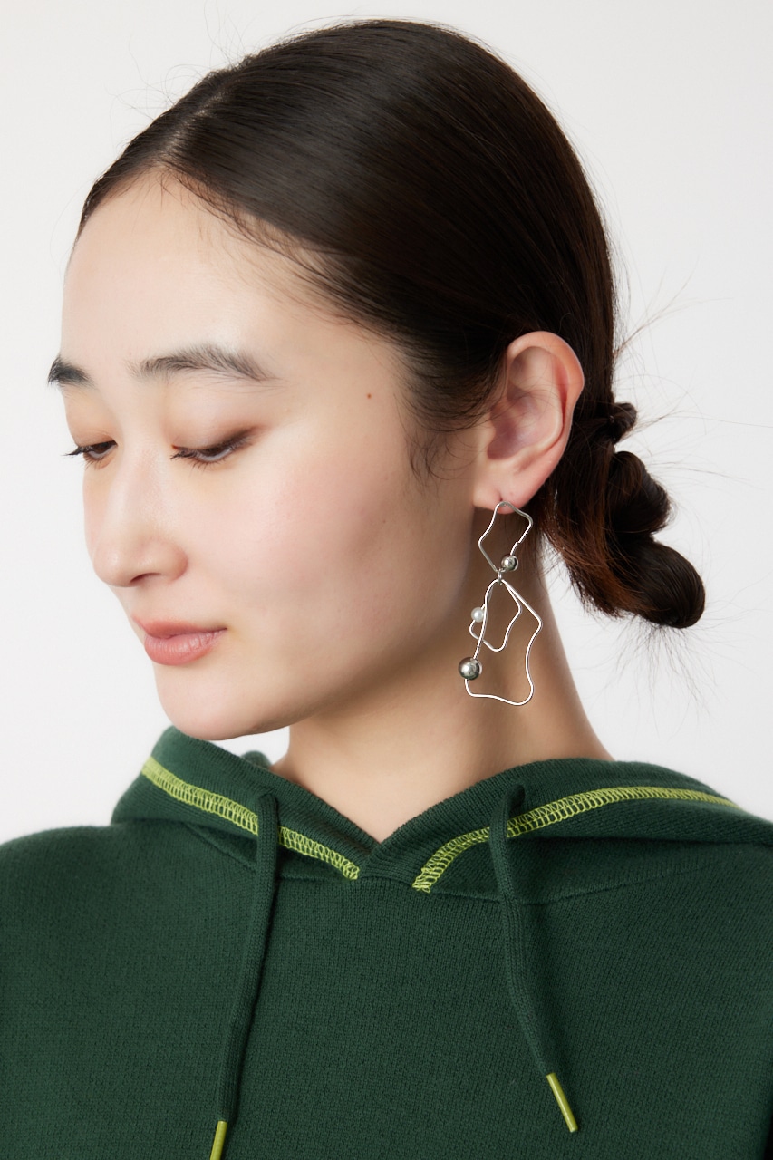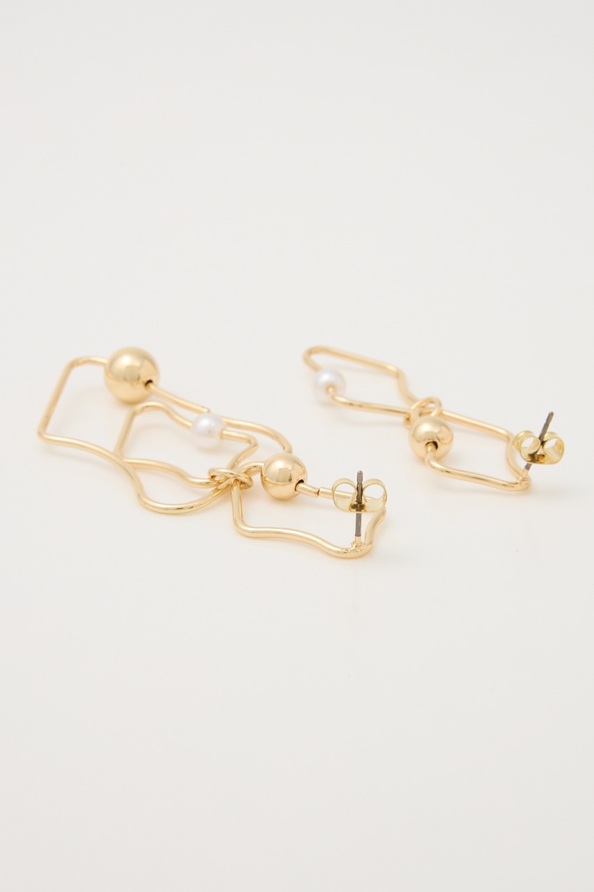 アシンメトリーに変形したピアス。華奢なフレームながらもボールとフェイクパールが存在感を引き立たせてくれます。変則的な形がスタイルにこなれ感を出し、つけるだけでグッとお洒落に。シンプルコーデにもアクセントになる個性的なアイテムです。