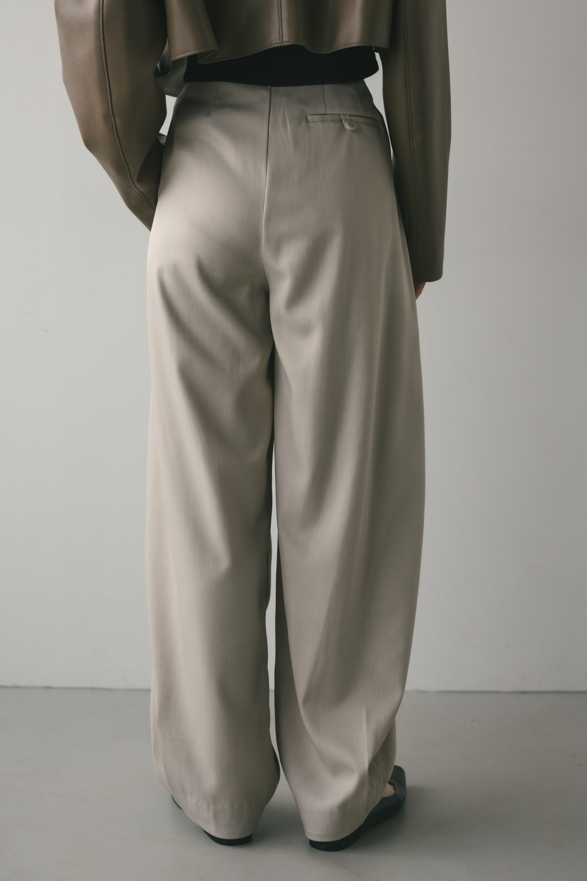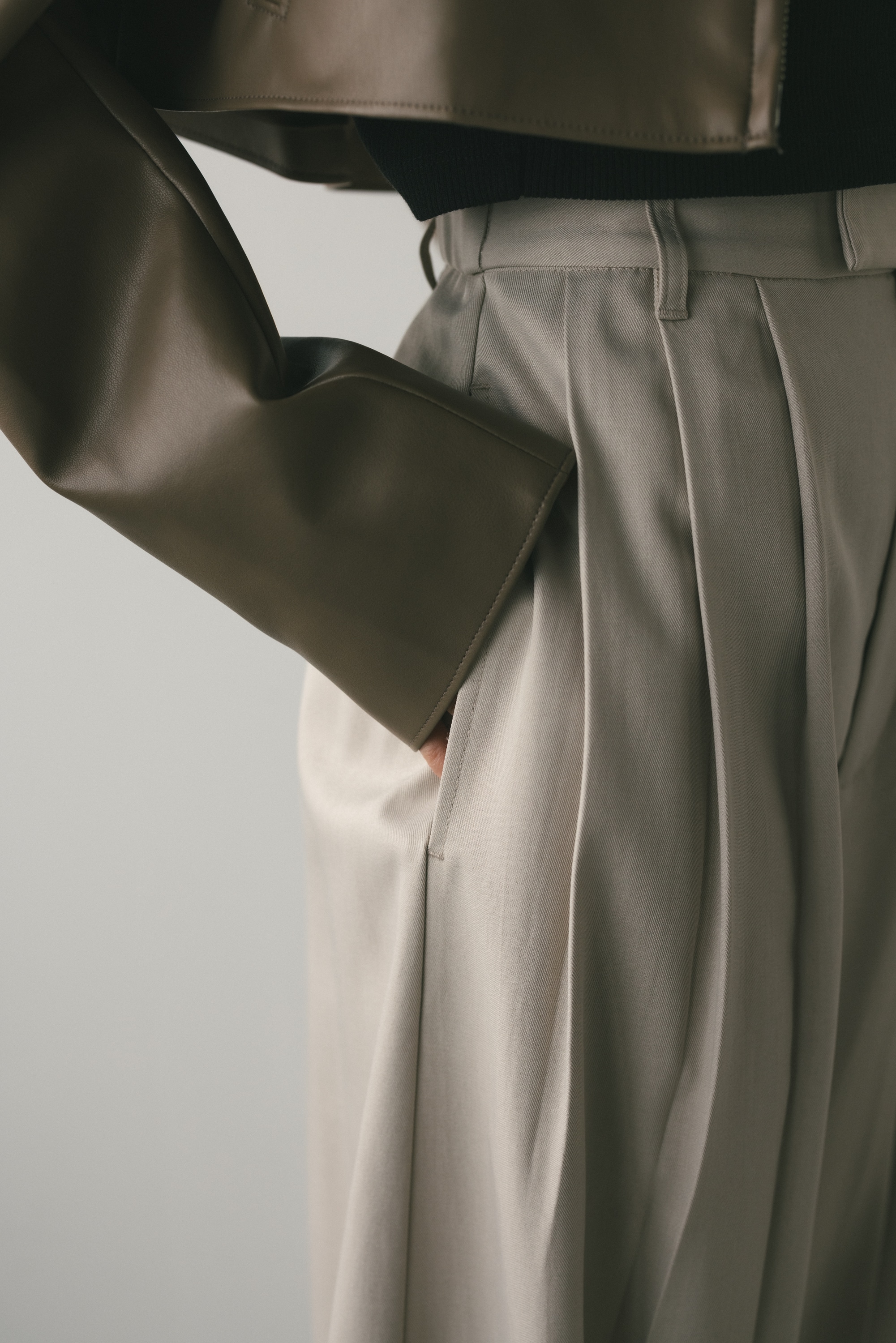 やや下目の位置で膨らみをもたせたフォルムと足元に動きが出るように施された前後の裾タックデザインにこだわったパンツ。