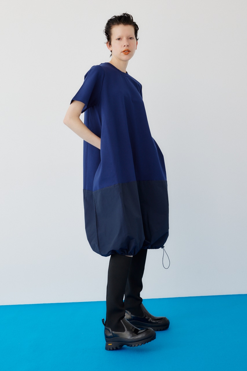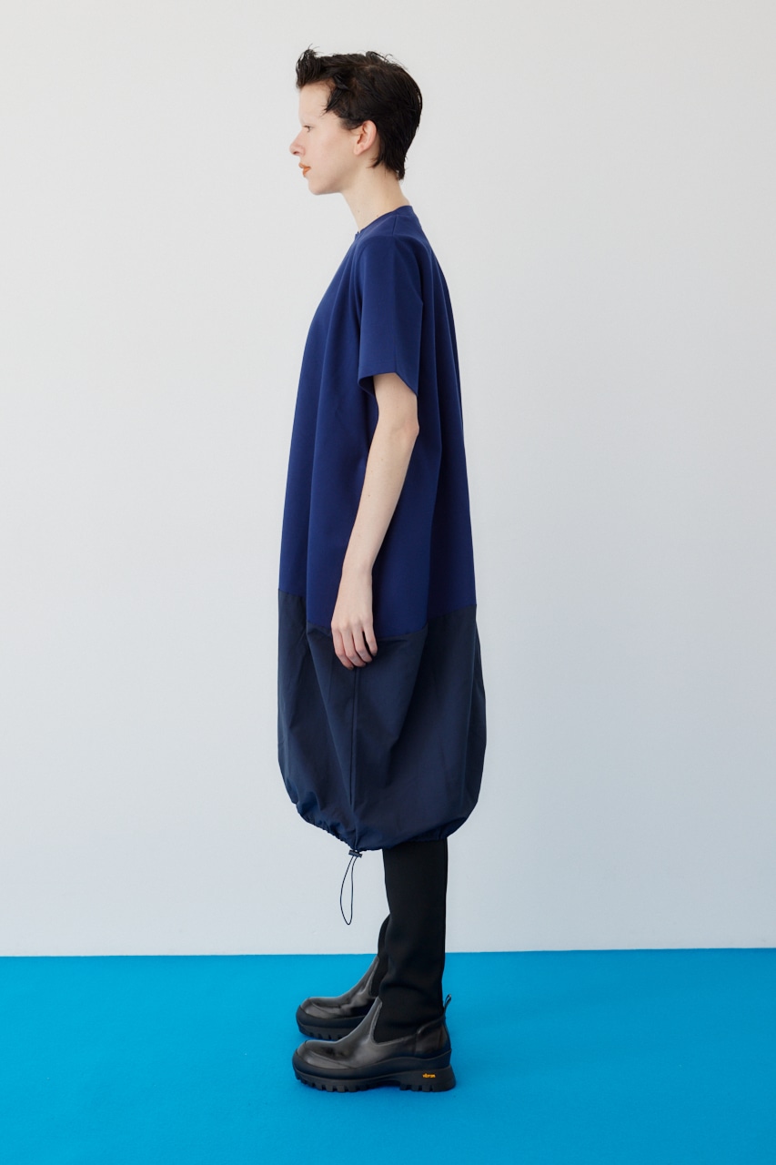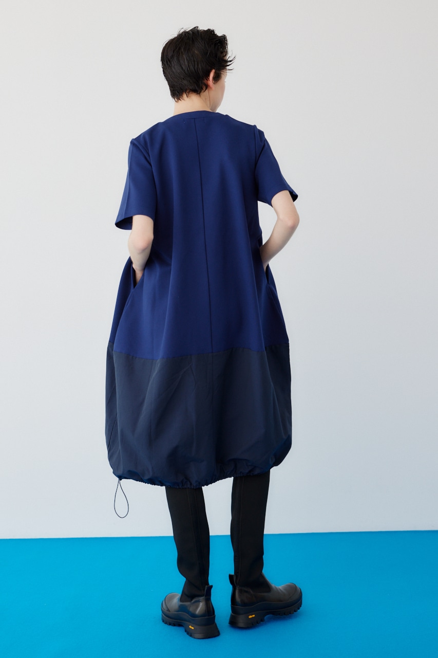 ポンチ素材と布帛を組み合わせたバルーンワンピース。
