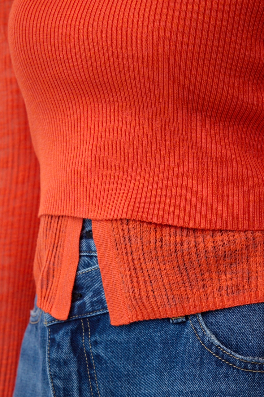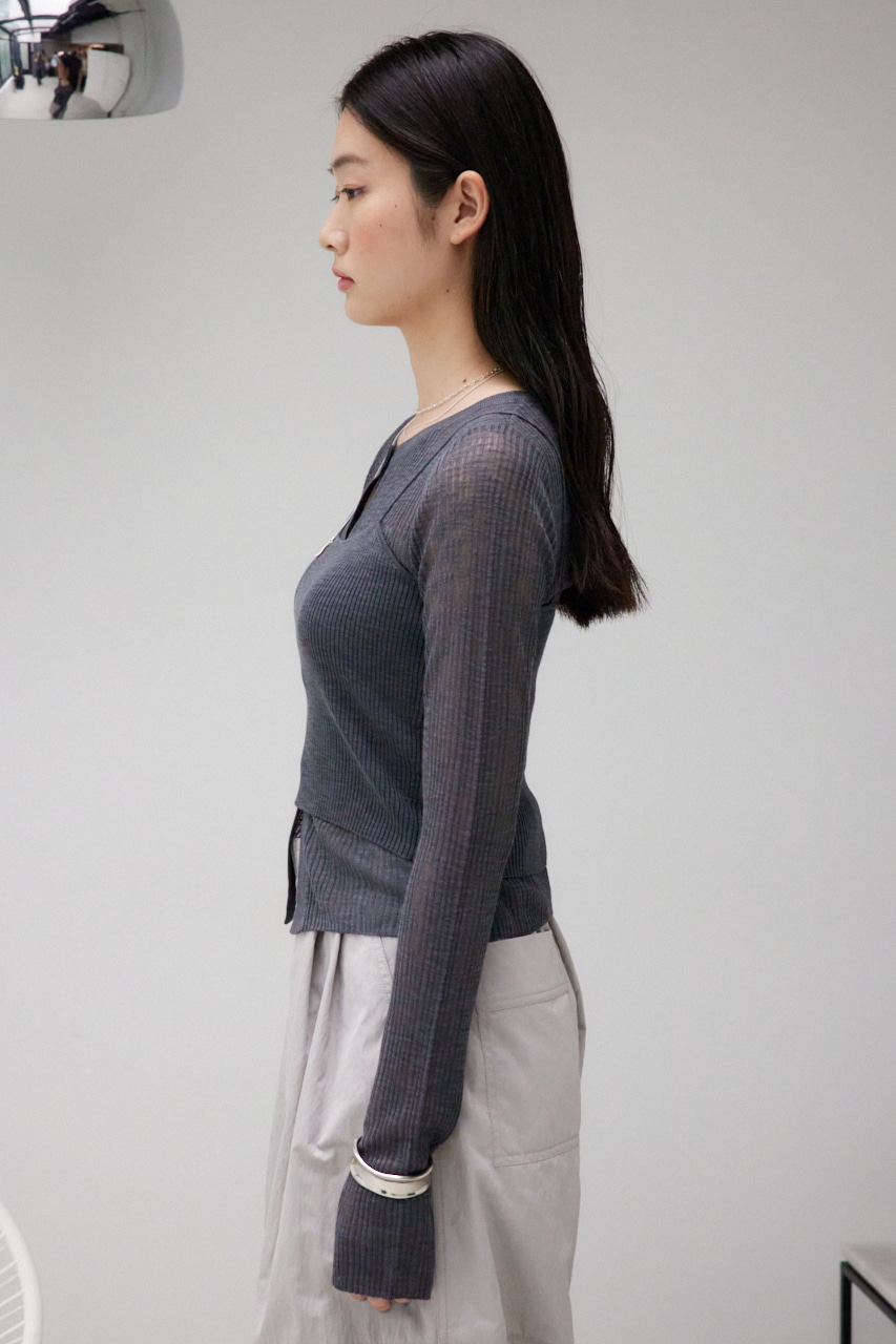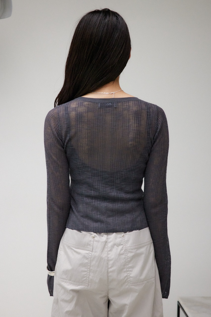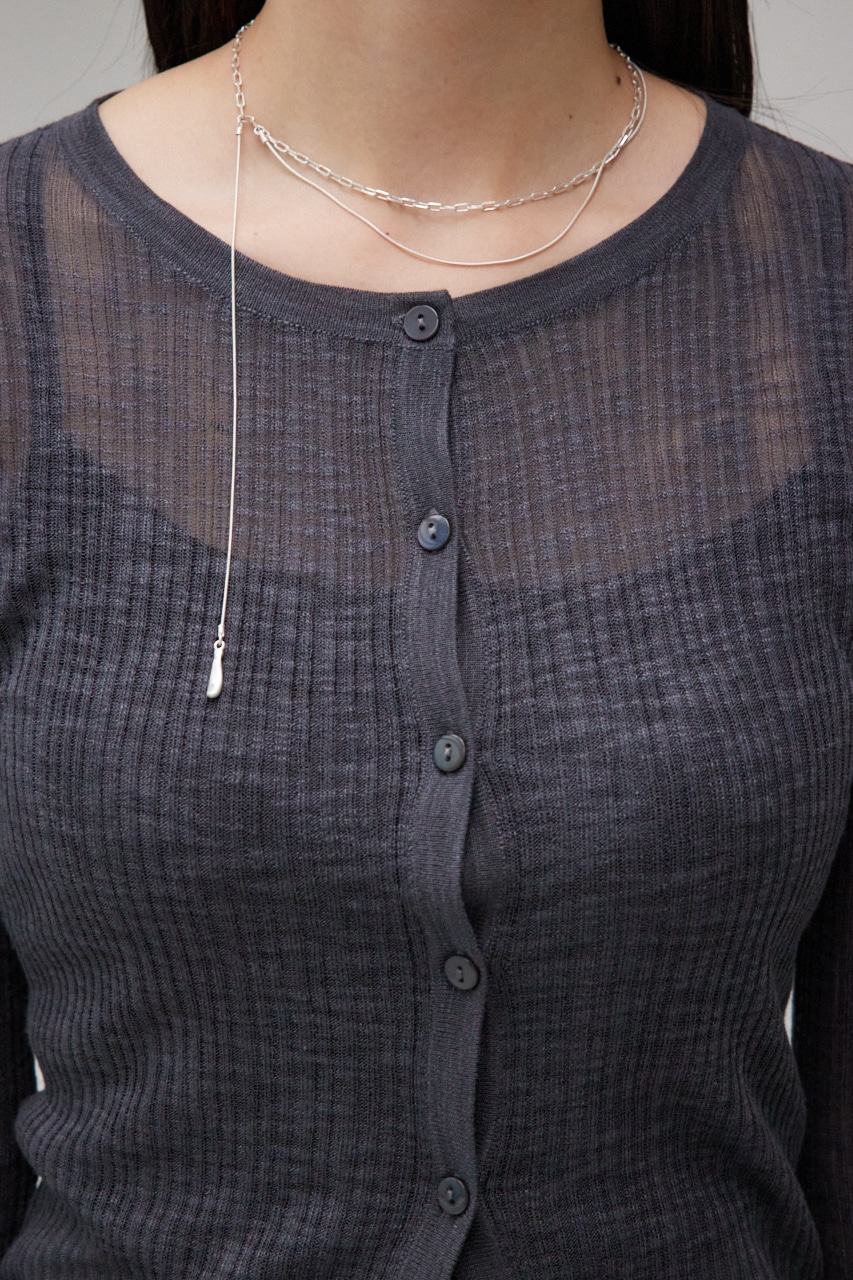 ■商品ディティール:表面感のあるリブで編み立てたカーデは 、程よい透けとコンパクトなサイズ感がポイント。