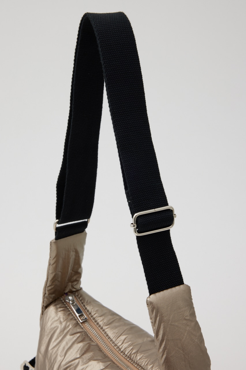 トレンドのシャイニーカラーを取り入れたデザインバッグ。中綿を入れることで丸みのあるフォルムに仕上げ、柔らかさをプラス。フロントはジップファスナー付きで、ちょっとした小物も収納できます。両サイドにもポケットが付いているので、折り畳み傘等も入れられる優れもの。コーディネートのアクセントにぴったりなアイテムです。シルバーはEC限定カラーになります。
