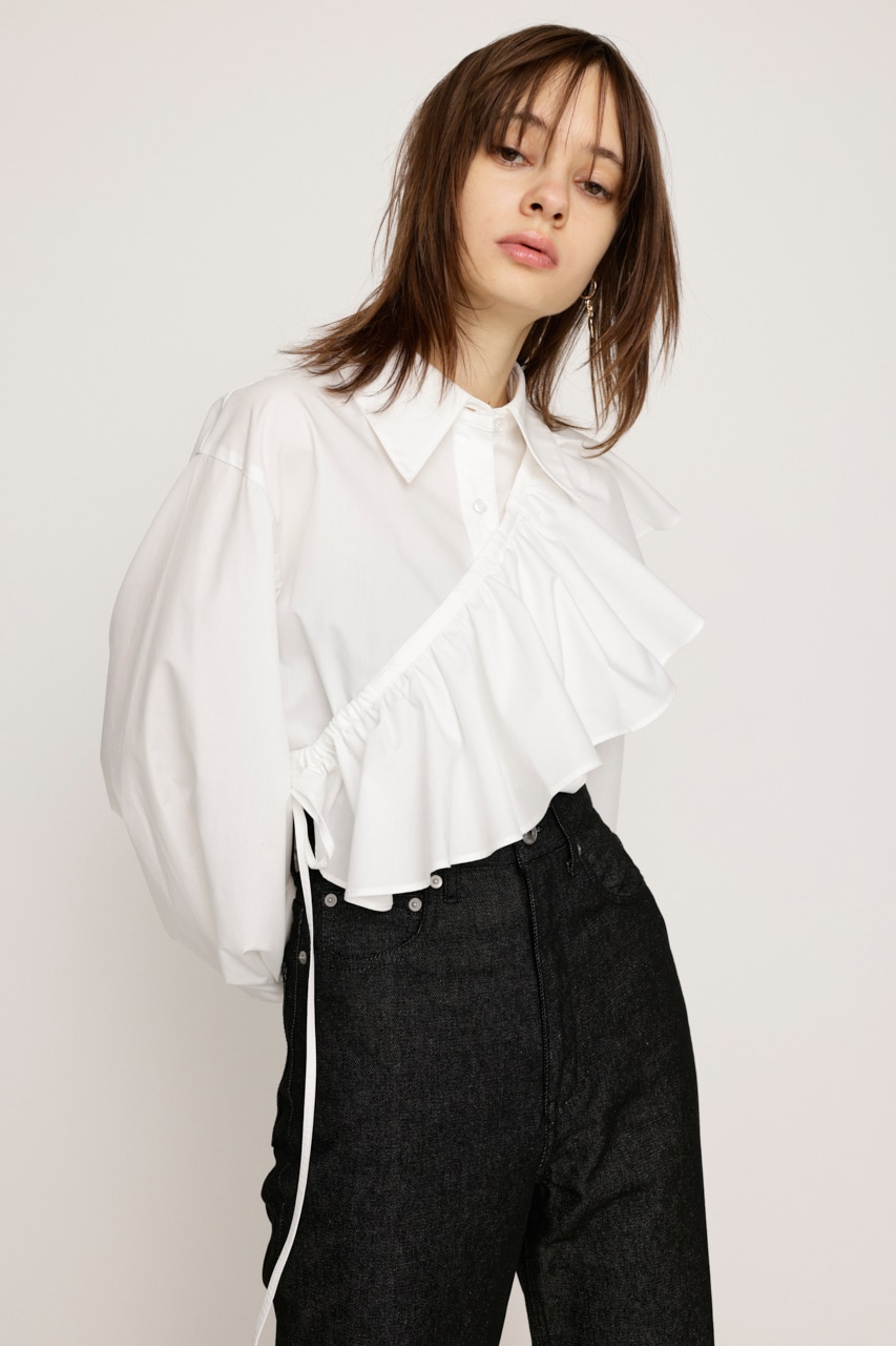 ■DETAIL:大きめのフリルとボリューミーなスリーブがレディライクな印象に。程よいハリのある素材でガーリーになり過ぎず、モードな雰囲気も演出してくれます。