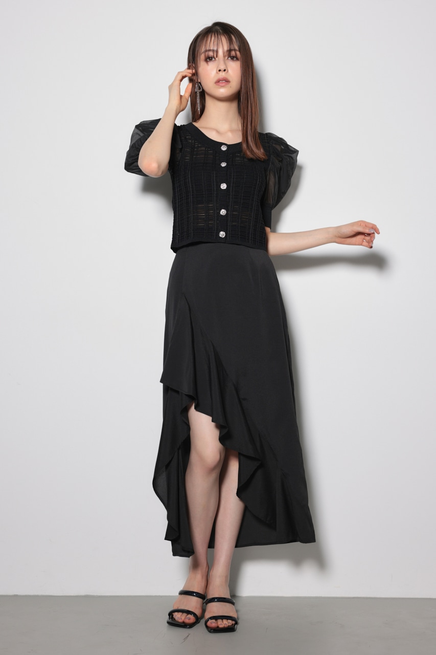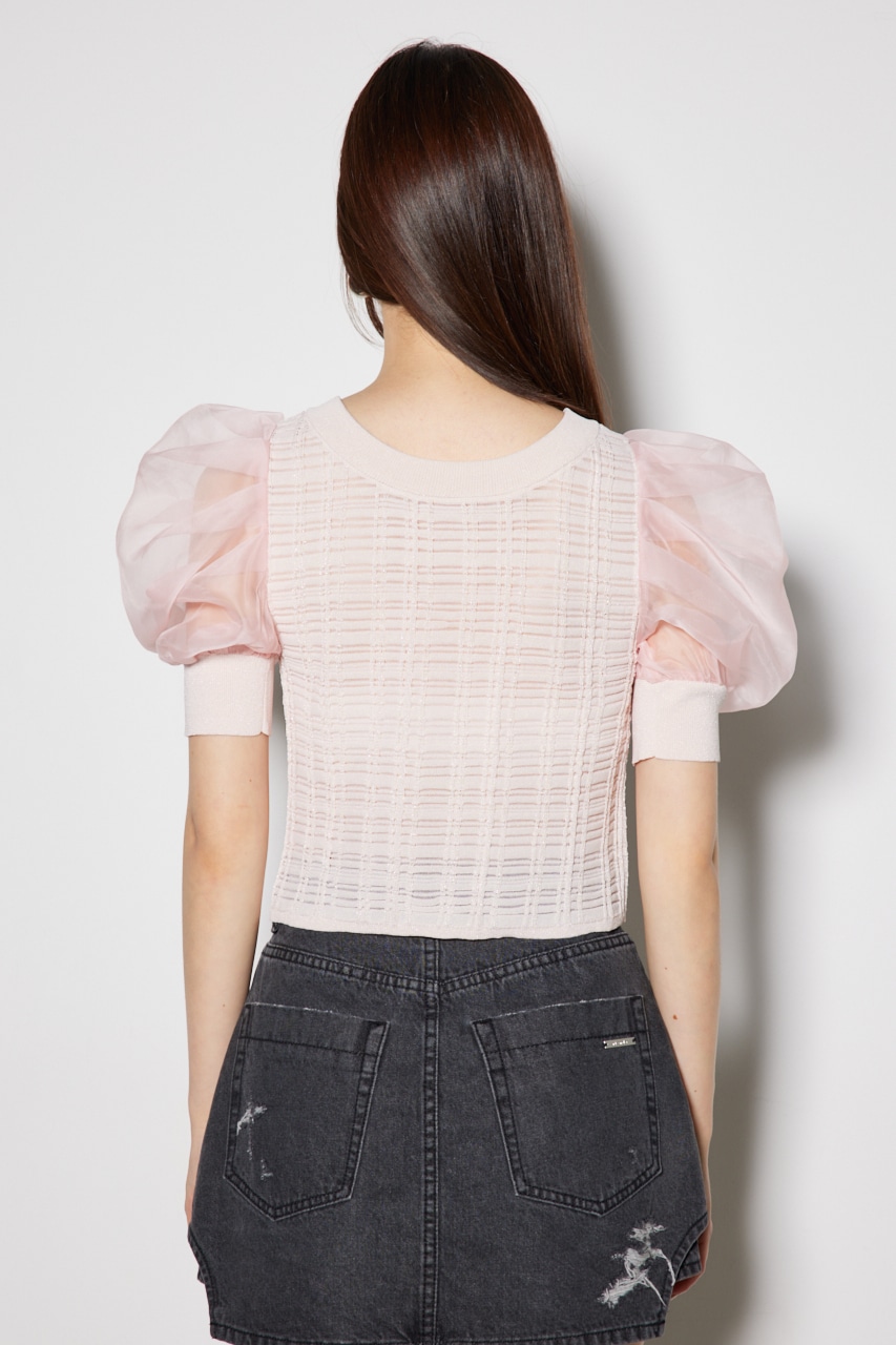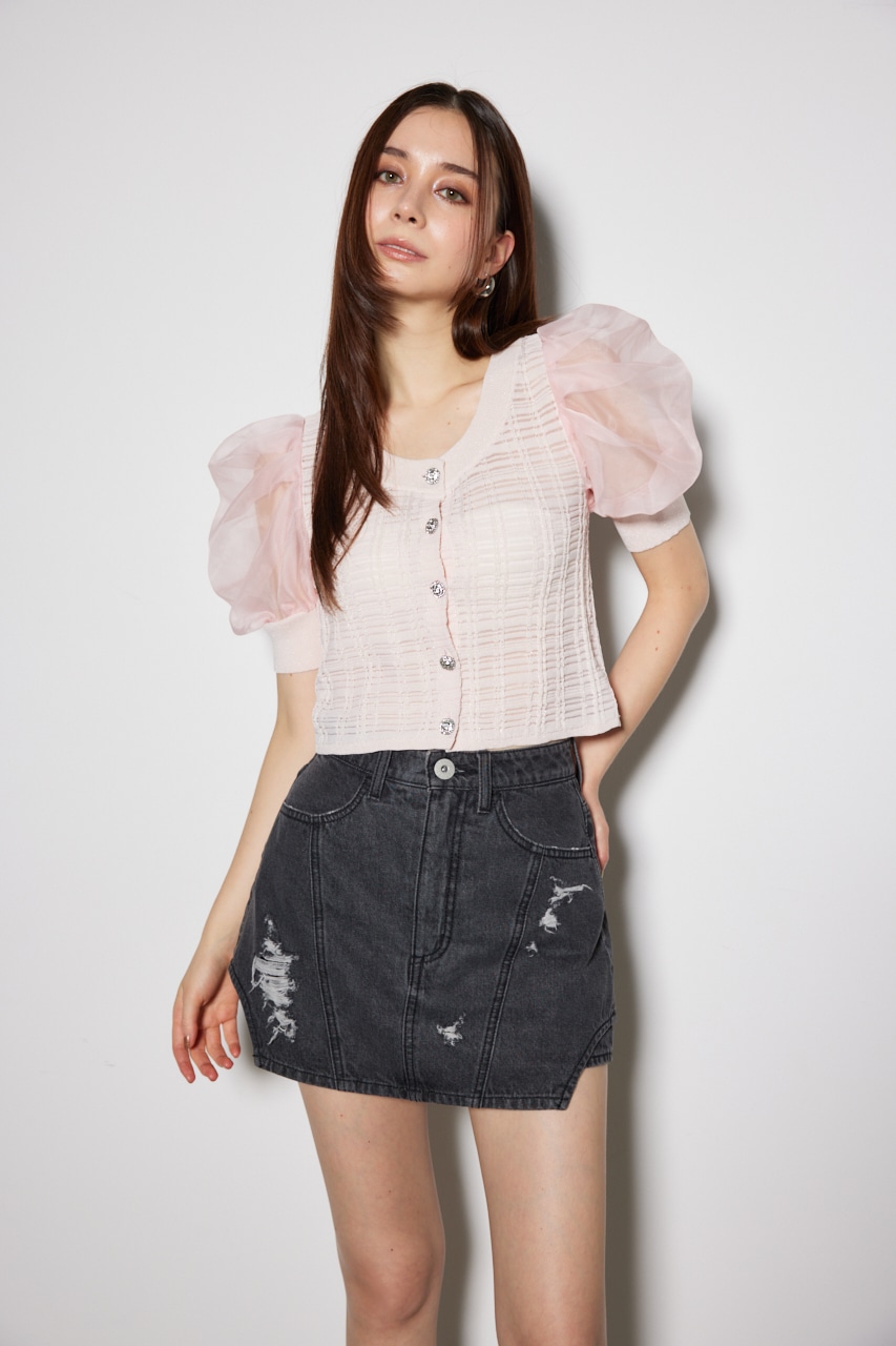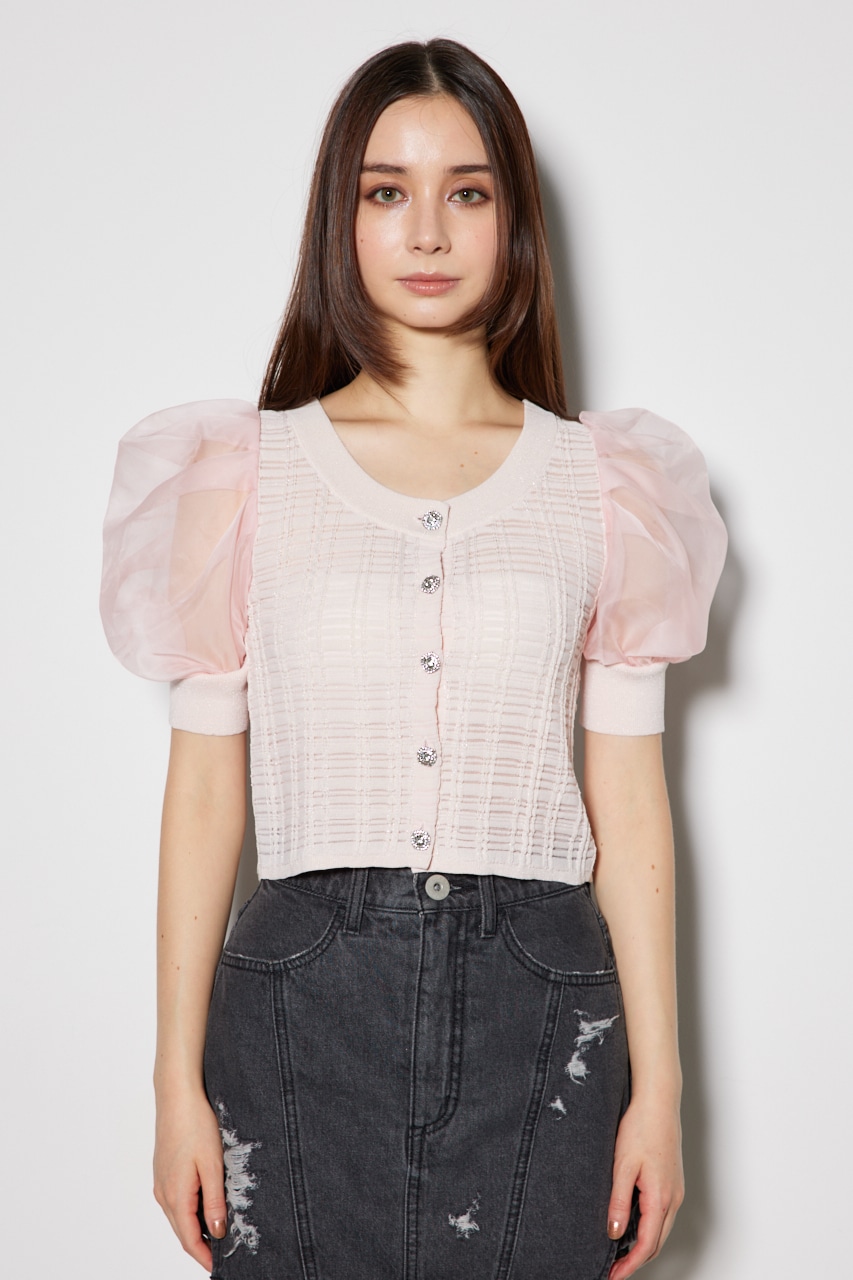 透け感のあるチェックの編み地のニットに、今らしいビジューボタンに