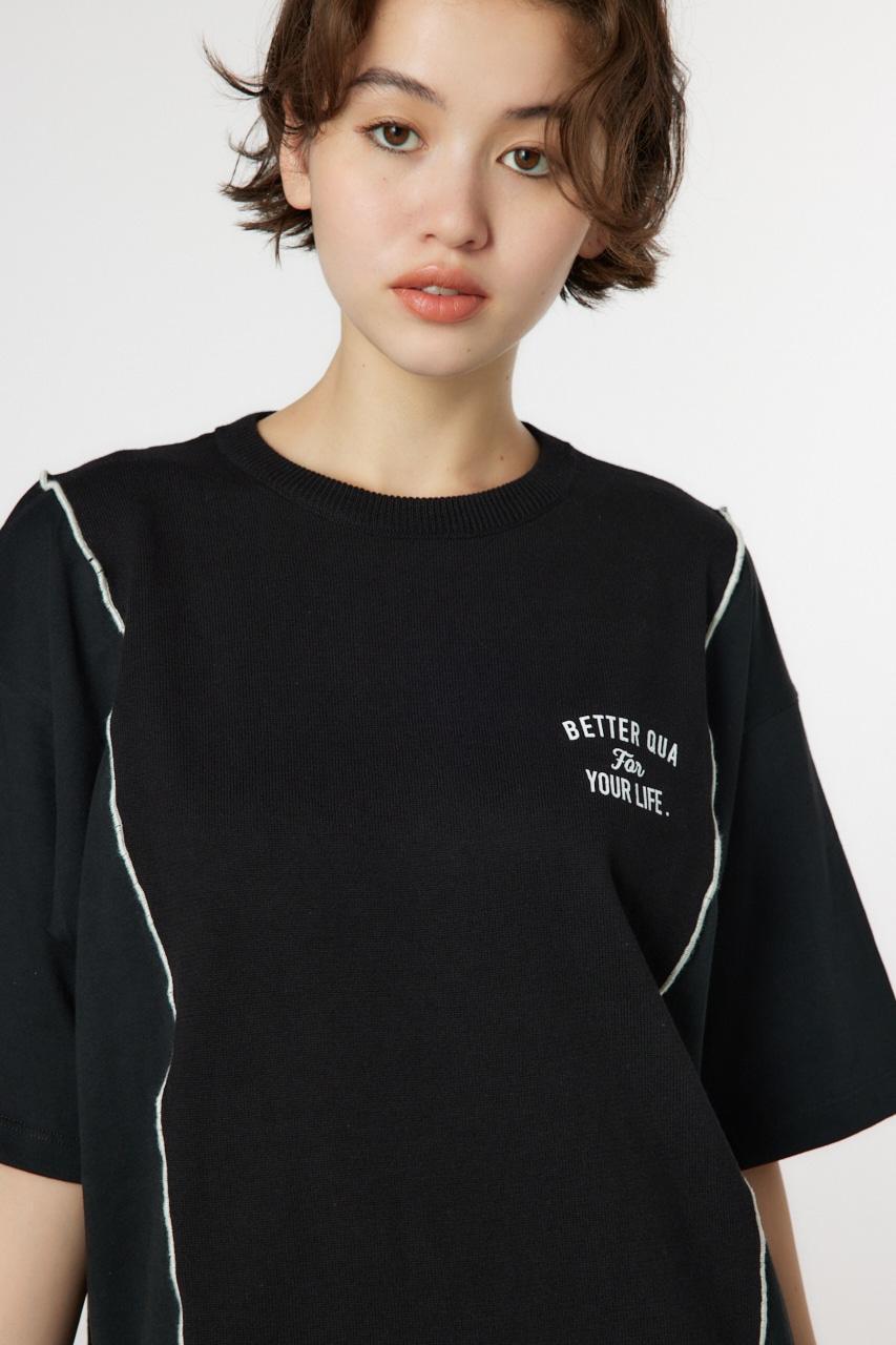 ニット素材とカット素材をドッキングしたTワンピース。ニットとカットの繋ぎ目にメロウラインを入れてアクセントに。同色のドッキングなので派手すぎず、さりげないポイントが可愛いアイテムです。