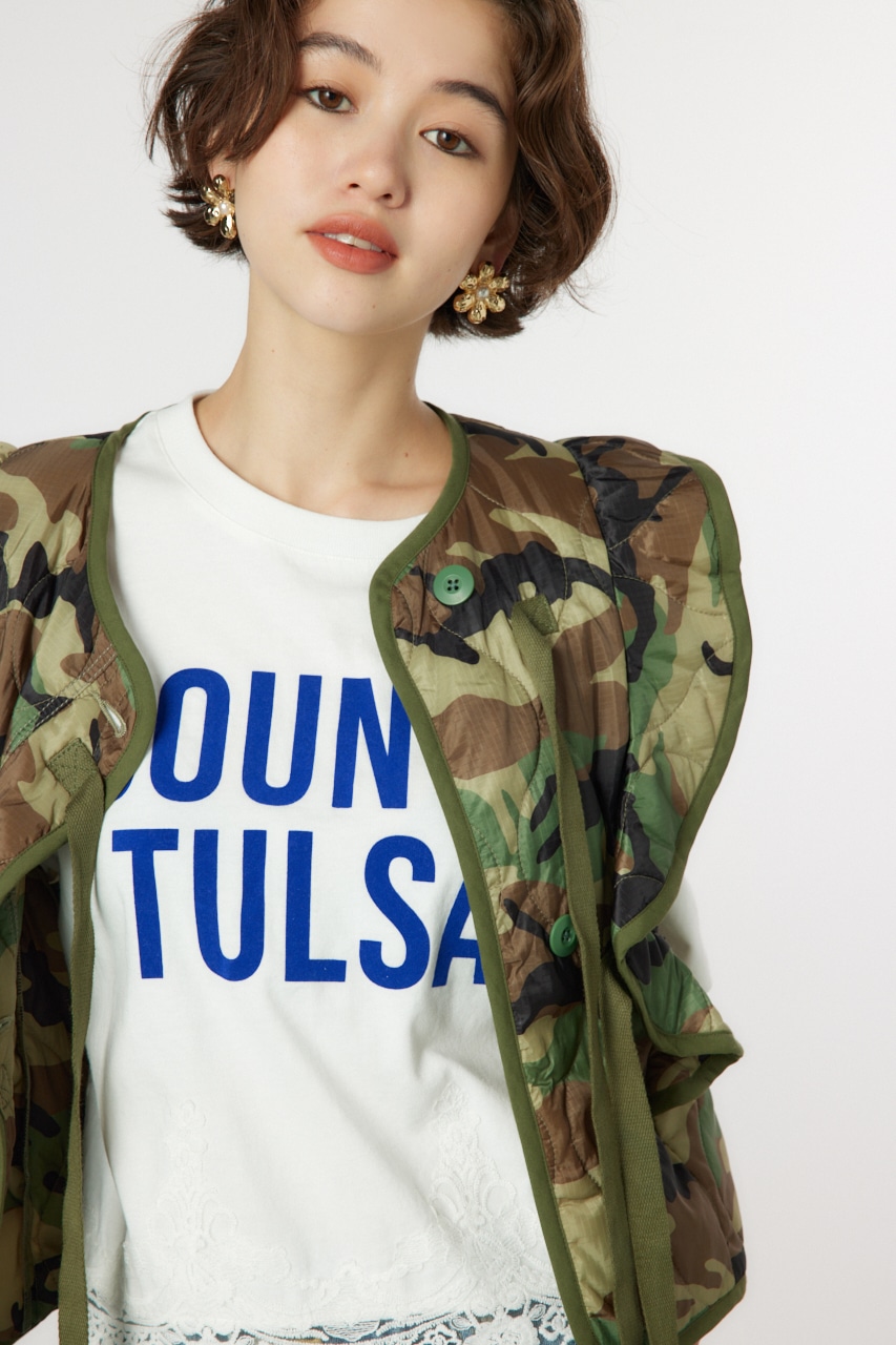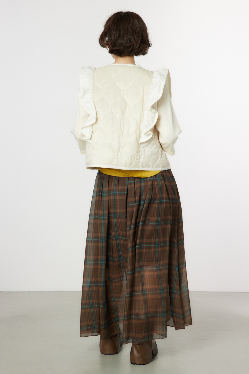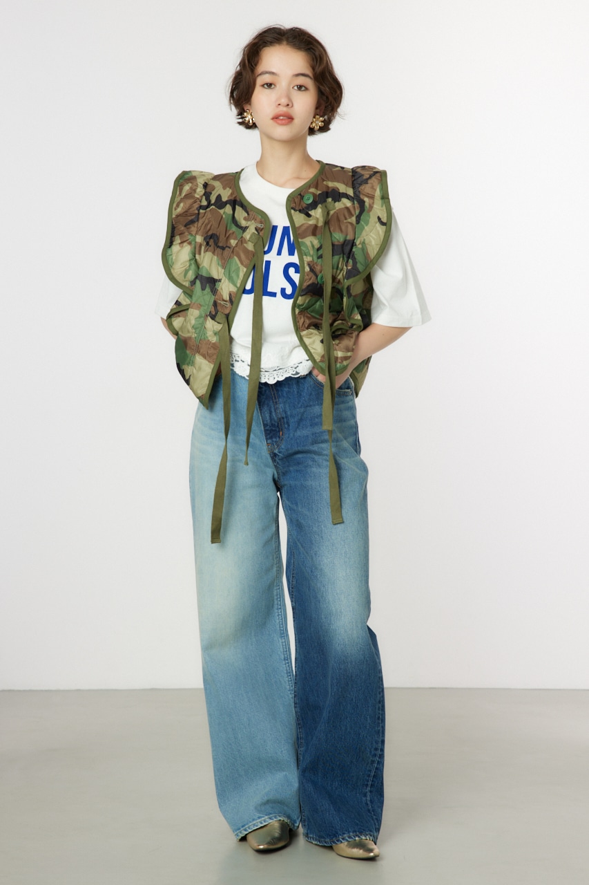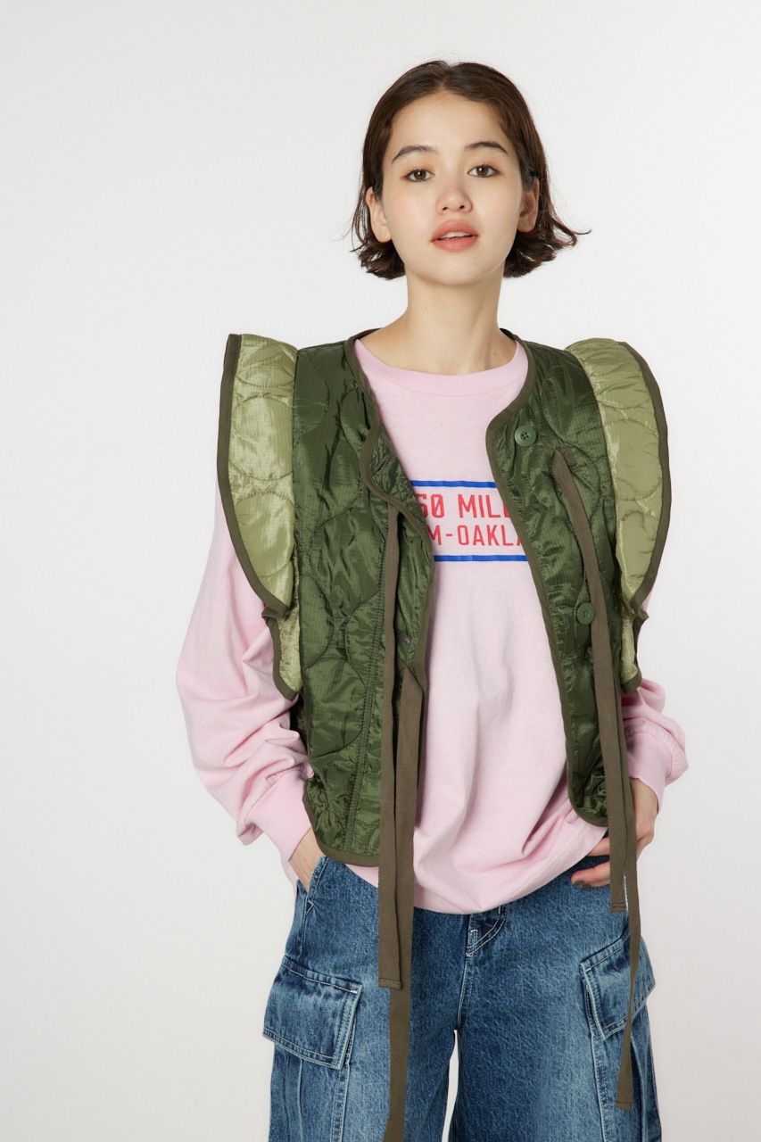 キルティングベストにフリルをドッキングして、ガーリーなイメージに仕上げたアイテム。ワンピースの上や、グラフィックTシャツの上に羽織るのがおすすめ。