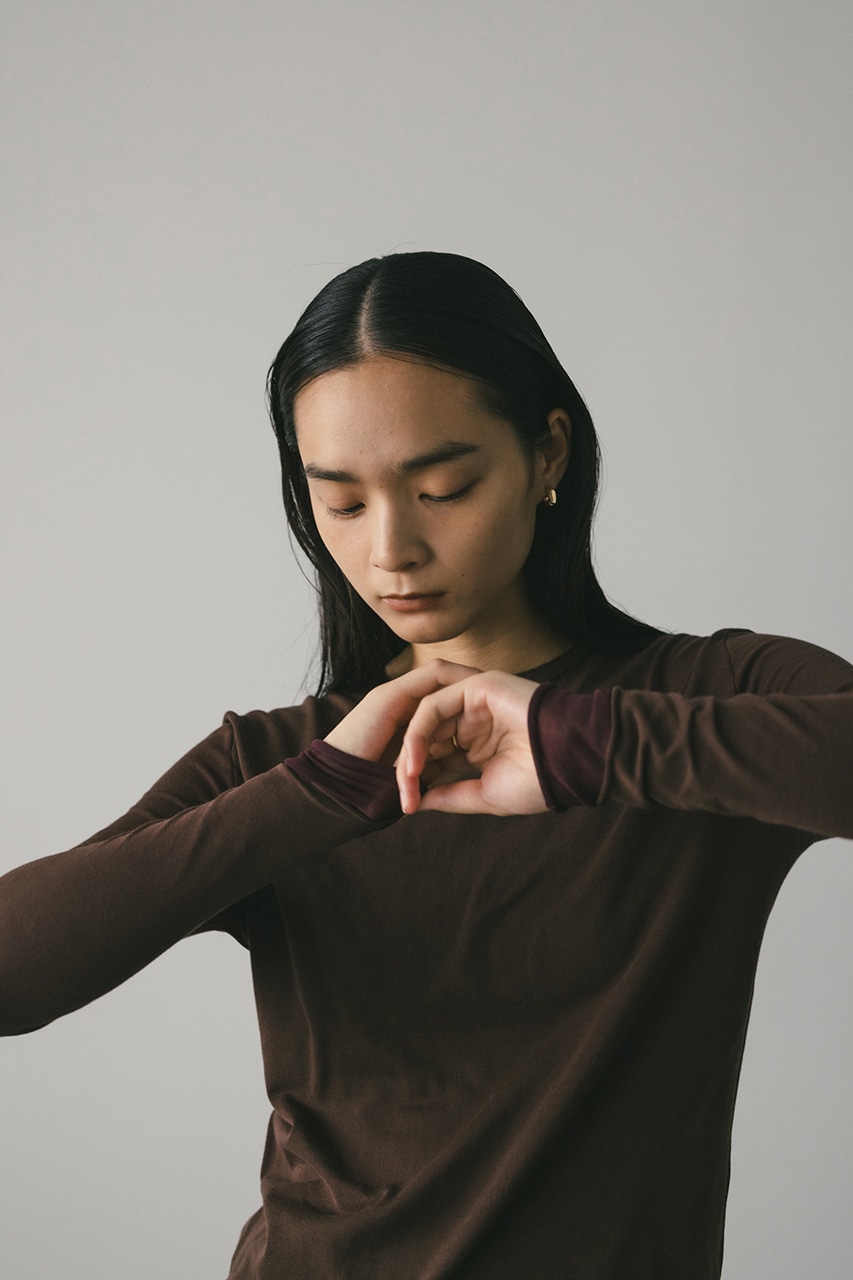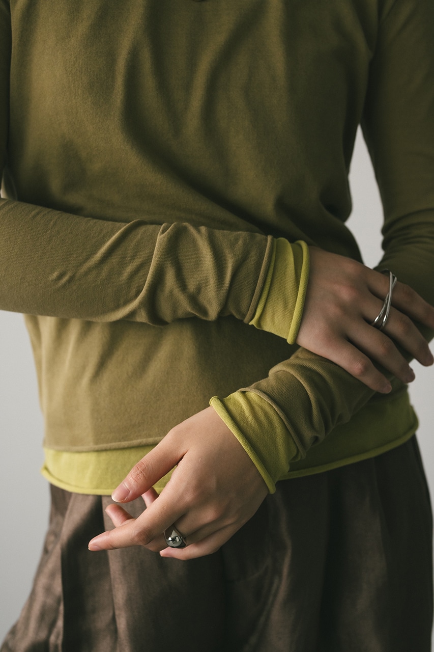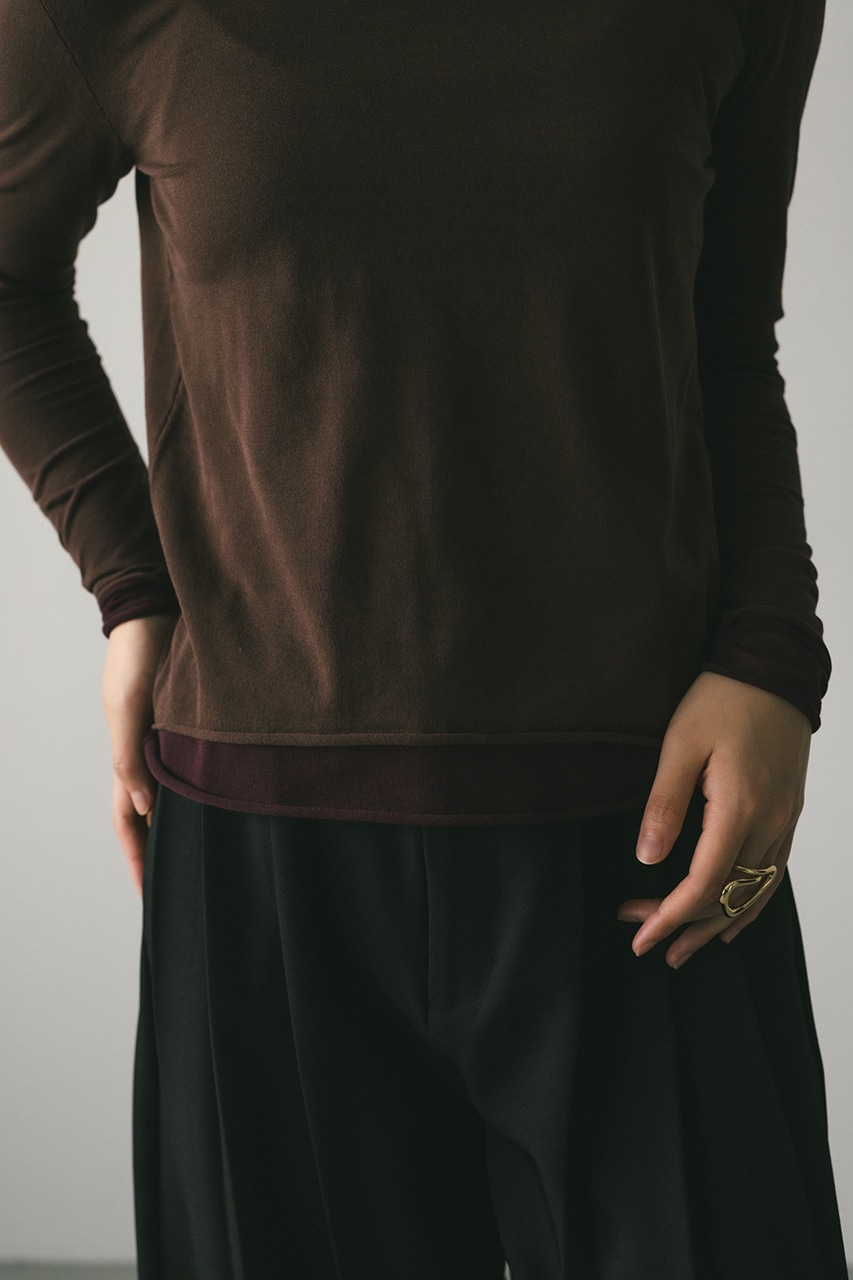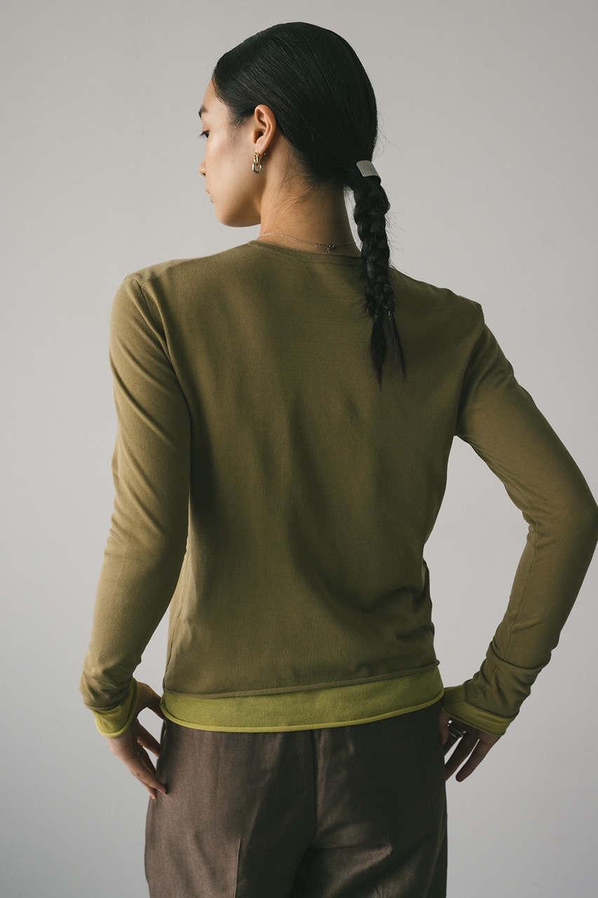 ほのかな透け感と袖口と裾のレイヤーデザインがスタイリングのポイントになる一枚です。