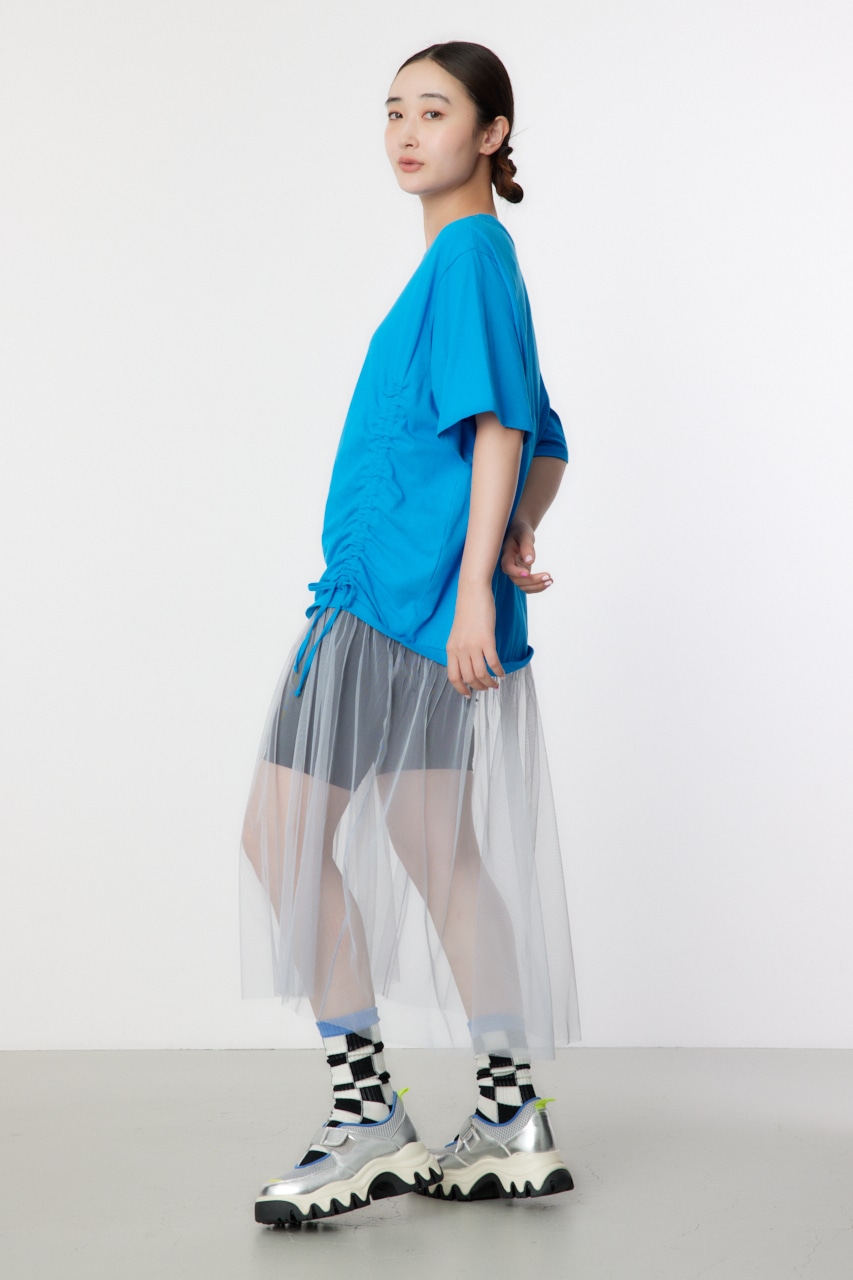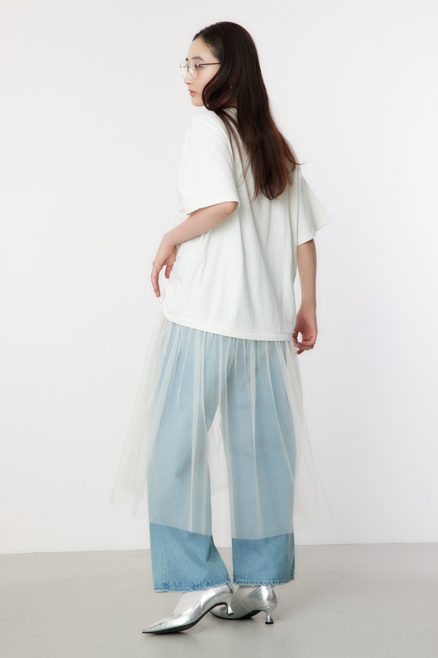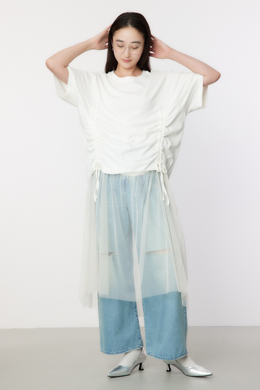 ギャザー仕様のビッグTシャツにチュールをドッキングしたデザインワンピース。Tシャツのギャザーを絞ると、前が上がり前後差があるようなサイズ感に。ボトムにはデニムを合わせるのがおすすめ。